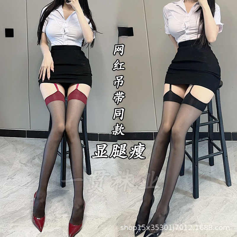 YH 오픈 파일 무료 실크 스타킹 섹시한 스트랩 원피스 양말 순수 레드 실크 스타킹 여성 콘트라스트 컬러 레드 에지 블랙 실크 롱 튜브 얇은