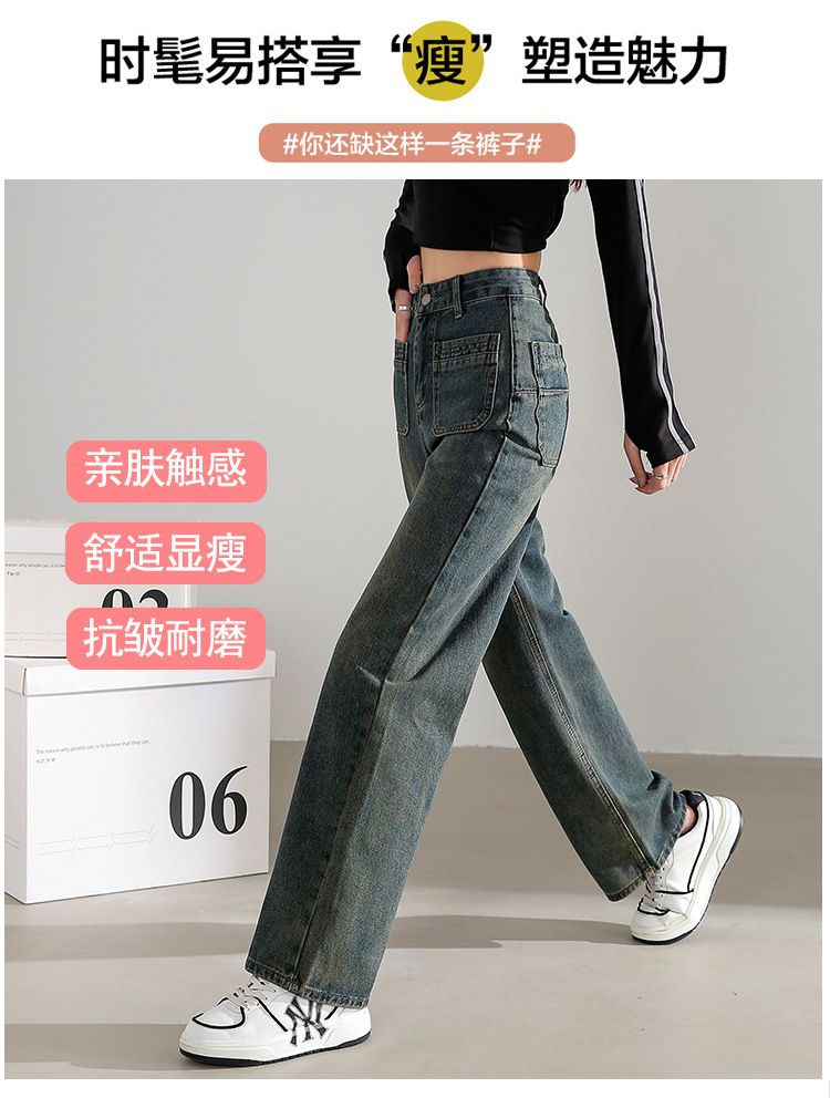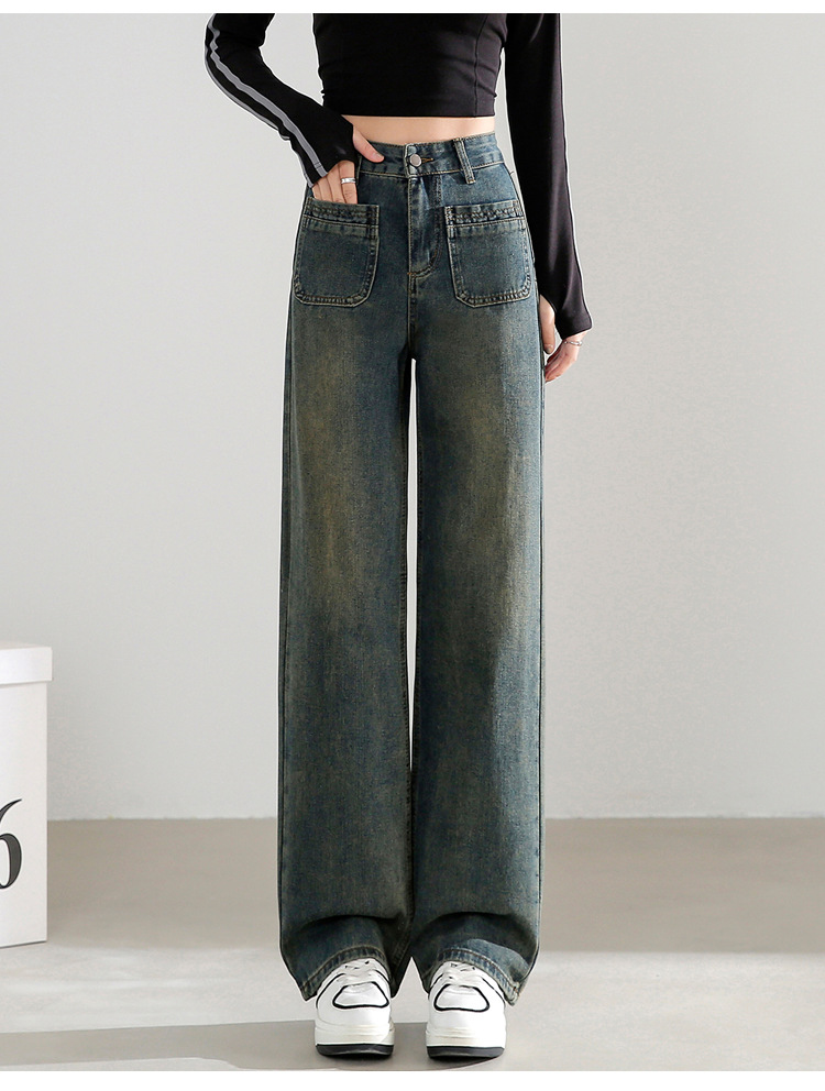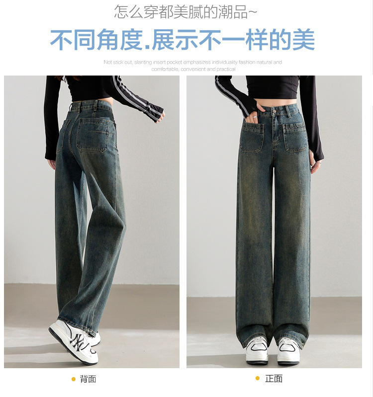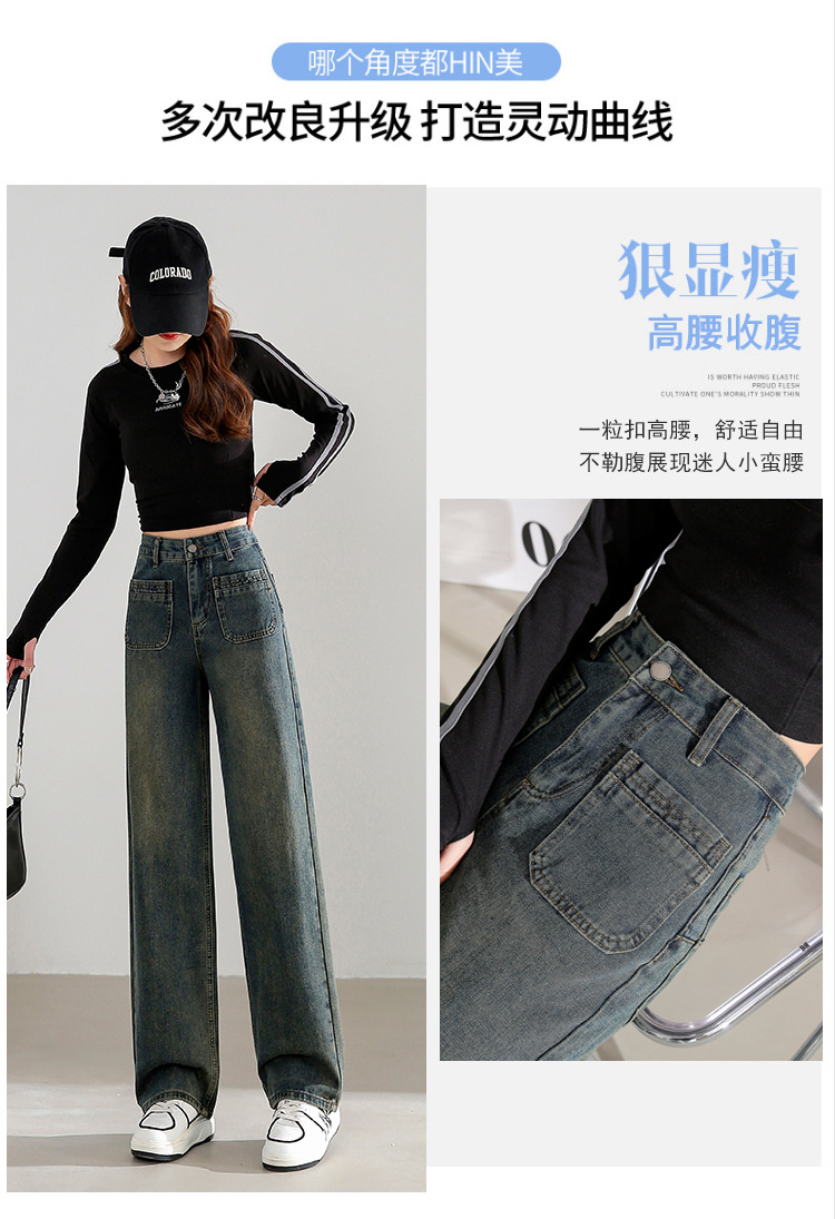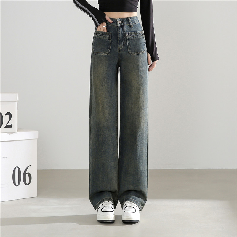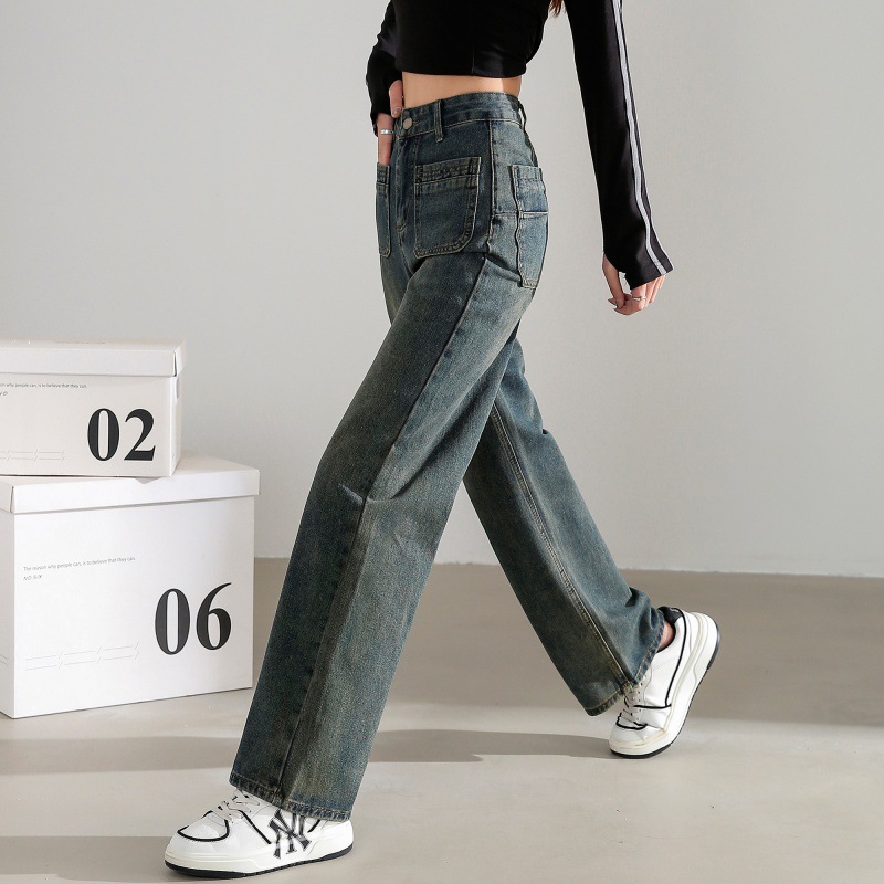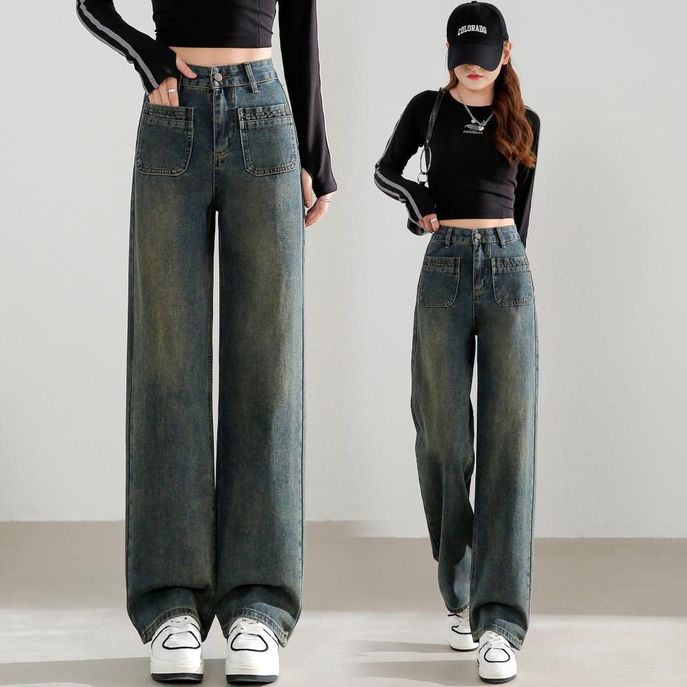 실제 촬영 2024 봄 가을과 겨울 작은 폭발 느슨한 넓은 다리 바지 바지 시멘트 재 스트레이트 청바지 여성스토어 가기