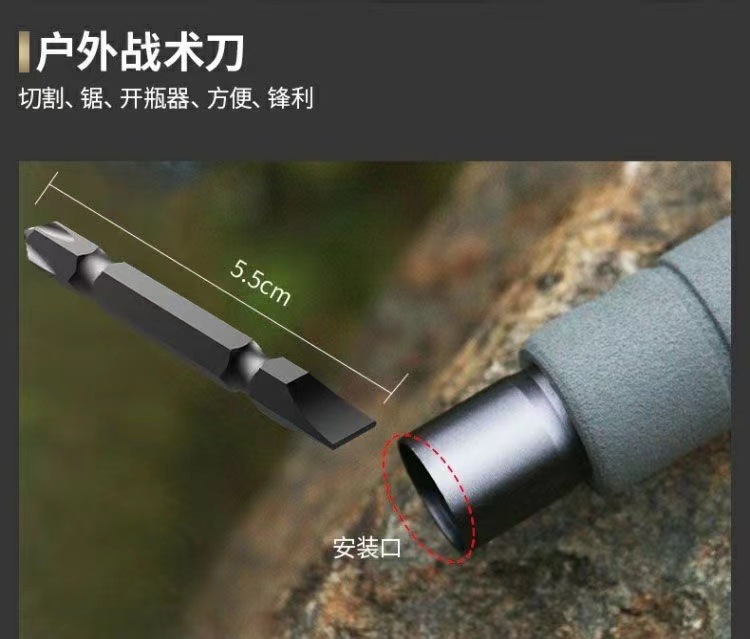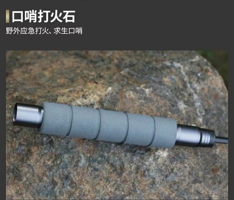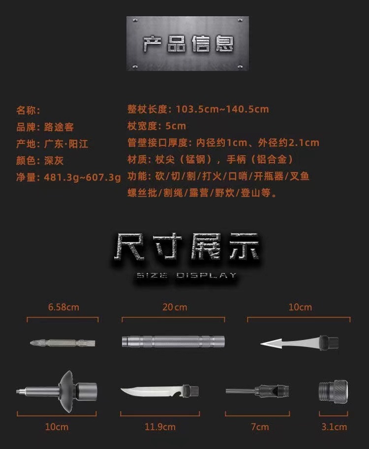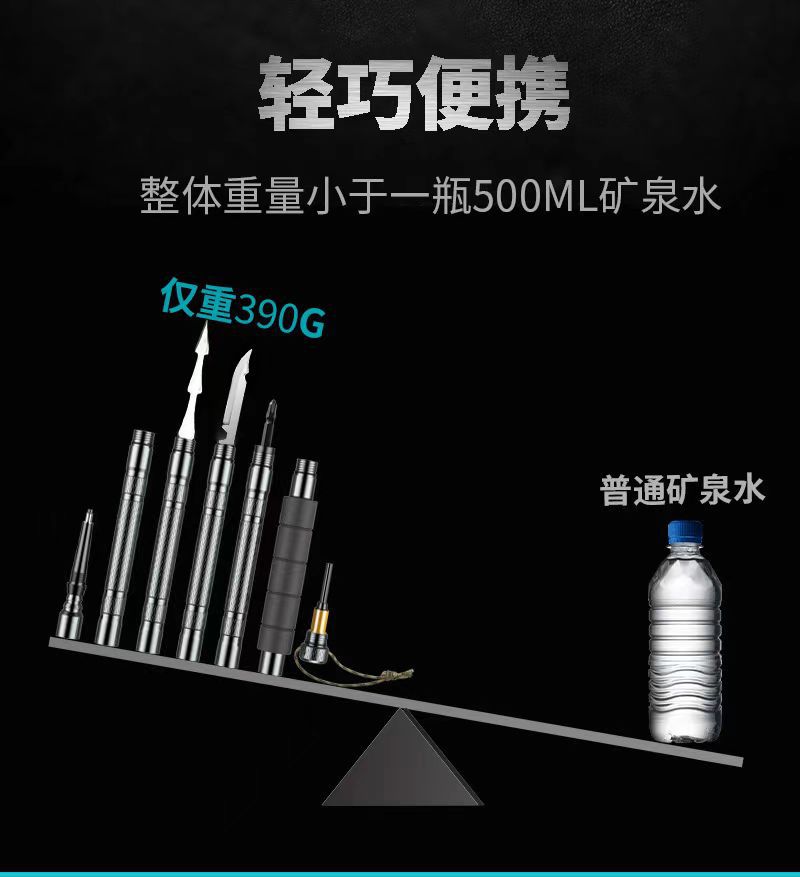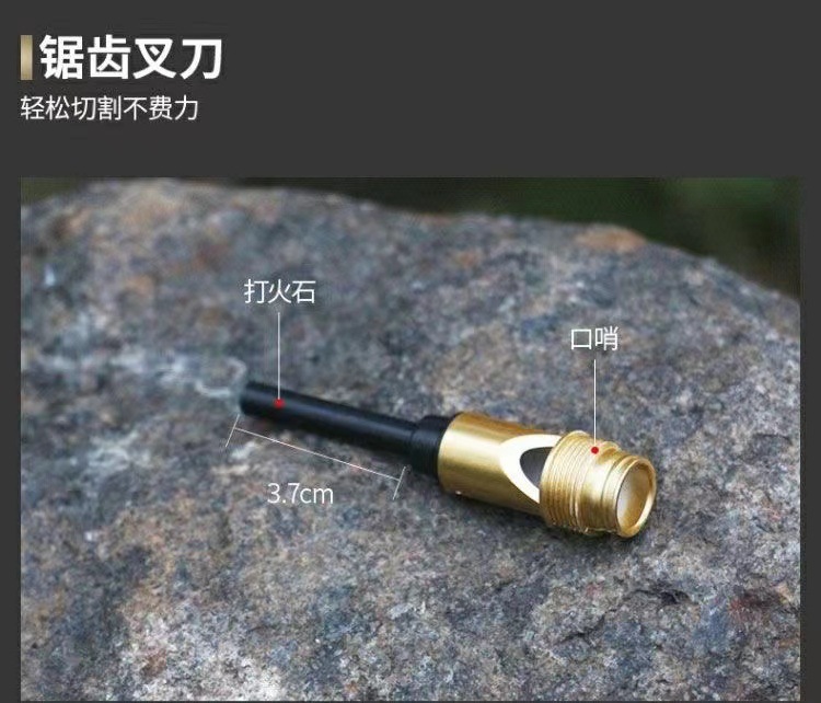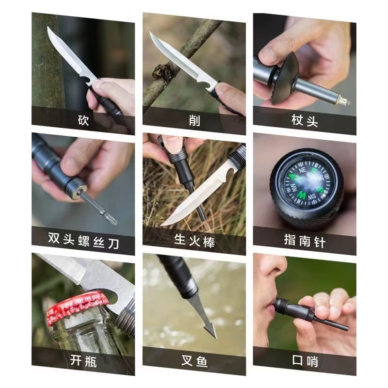 产品配件:小刀,螺丝刀,指南针,鱼叉,口哨,打火石,收纳袋,绳子