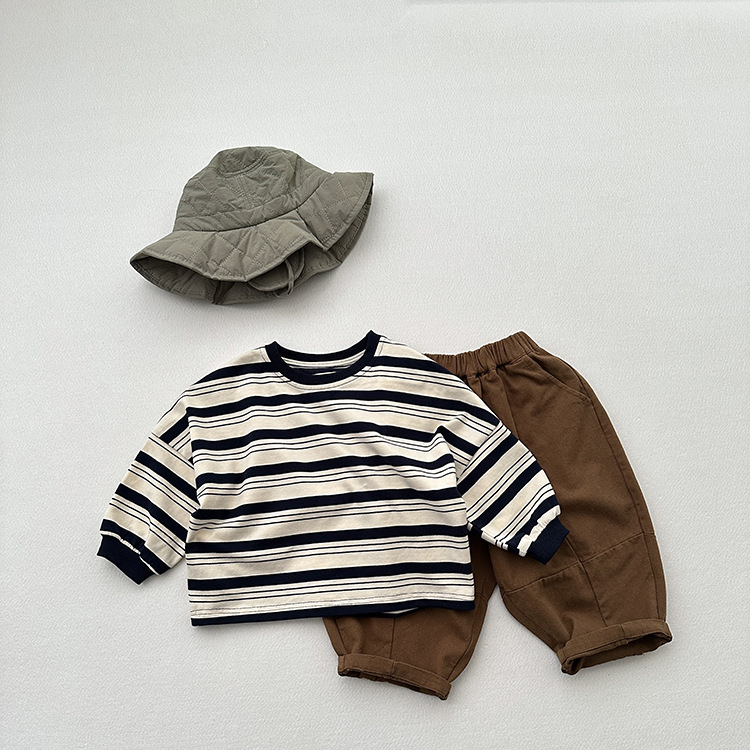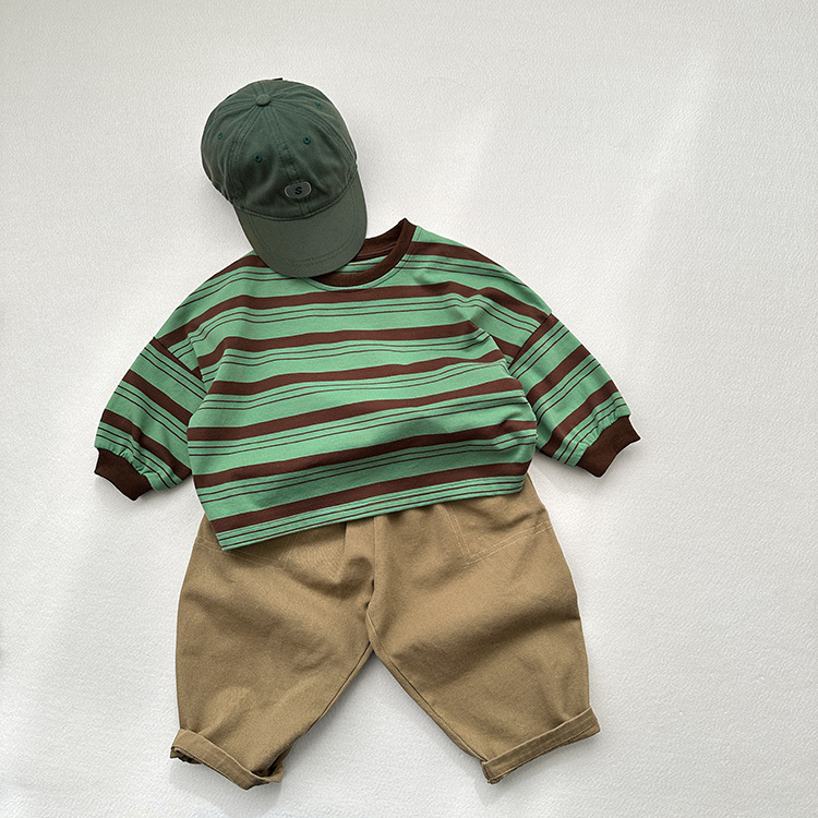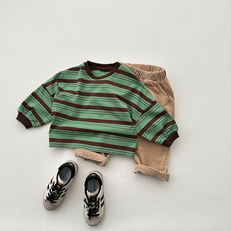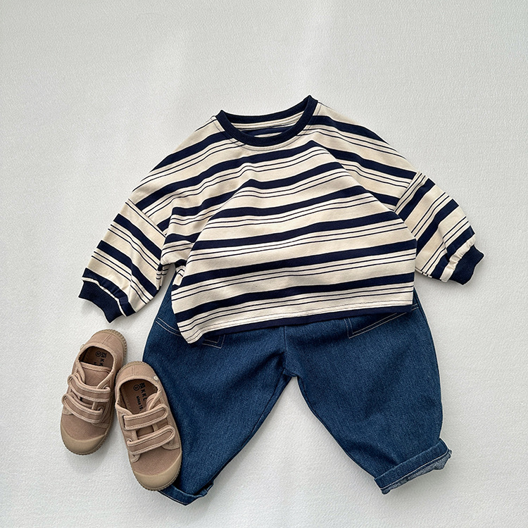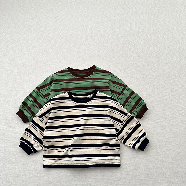 봄과 가을 새로운 한국 스타일 어린이 스트라이프 탑 느슨한 스웨터 남성과 여성의 아기 복고풍 드롭 어깨 긴 소매 티셔츠