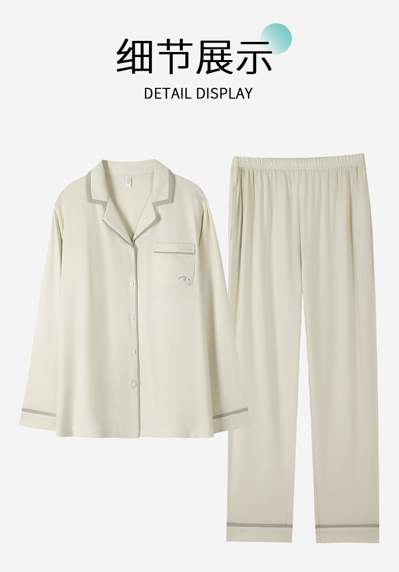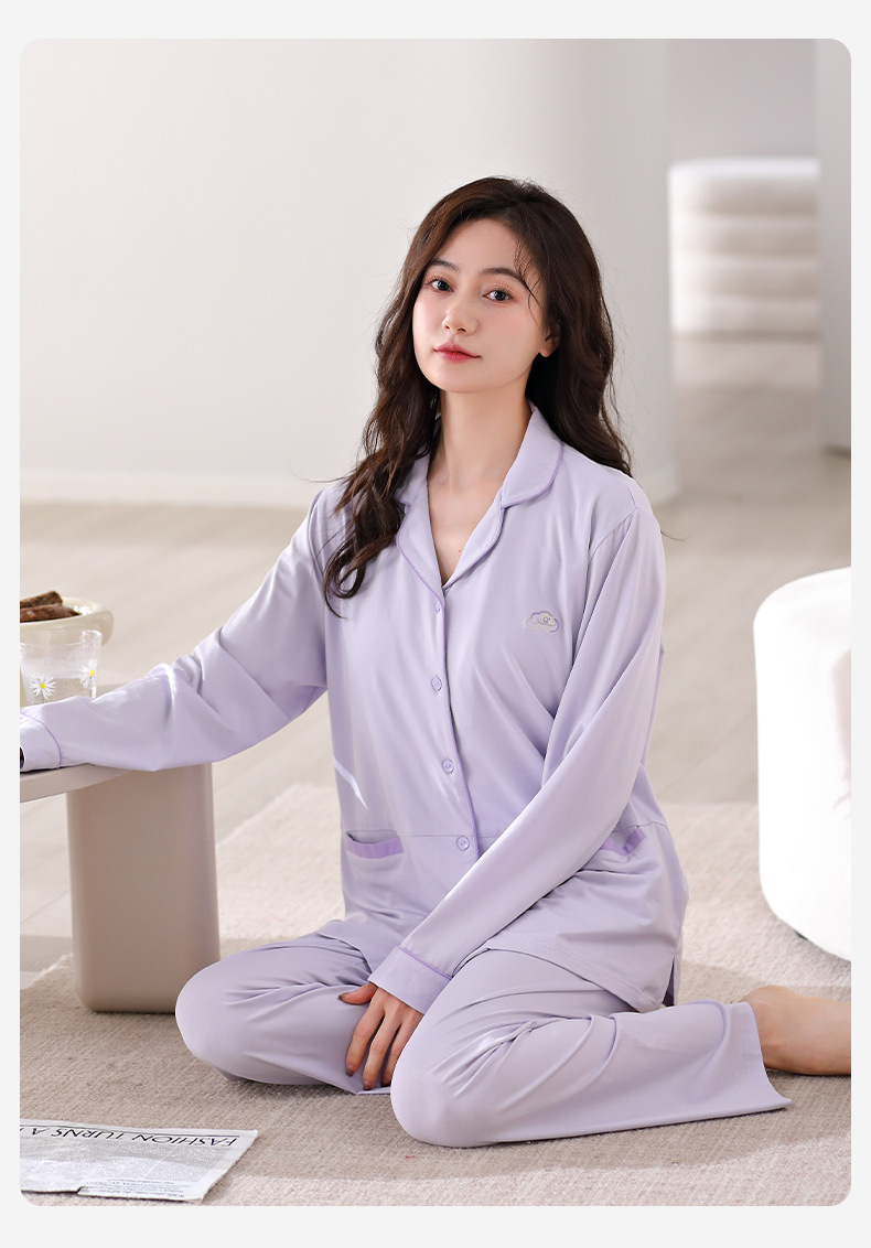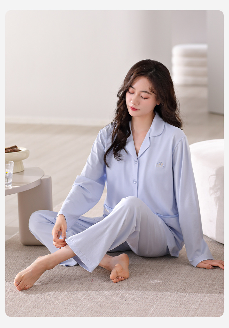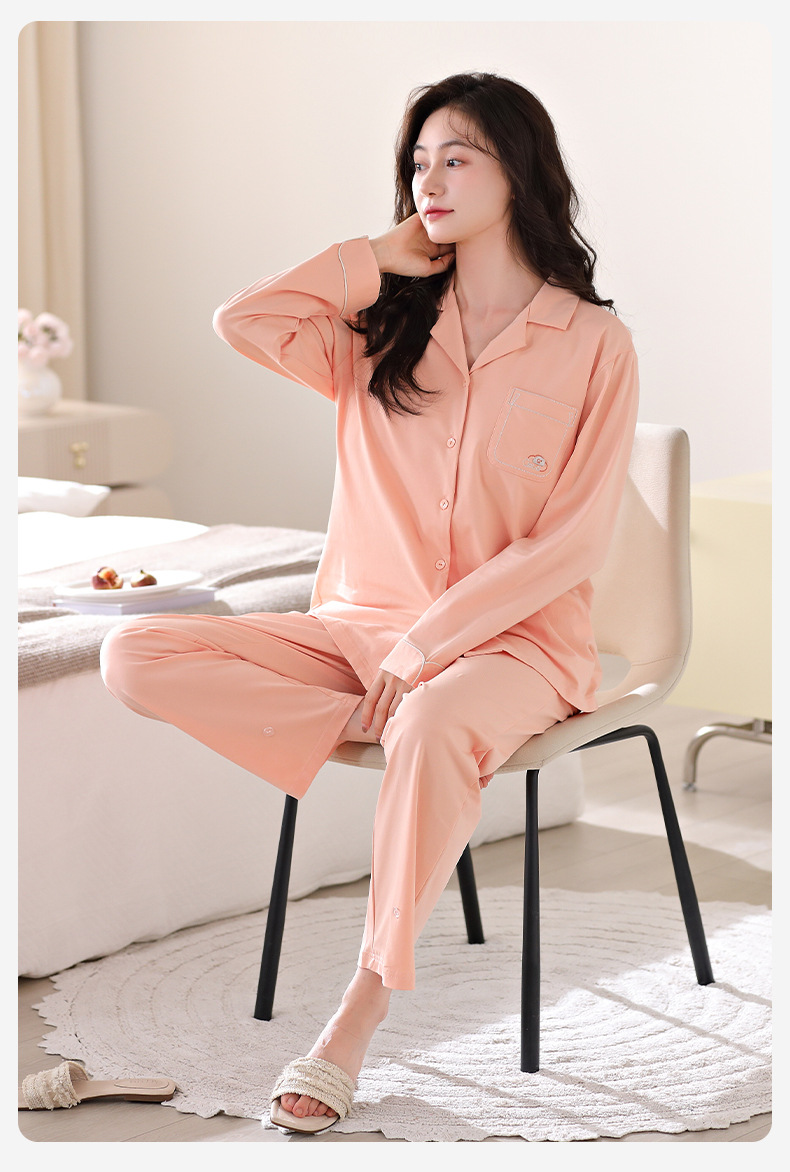 가슴 패드가 달린 여성 잠옷 봄과 가을면 긴팔 바지 옷깃 카디건 2024 새로운 야외 홈웨어 세트스토어 가기