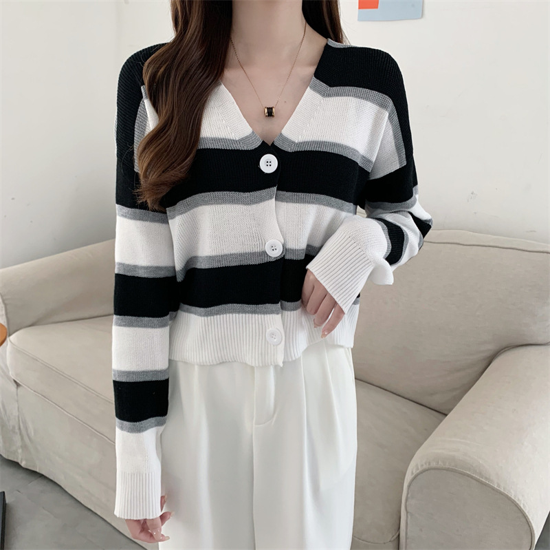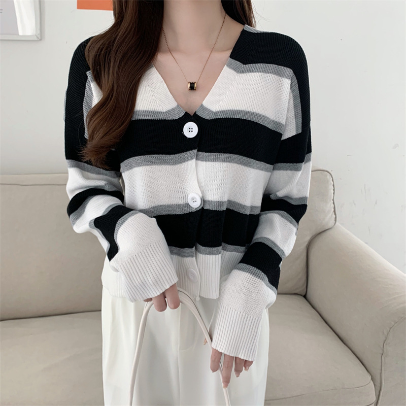 순수한 욕망 스타일 뜨거운 소녀 대비 색상 줄무늬 니트 카디건 2024 봄 새로운 느슨한 슬리밍 다용도 짧은 탑