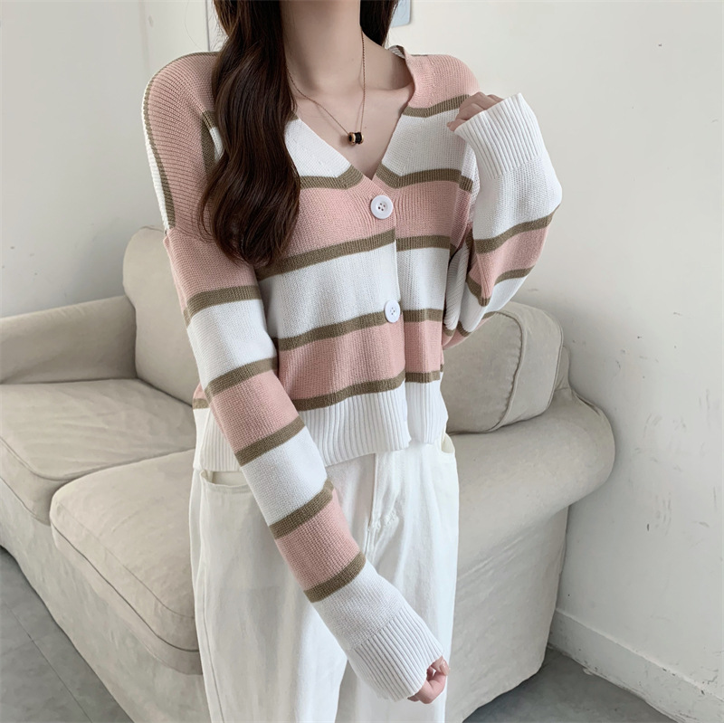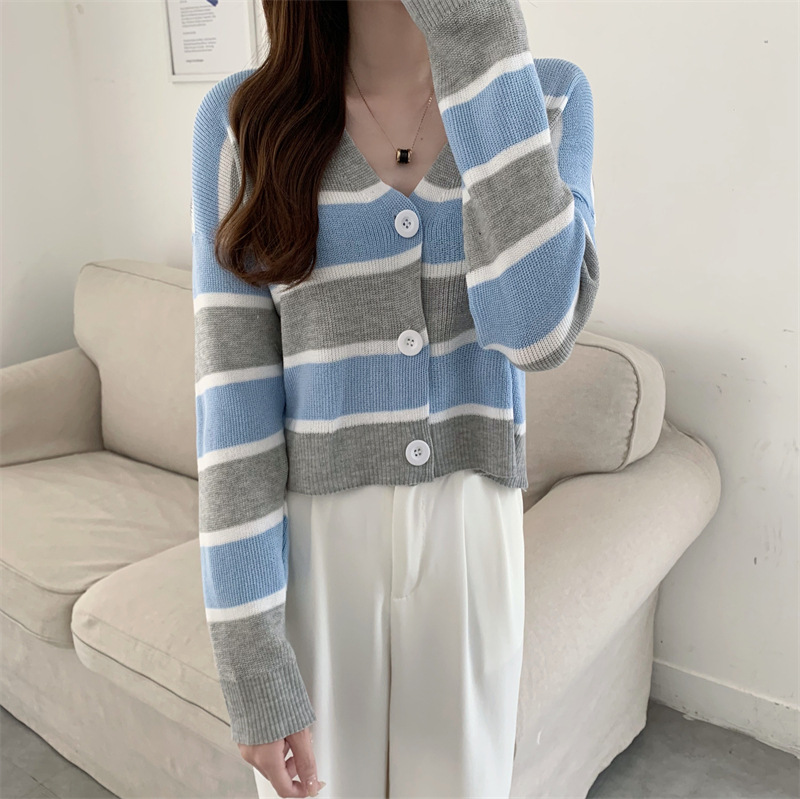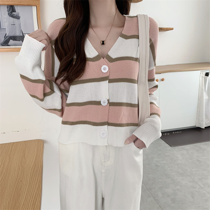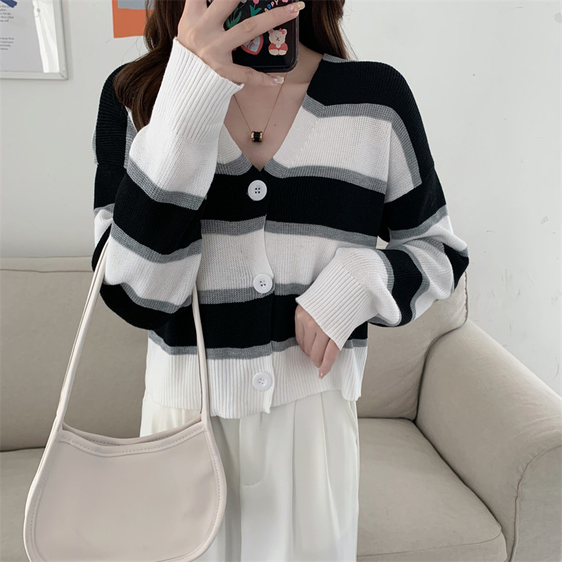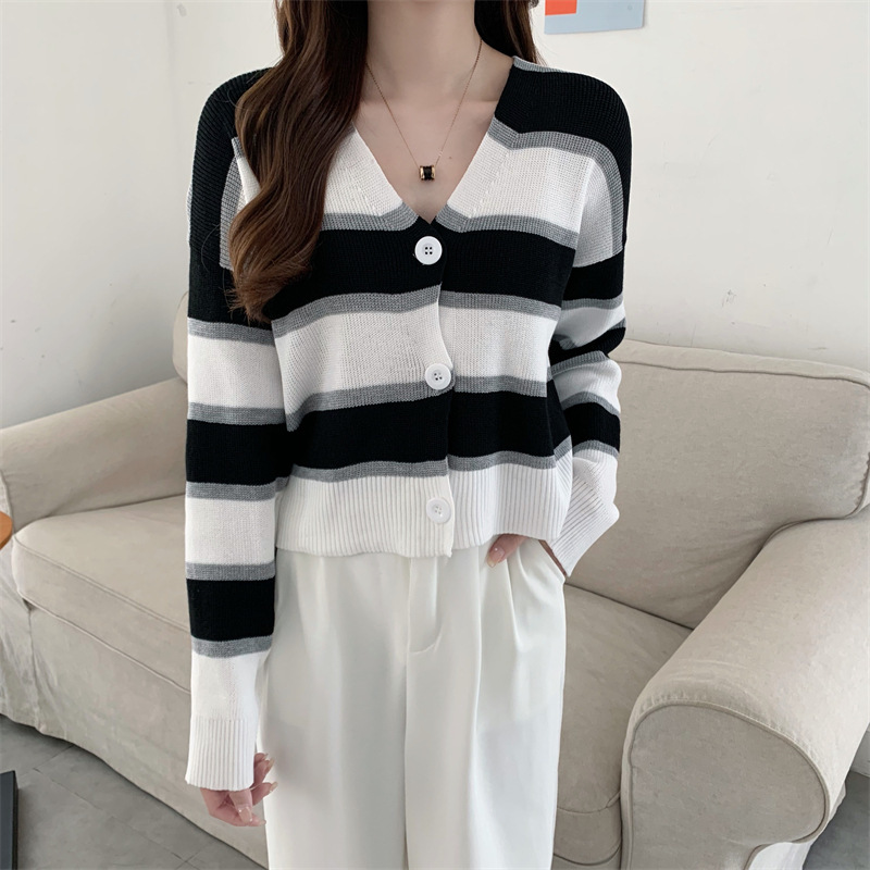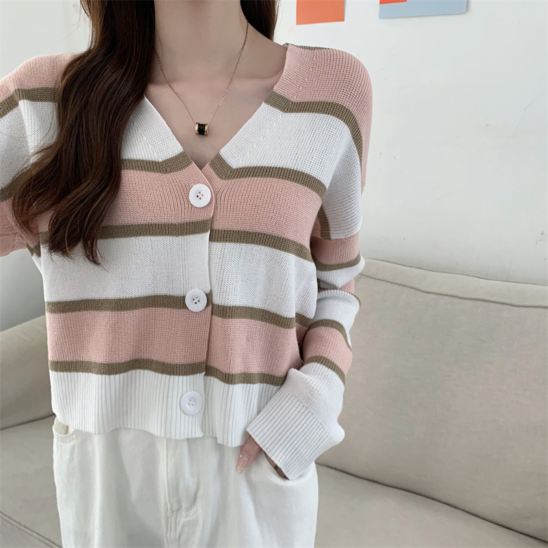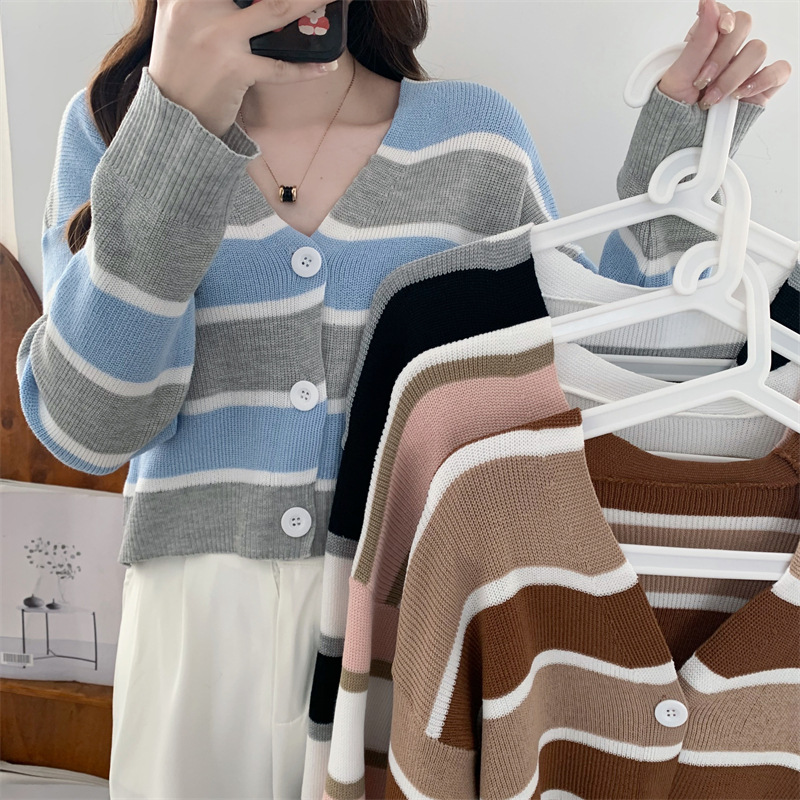 순수한 욕망 스타일 뜨거운 소녀 대비 색상 줄무늬 니트 카디건 2024 봄 새로운 느슨한 슬리밍 다용도 짧은 탑스토어 가기