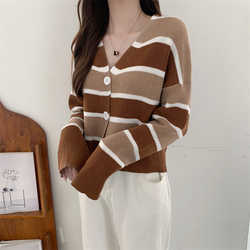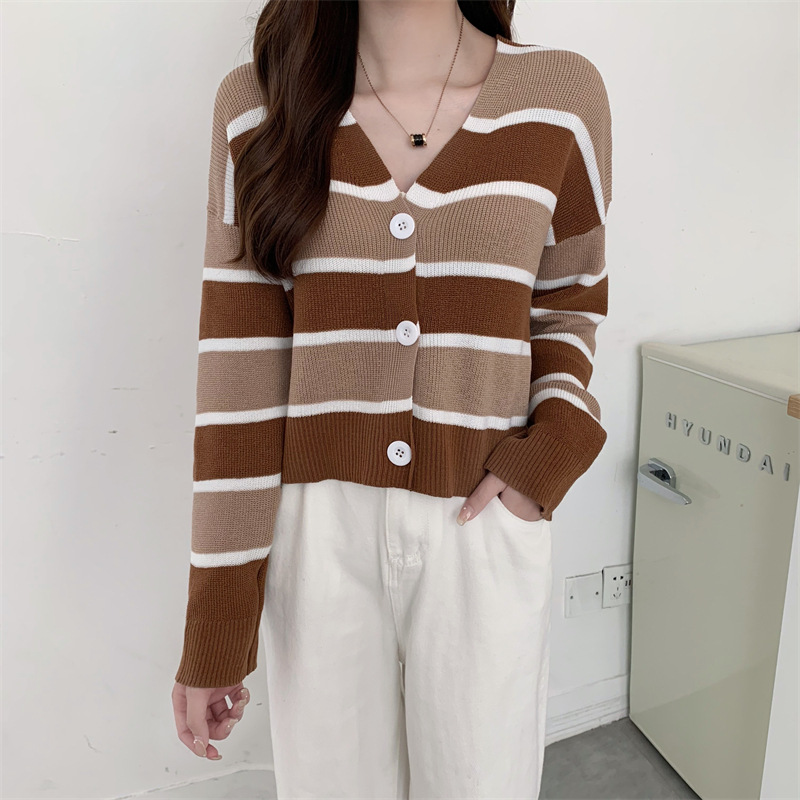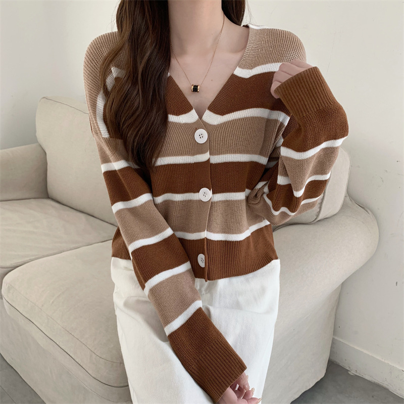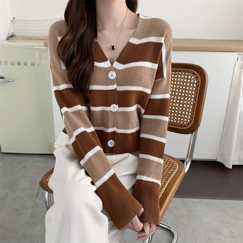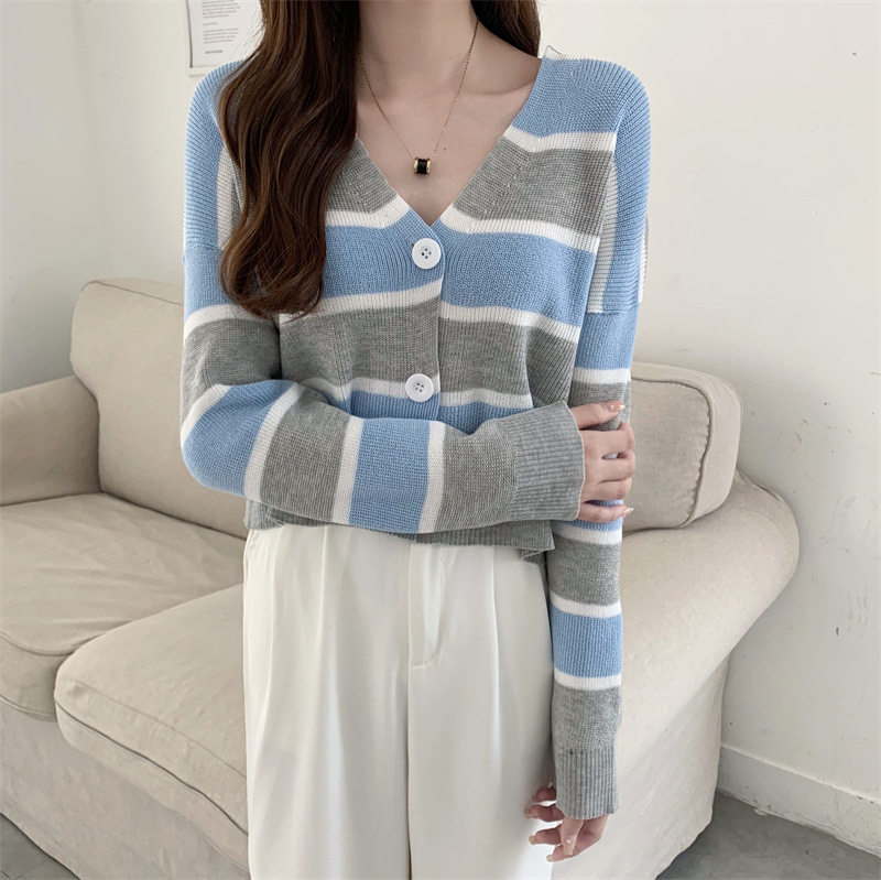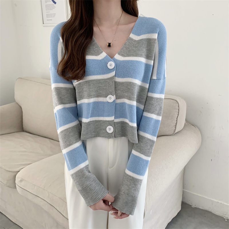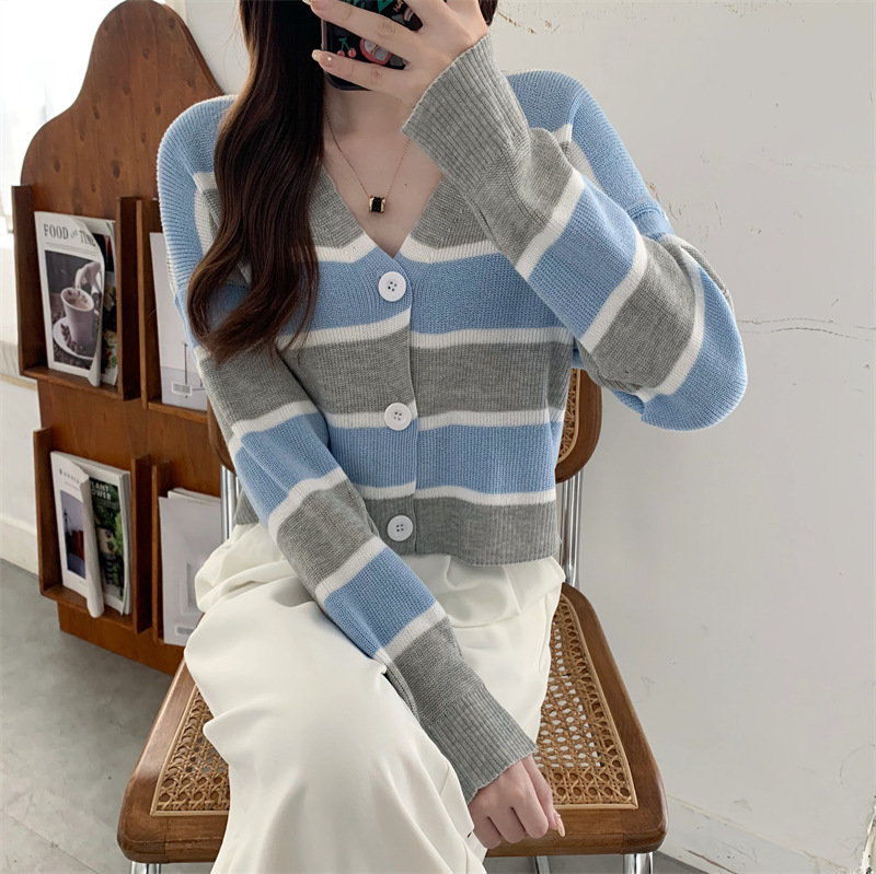 순수한 욕망 스타일 뜨거운 소녀 대비 색상 줄무늬 니트 카디건 2024 봄 새로운 느슨한 슬리밍 다용도 짧은 탑스토어 가기