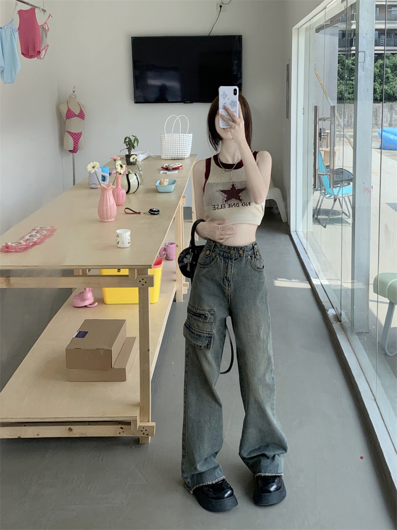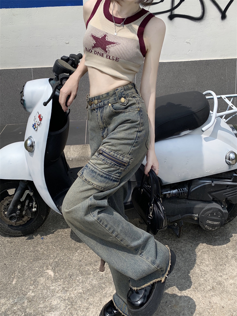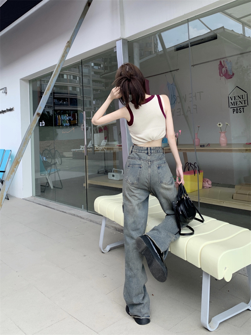 홍콩 스타일 괴로워하는 닳은 청바지 여성의 봄과 가을 느슨한 스트레이트 와이드 레그 바지 틈새 세척 패션 브랜드 걸레 바지스토어 가기