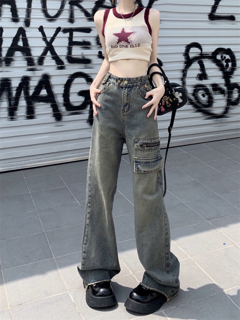 홍콩 스타일 괴로워하는 닳은 청바지 여성의 봄과 가을 느슨한 스트레이트 와이드 레그 바지 틈새 세척 패션 브랜드 걸레 바지
