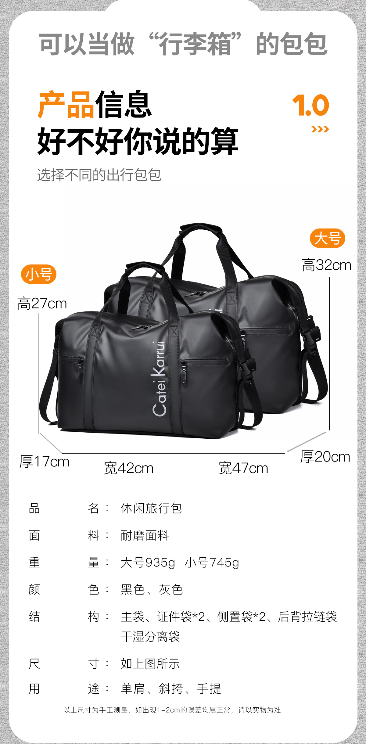 CateiKarrui 남성 여행 가방 대용량 수하물 가방 여행 가방 방수 내마모성 핸드백 여행 가방