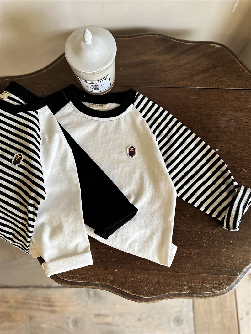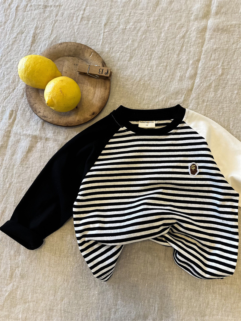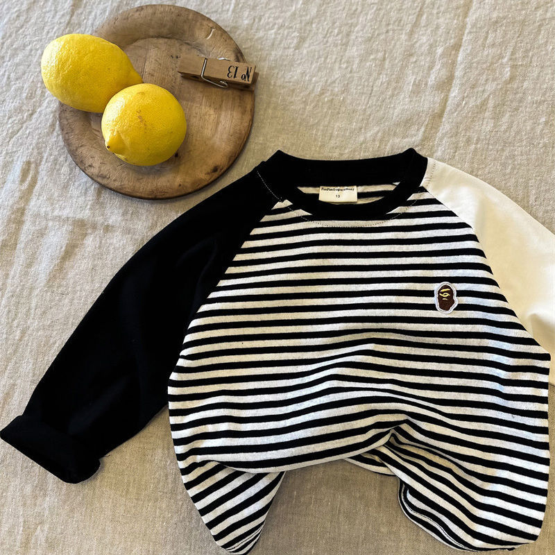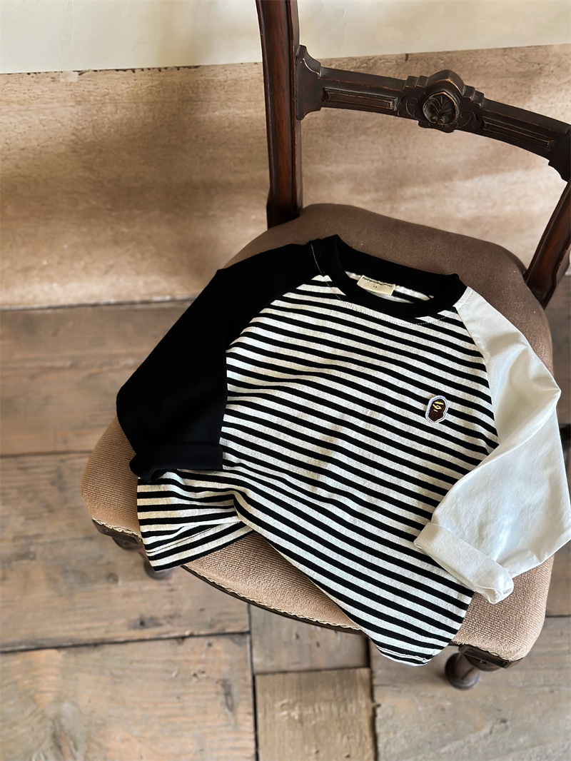 어린이 줄무늬 티셔츠 소년 봄 2024 새로운 탑 라글란 소매 유행 아기 긴 소매베이스 셔츠 여성용 면화스토어 가기