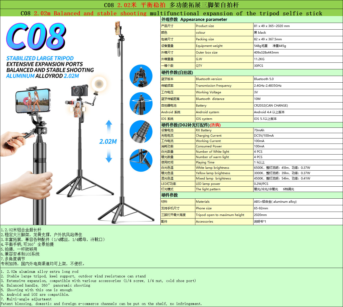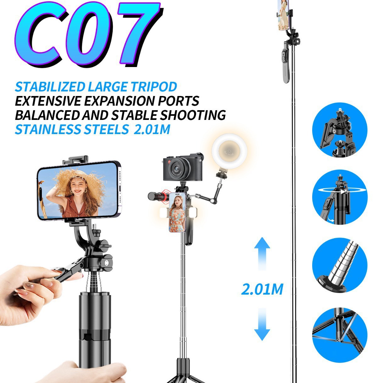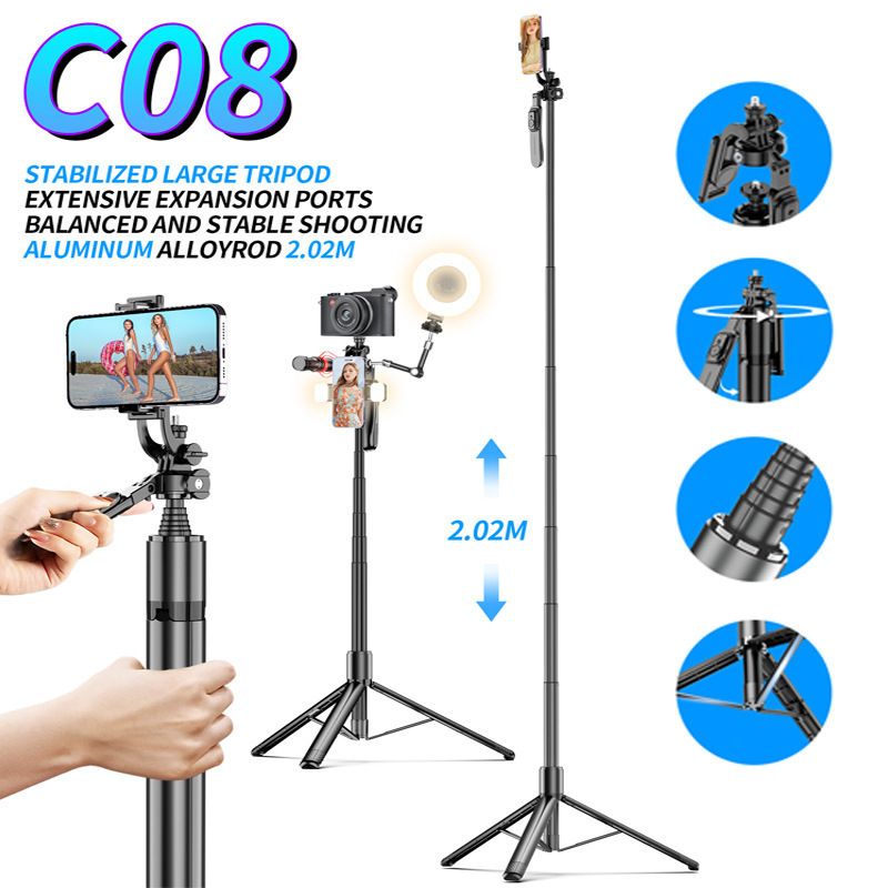 2 m 휴대 전화 블루투스 셀카 스틱 C08 휴대용 물리적 안티 쉐이크 안정제 야외 라이브 사진 바닥 삼각대