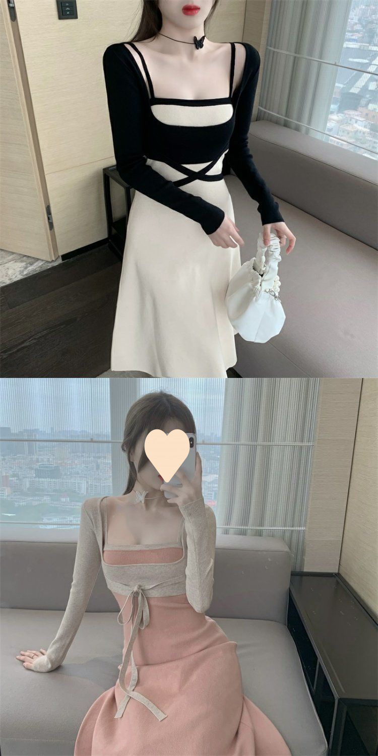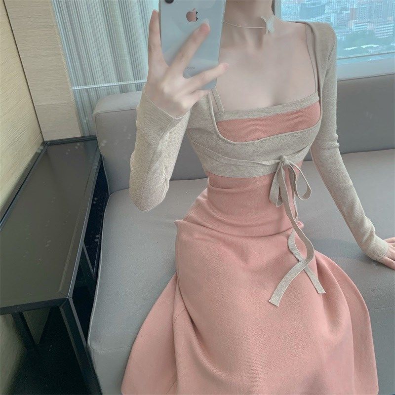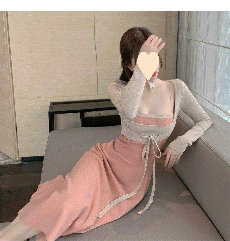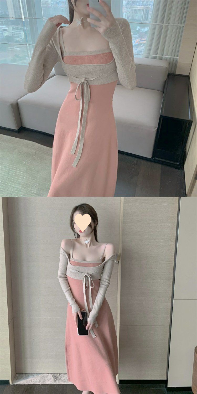 가을과 겨울 2023 새로운 여성 핑크 향기로운 스타일 세트 가벼운 럭셔리 사교계 우아한 슬링 니트 원피스스토어 가기