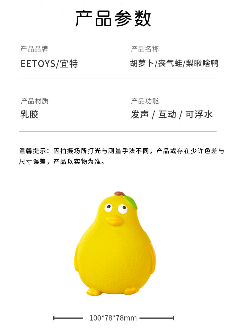 【品名】:宜特发声玩具-(胡萝卜/丧气蛙/梨瞅啥鸭)