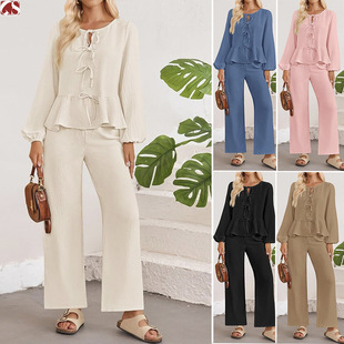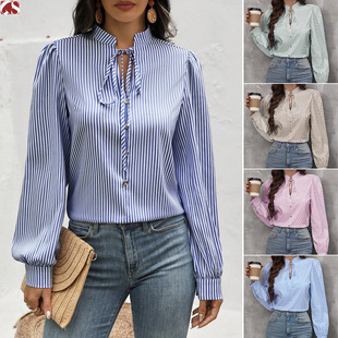 2024亚马逊跨境女式套装长袖V领系带蝴蝶结上衣阔腿裤休闲套装女   2024亚马逊新款女装跨境欧美半开领系带套头长袖气质通勤条纹衬衫   欧美外贸亚马逊女装优雅女装V领打揽灯笼袖气质通勤女式纯色衬衫   现货 2024春夏外贸跨境V领套头豹纹衬衫印花长袖衬衣通勤女式衬衫