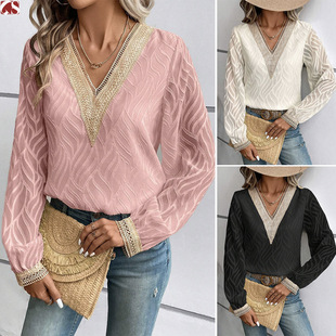现货 2024欧美早春新款跨境女装V领套头条纹印花长袖休闲女士衬衫   2024欧美亚马逊temu跨境女装秋冬新款衬衫女气质通勤长袖上衣女   2024年秋季欧美跨境女装独立站V领蕾丝雪纺提花长袖气质优雅衬衫   2024秋季亚马逊独立站欧美女装镂空蕾丝衫V领宽松套头气质长袖衫