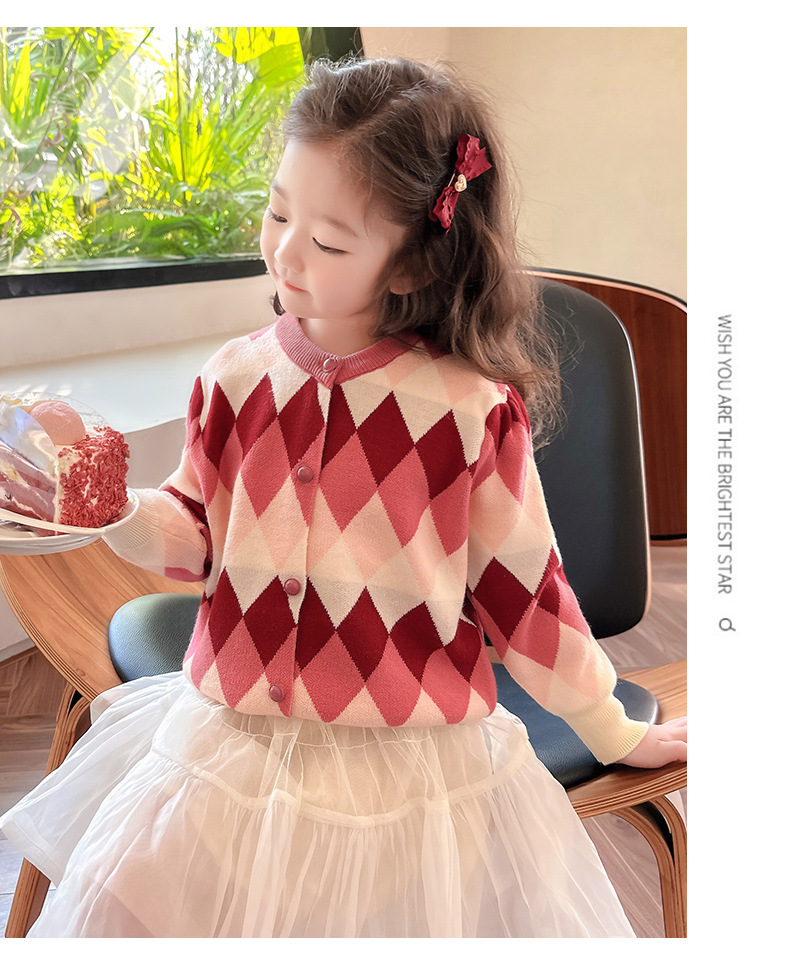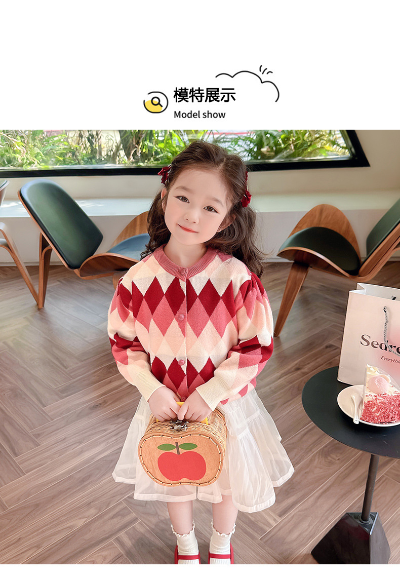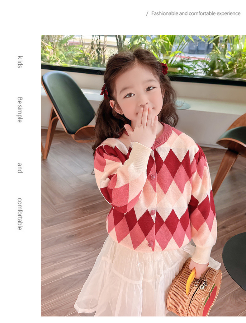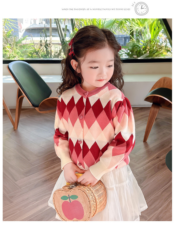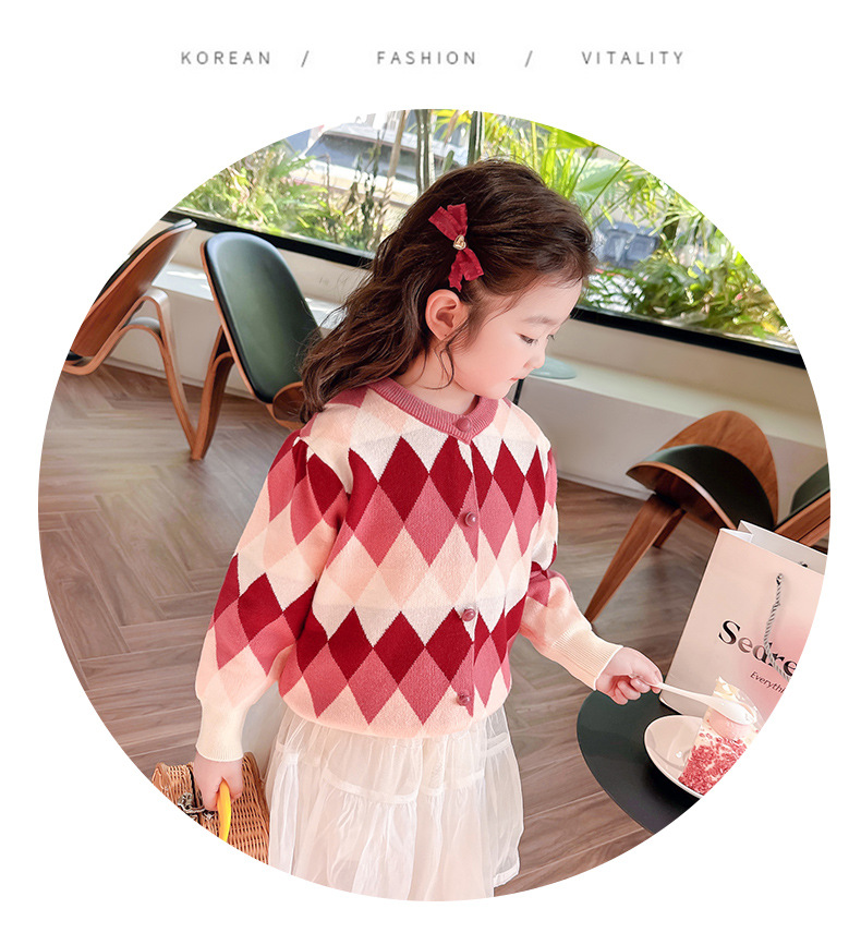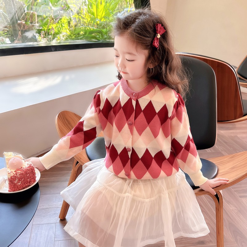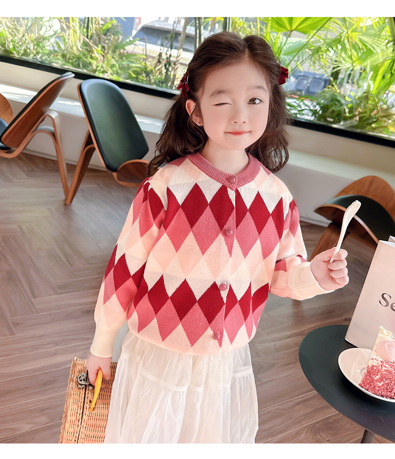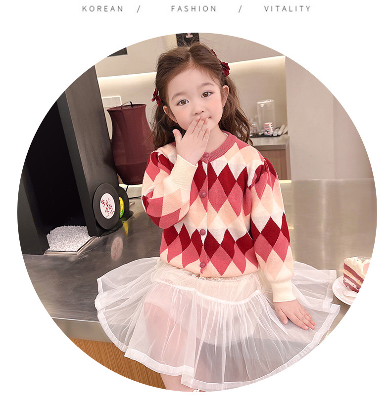 아기 소녀의 다이아몬드 격자 무늬 스웨터 카디건 2024 봄 새 아기 소녀의 세련된 올 매치 니트 코트 유행스토어 가기
