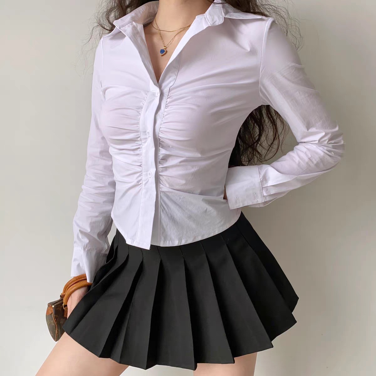 순수한 욕망 스타일 주름 디자인 슬리밍 올 매치 타이트 허리 셔츠 여성 톱 2023 가을 새로운 도착 시계 기계 세련된 셔츠스토어 가기