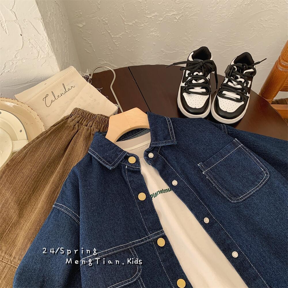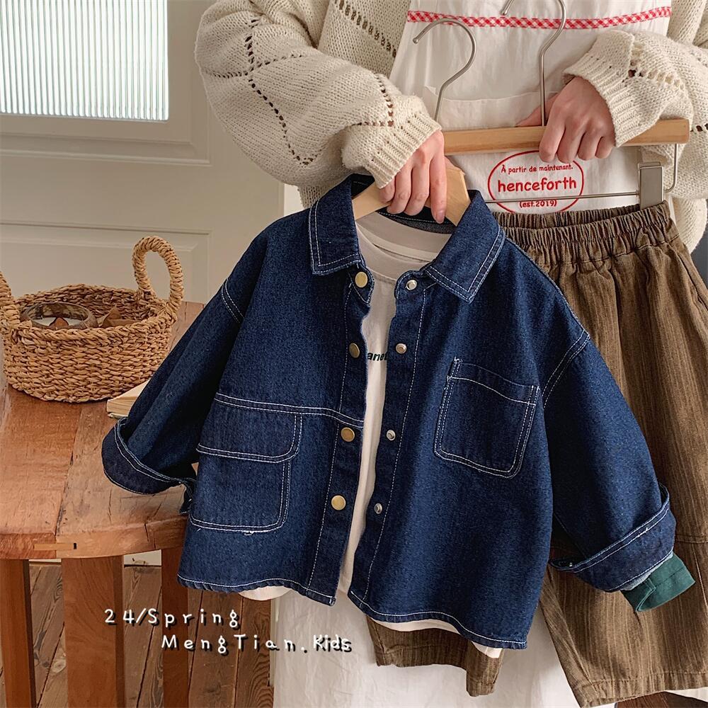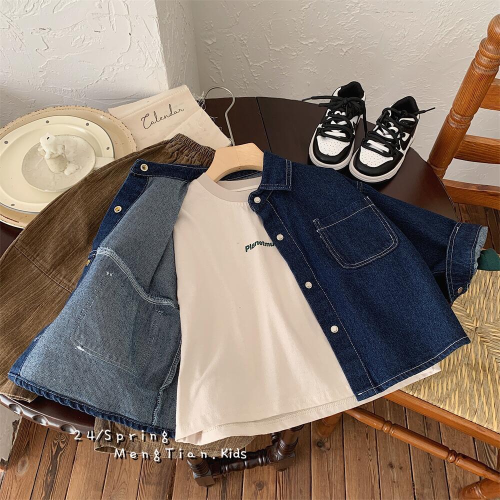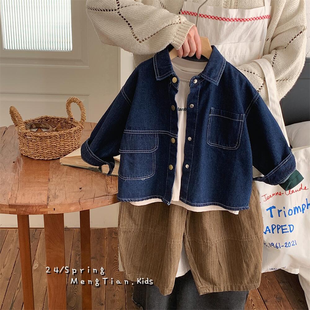 2024 년 어린이 의류 소년 면화 대조 컬러 한국 느슨한 데님 재킷 셔츠 스팟스토어 가기