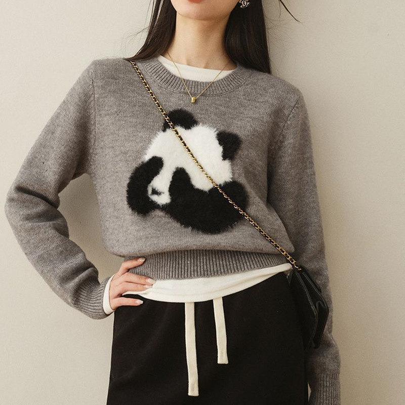 게으른 스타일의 부드러운 찹쌀 둥근 목 팬더 스웨터 2024 봄 여성을위한 새로운 느슨한 슬리밍 캐주얼 스웨터스토어 가기
