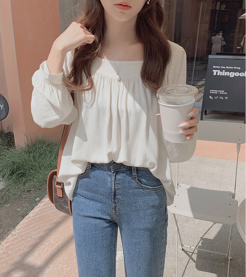 한국 스타일 틈새 새로운 긴 소매 느슨한 탑 새틴 셔츠 여성 디자인 감각 틈새 쉬폰 셔츠 디자인 감각스토어 가기