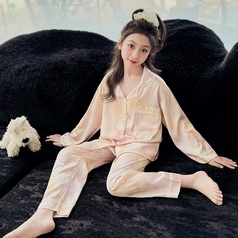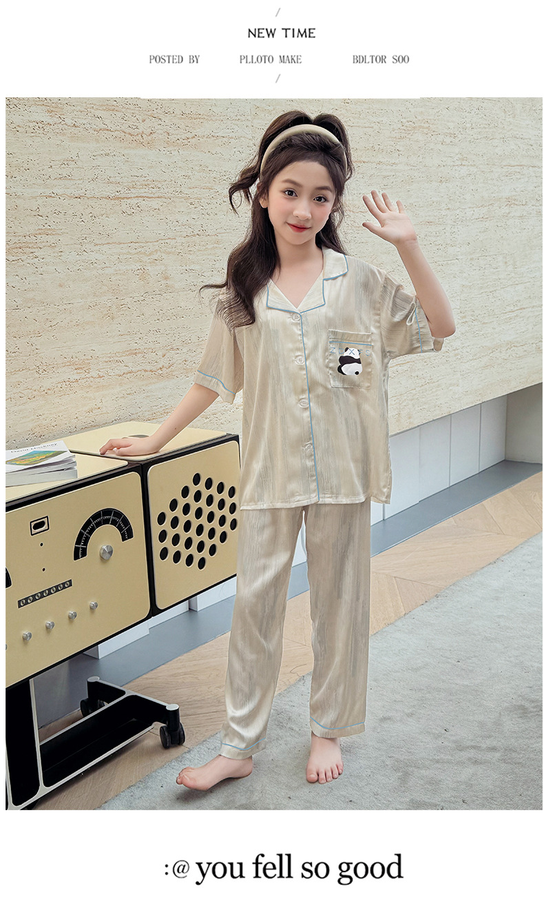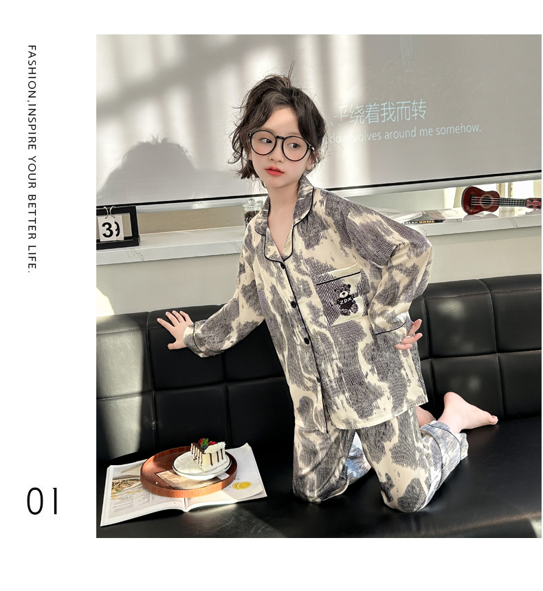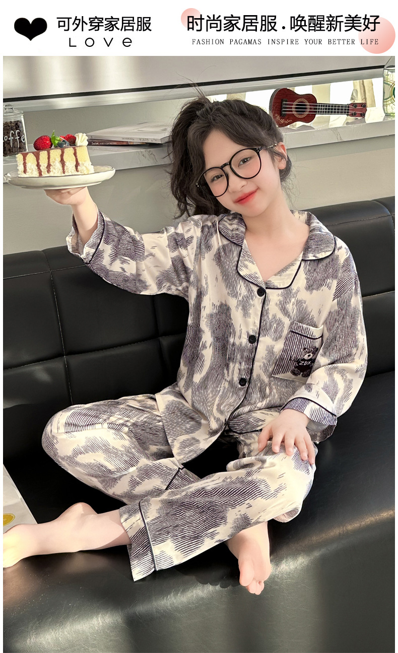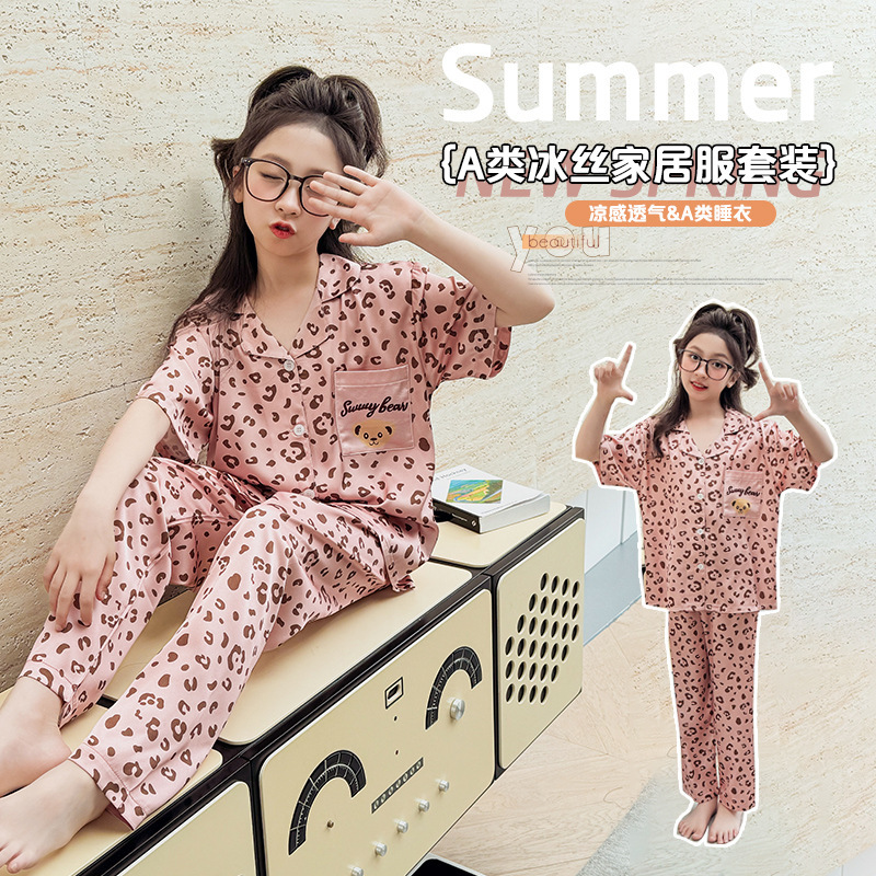 2025년 여름 신상품 중대형 여아 홈웨어 레터 세트 A급 아동용 가디건 아이스 실크 잠옷