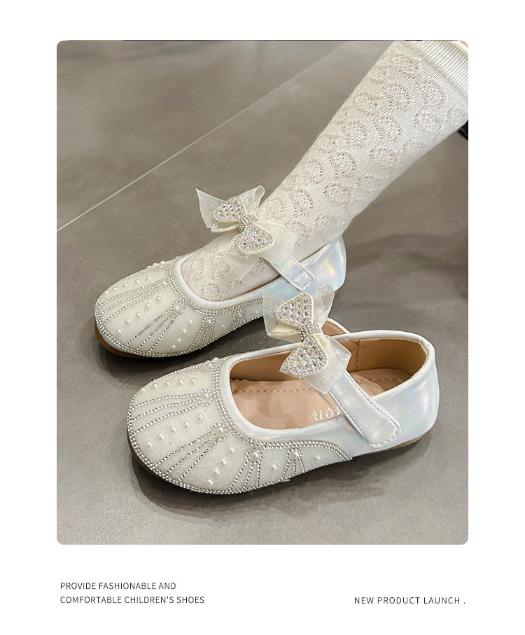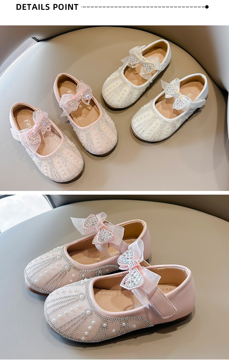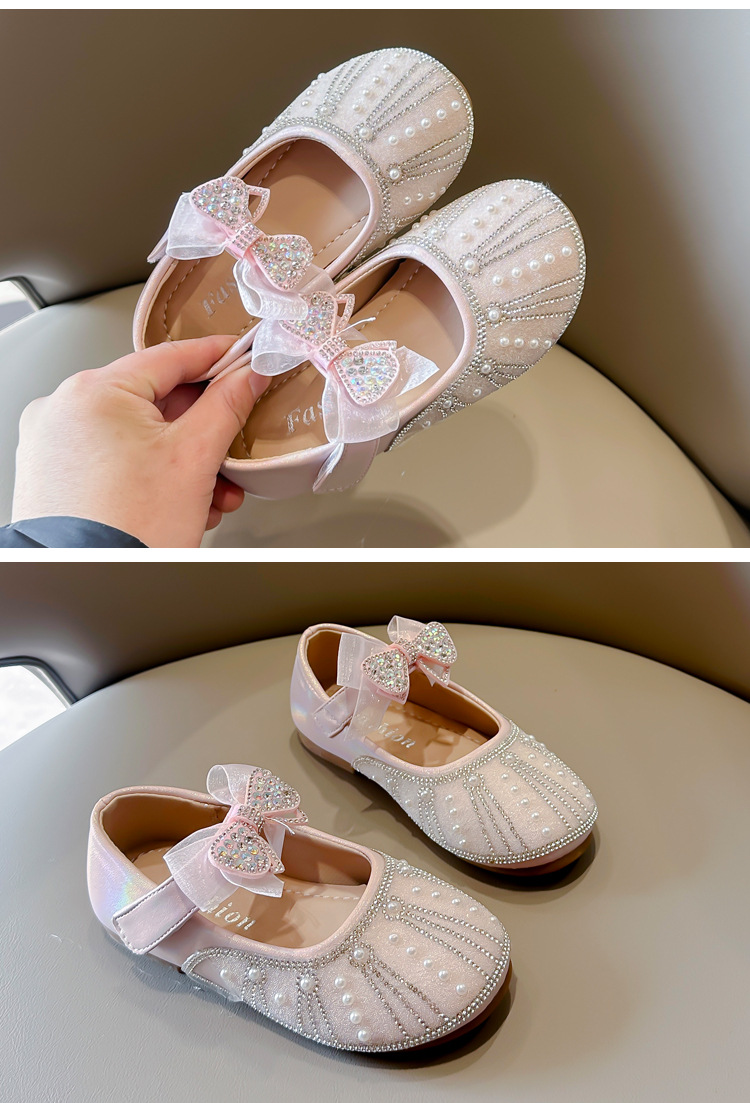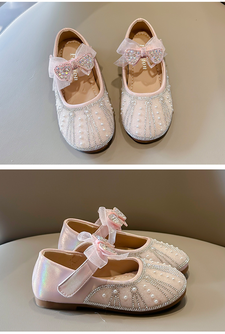 여아 크리스탈 공주 구두 2025 봄 여름 신상 아동용 진주 라인스톤 리본 공연용 얕은 굽 가죽 구두스토어 가기