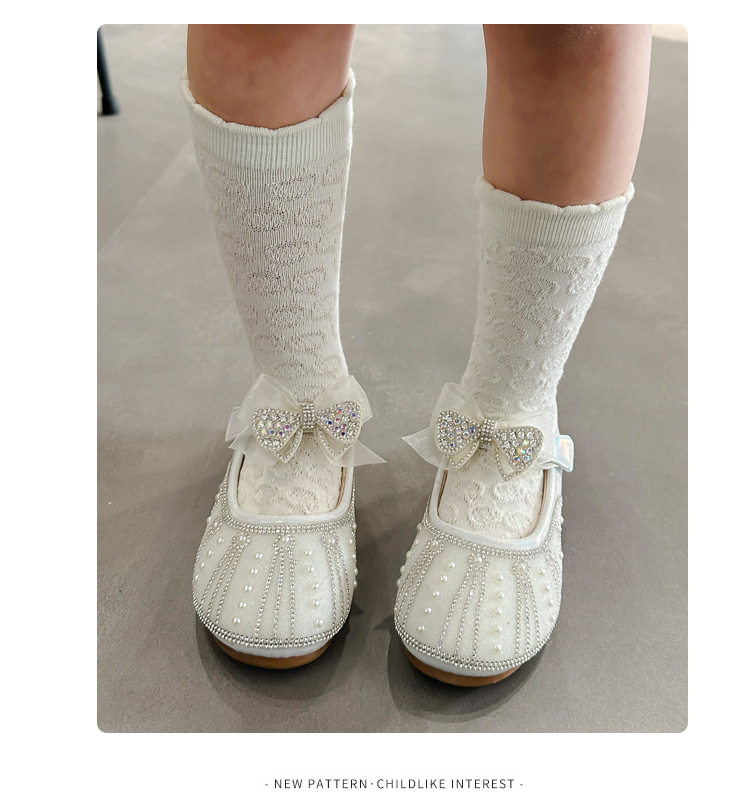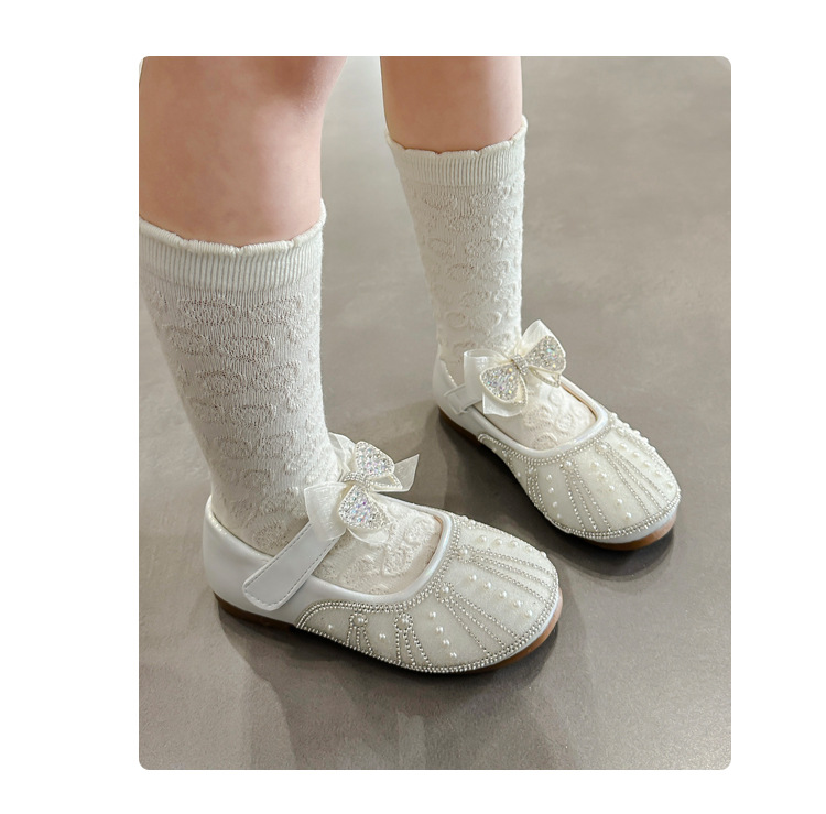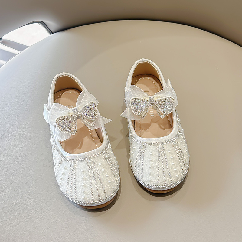 여아 크리스탈 공주 구두 2025 봄 여름 신상 아동용 진주 라인스톤 리본 공연용 얕은 굽 가죽 구두