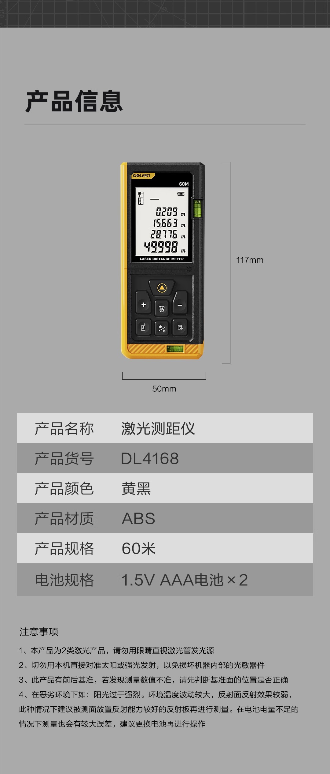 • 빨간색 레이저는 실외 사용에 적합하지 않으며, 실외에서는 녹색 레이저 거리 측정기를 사용하십시오.