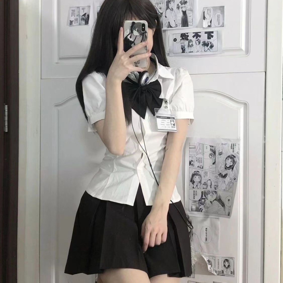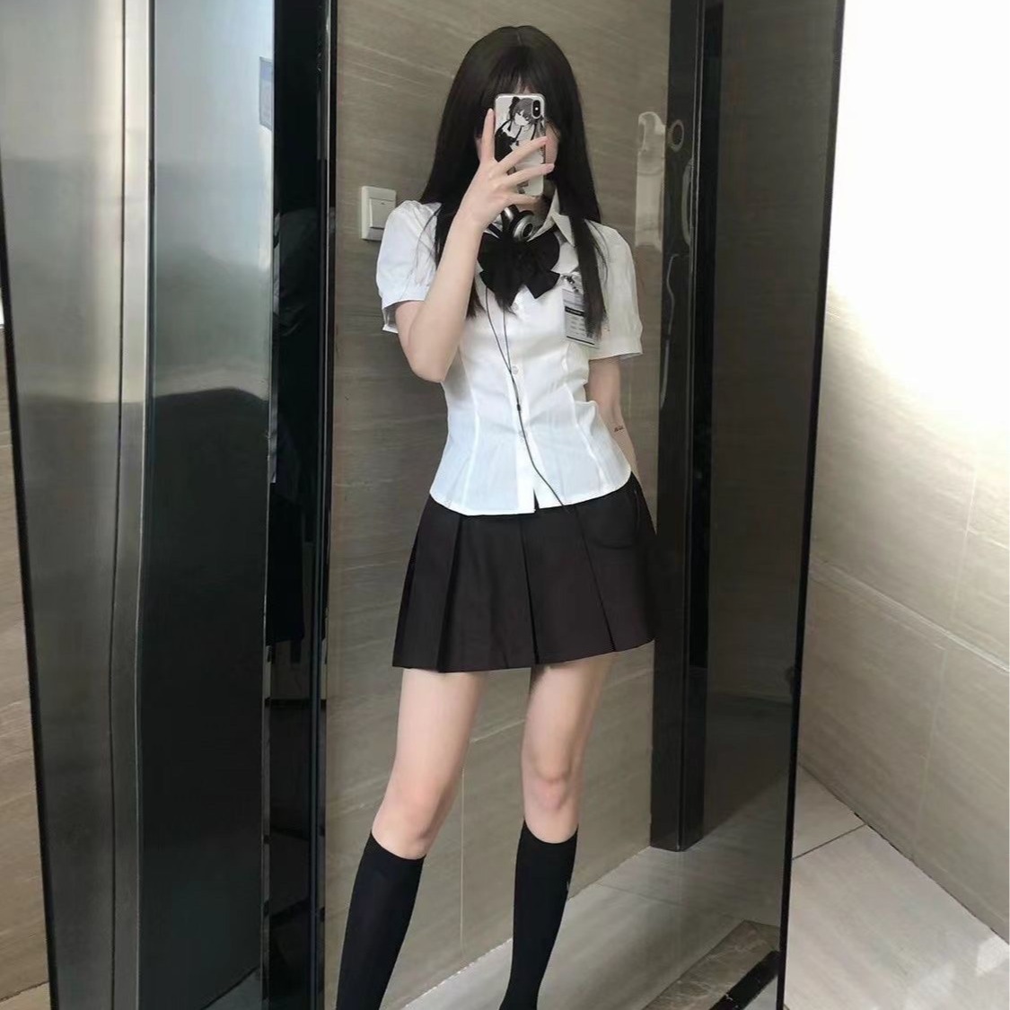 • 꽉 허리 셔츠 나비 넥타이 블랙 주름 치마 (세트)