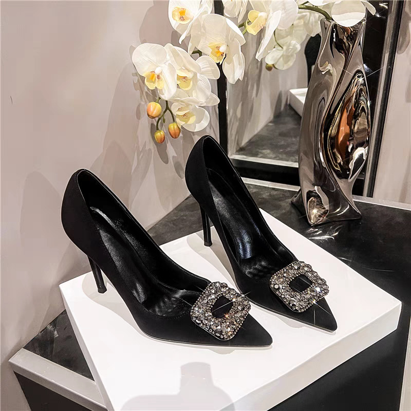 여성을위한 블랙 하이힐 2024 봄 새 가을 스틸레토 힐 라인 스톤 스웨이드가 피곤하지 않은 발 기질 뾰족한 발가락 스퀘어 버클 싱글 레이어 신발스토어 가기