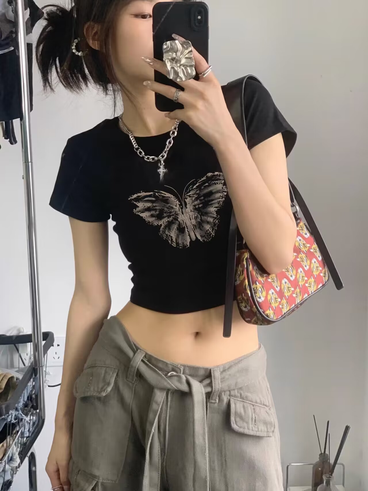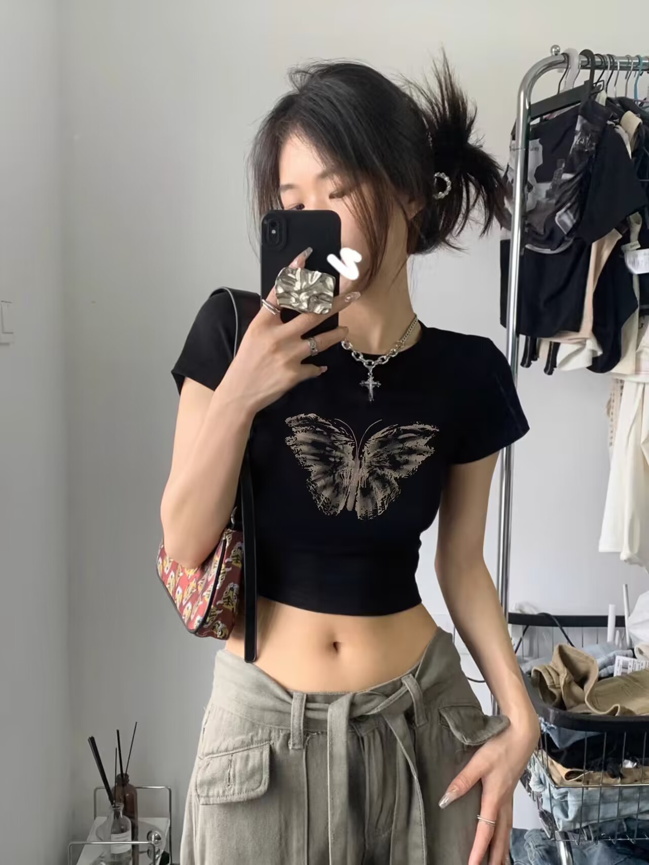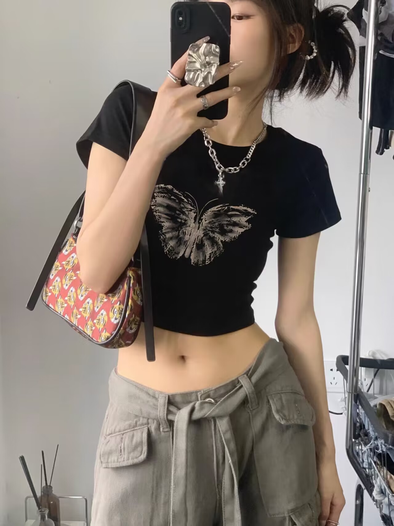 미국식 레트로 블랙 반팔 티셔츠 여성용 여름 도파민 착용 프랑스 타이트한 허리 셔츠 달콤하고 매운 탑스토어 가기