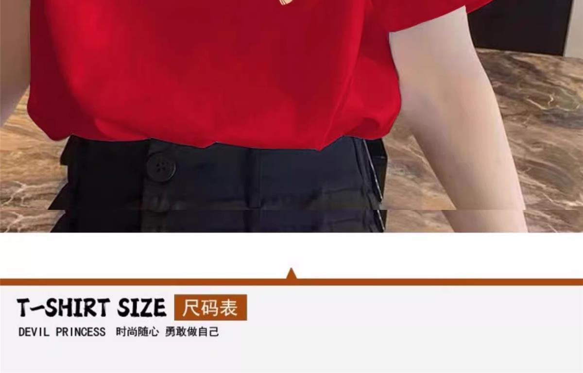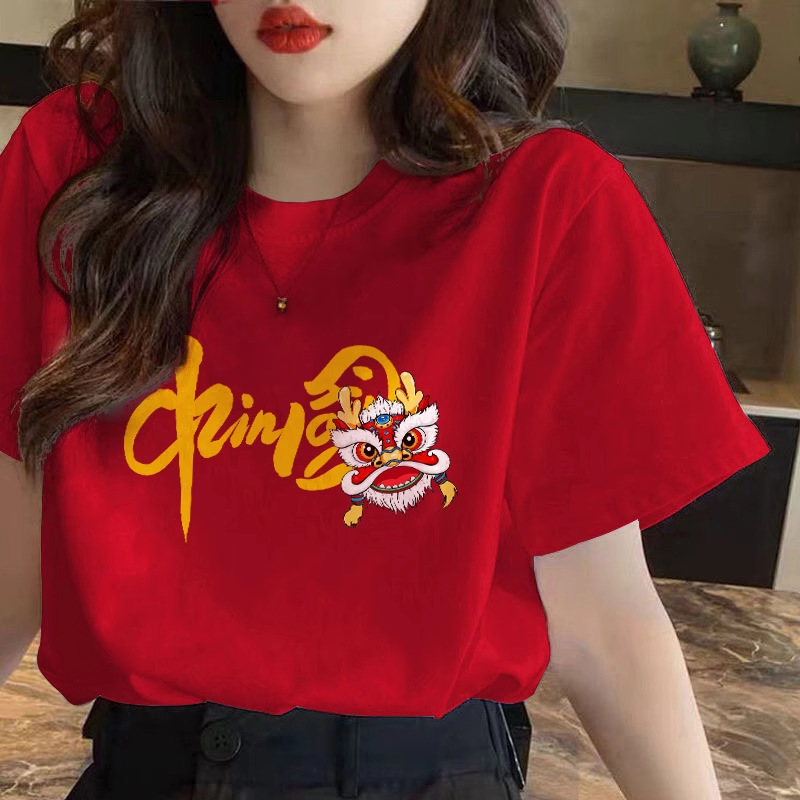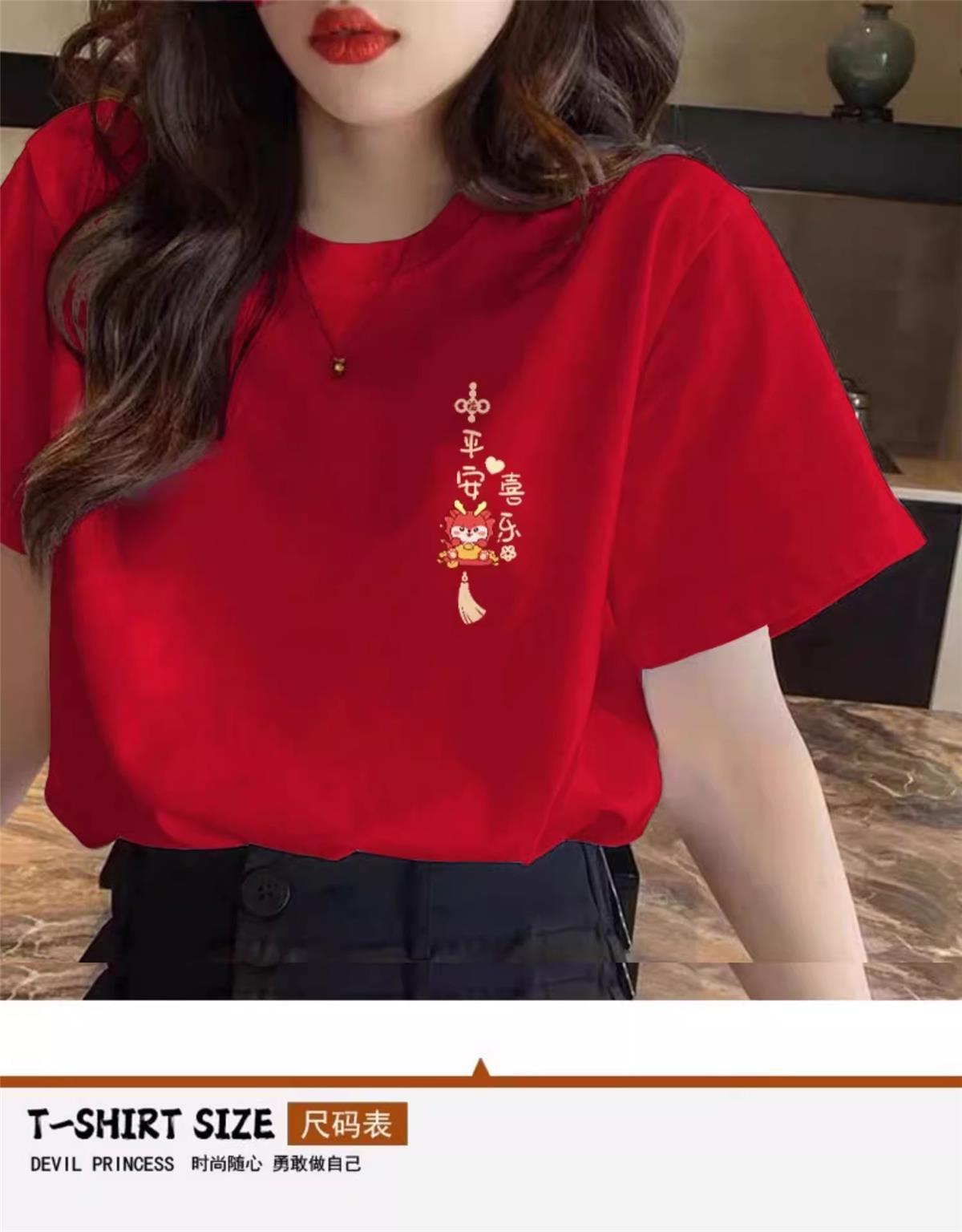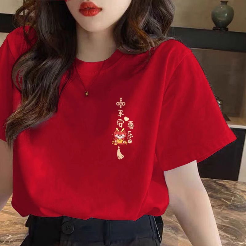 밝은 빨간색 Ping An Xi le 티셔츠 여성용 반팔 드래곤 년 새해 옷 2024 새로운 순면 바닥 셔츠스토어 가기