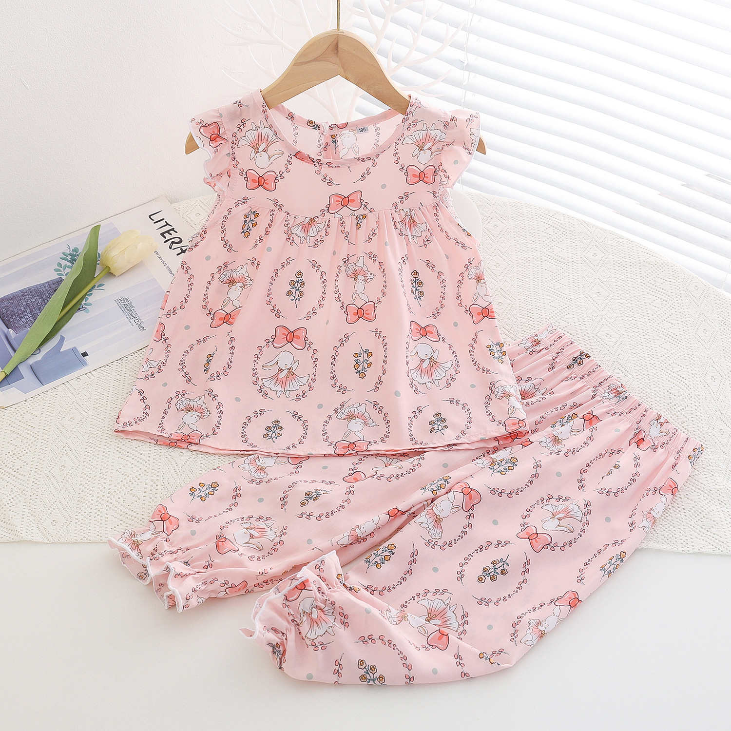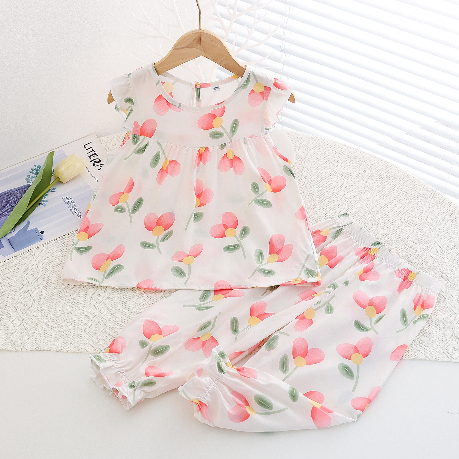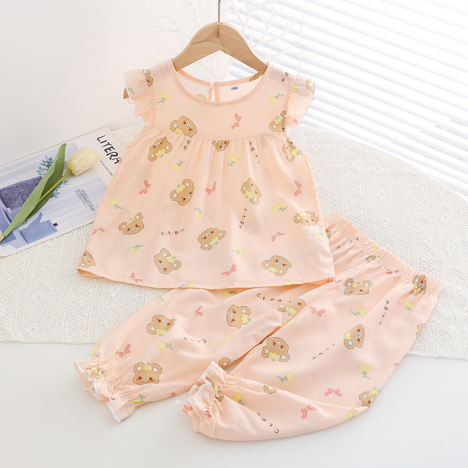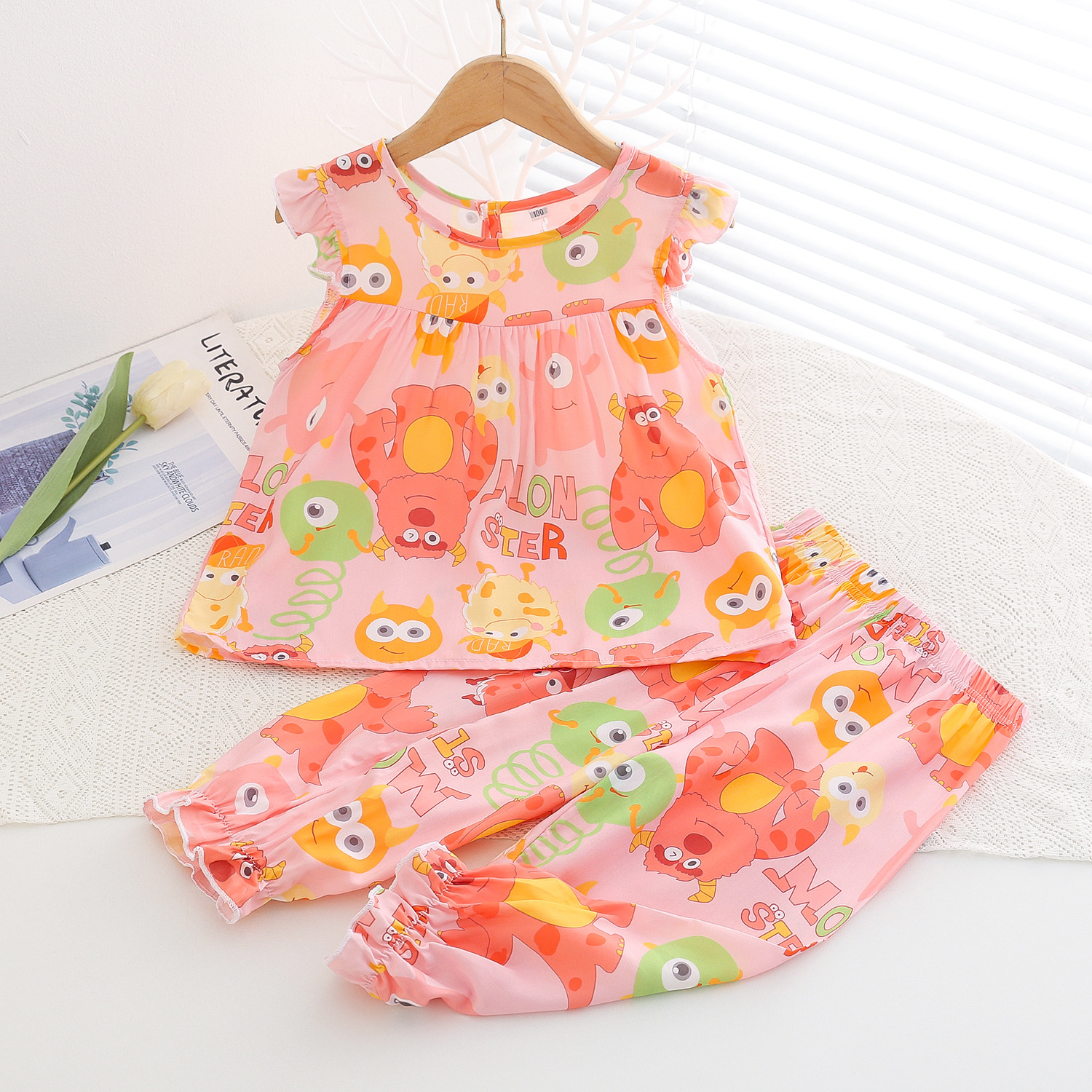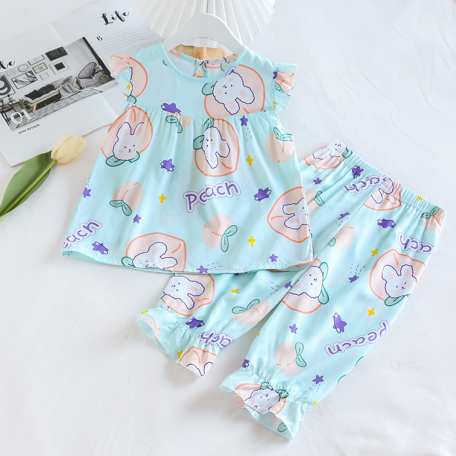 여름 소녀 인공 면화 세트 시원한 통기성 대외 무역 어린이 가정은 얇은 탑 모기 방지 바지면 실크 세트 착용