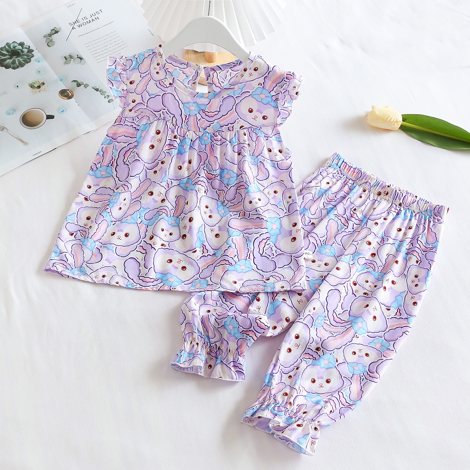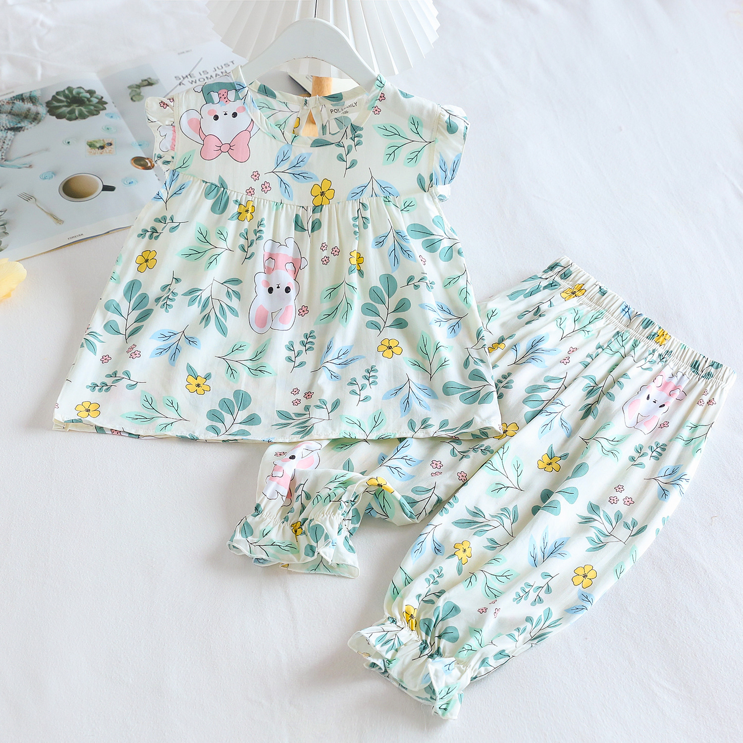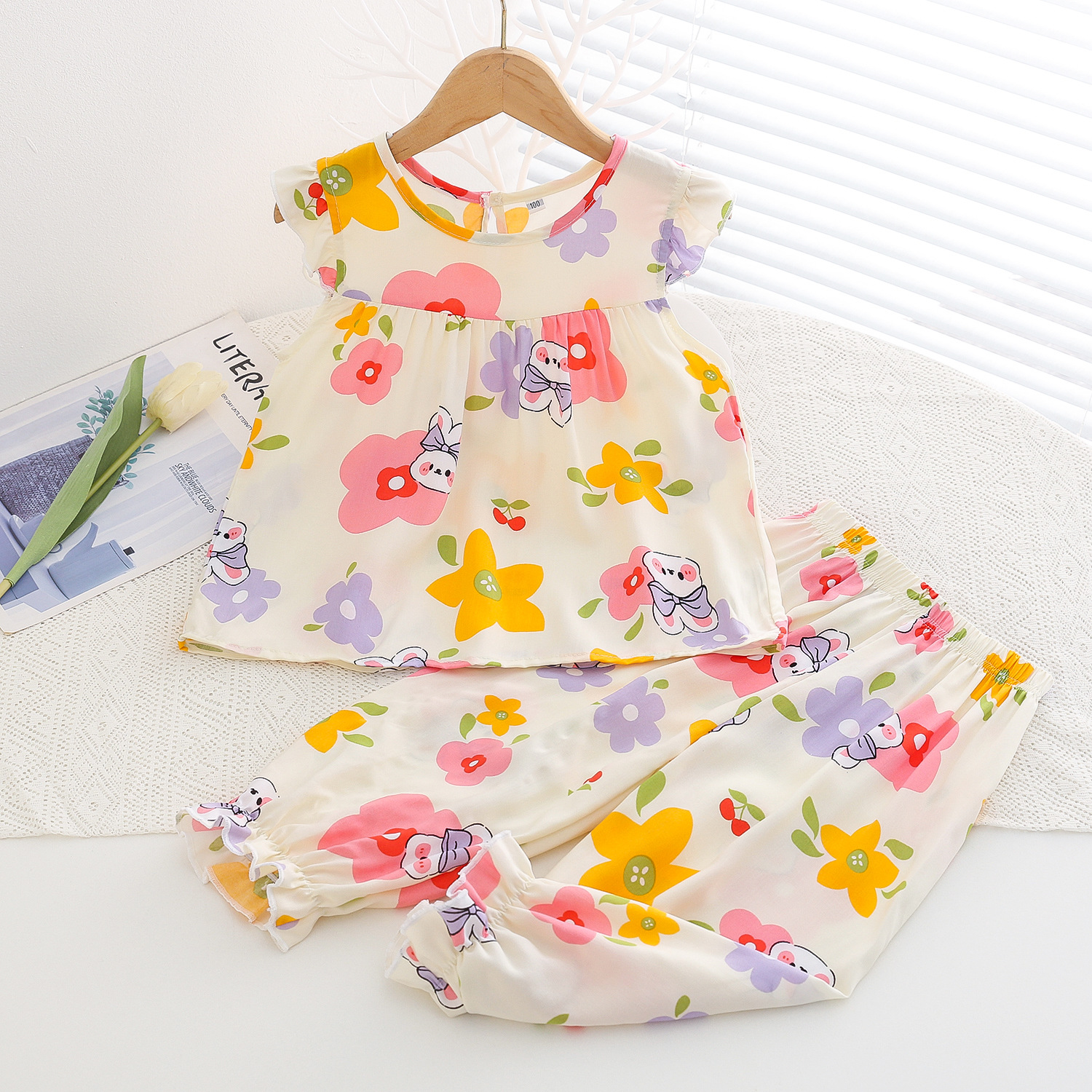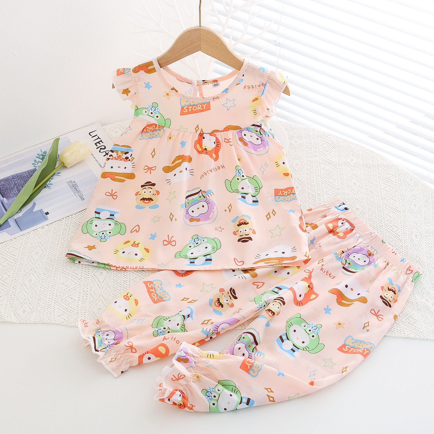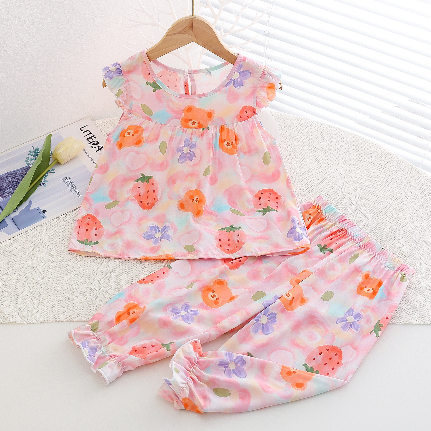 여름 소녀 인공 면화 세트 시원한 통기성 대외 무역 어린이 가정은 얇은 탑 모기 방지 바지면 실크 세트 착용