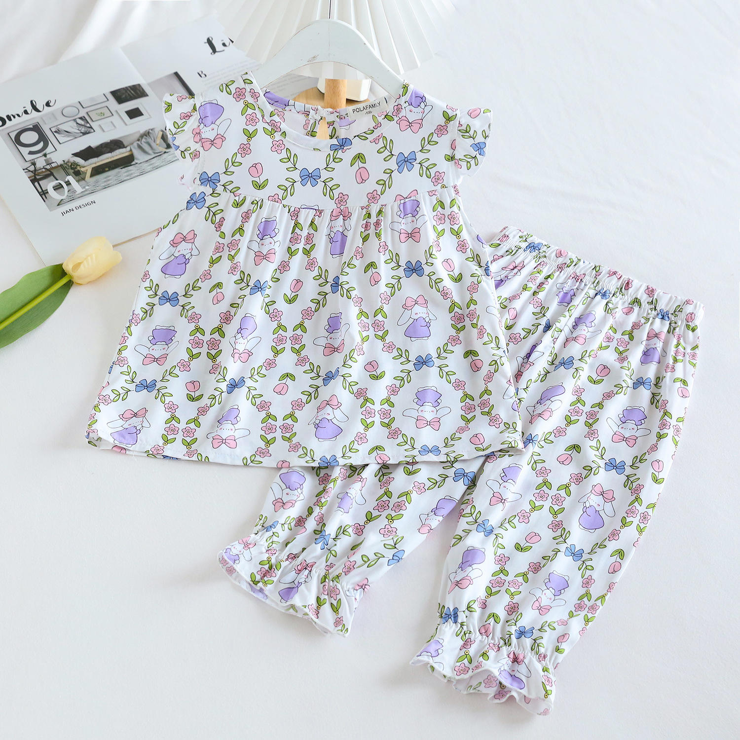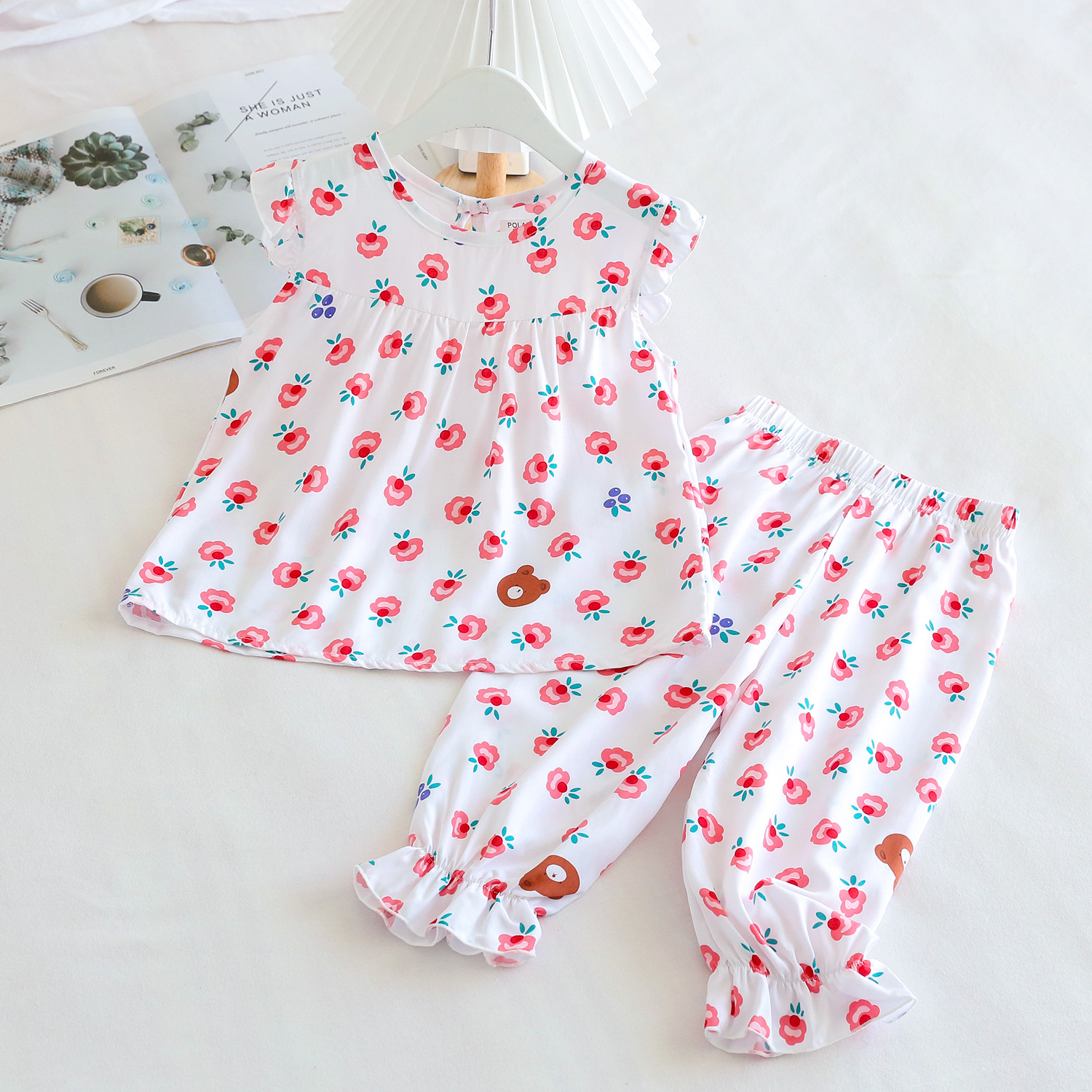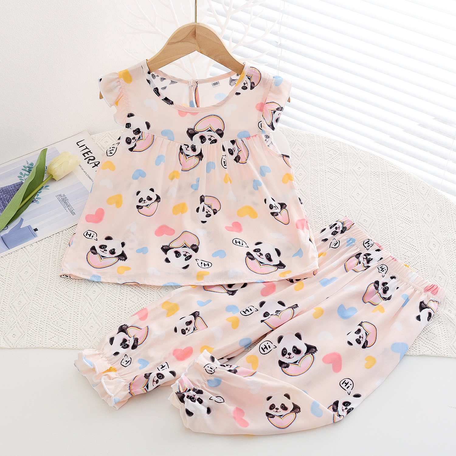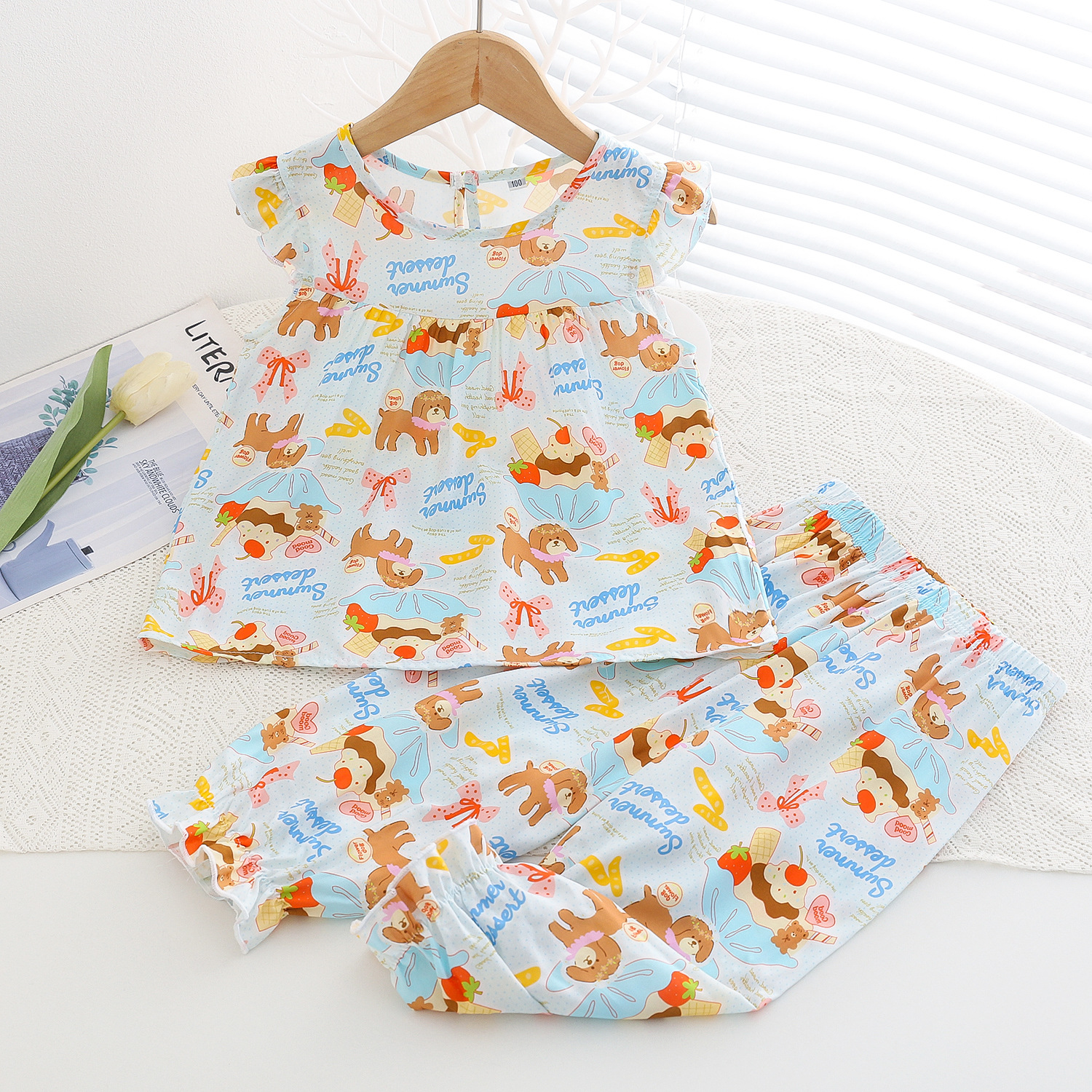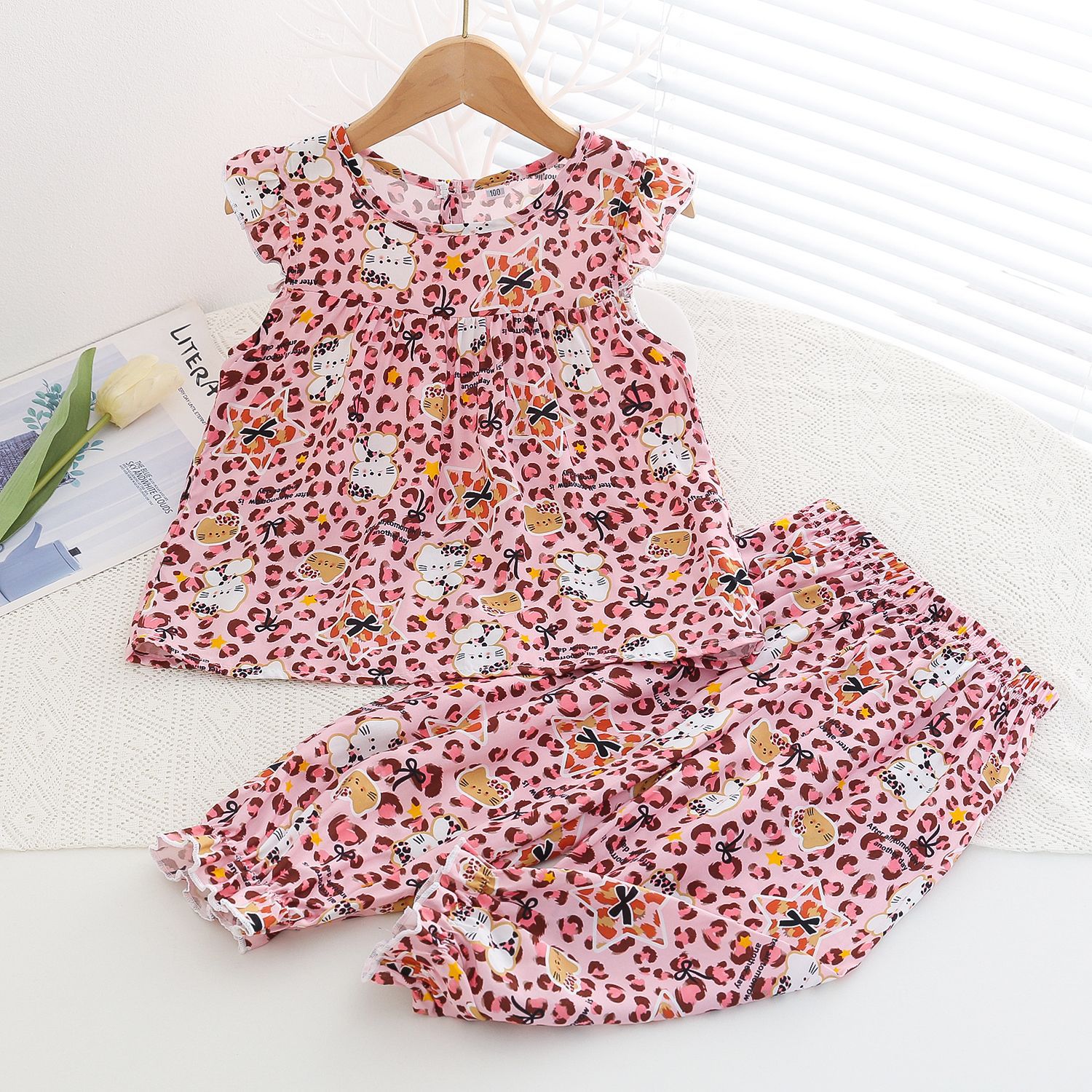 여름 소녀 인공 면화 세트 시원한 통기성 대외 무역 어린이 가정은 얇은 탑 모기 방지 바지면 실크 세트 착용