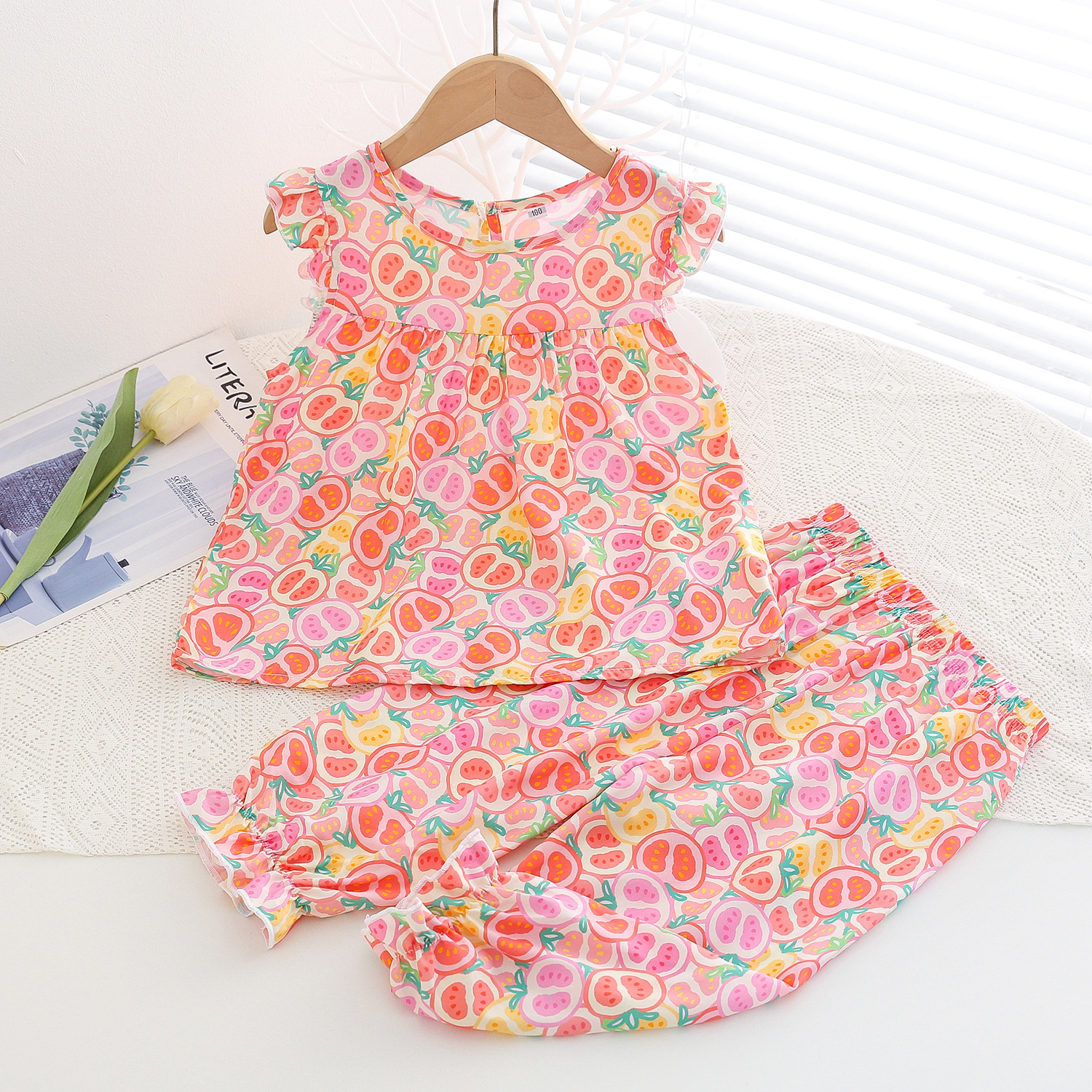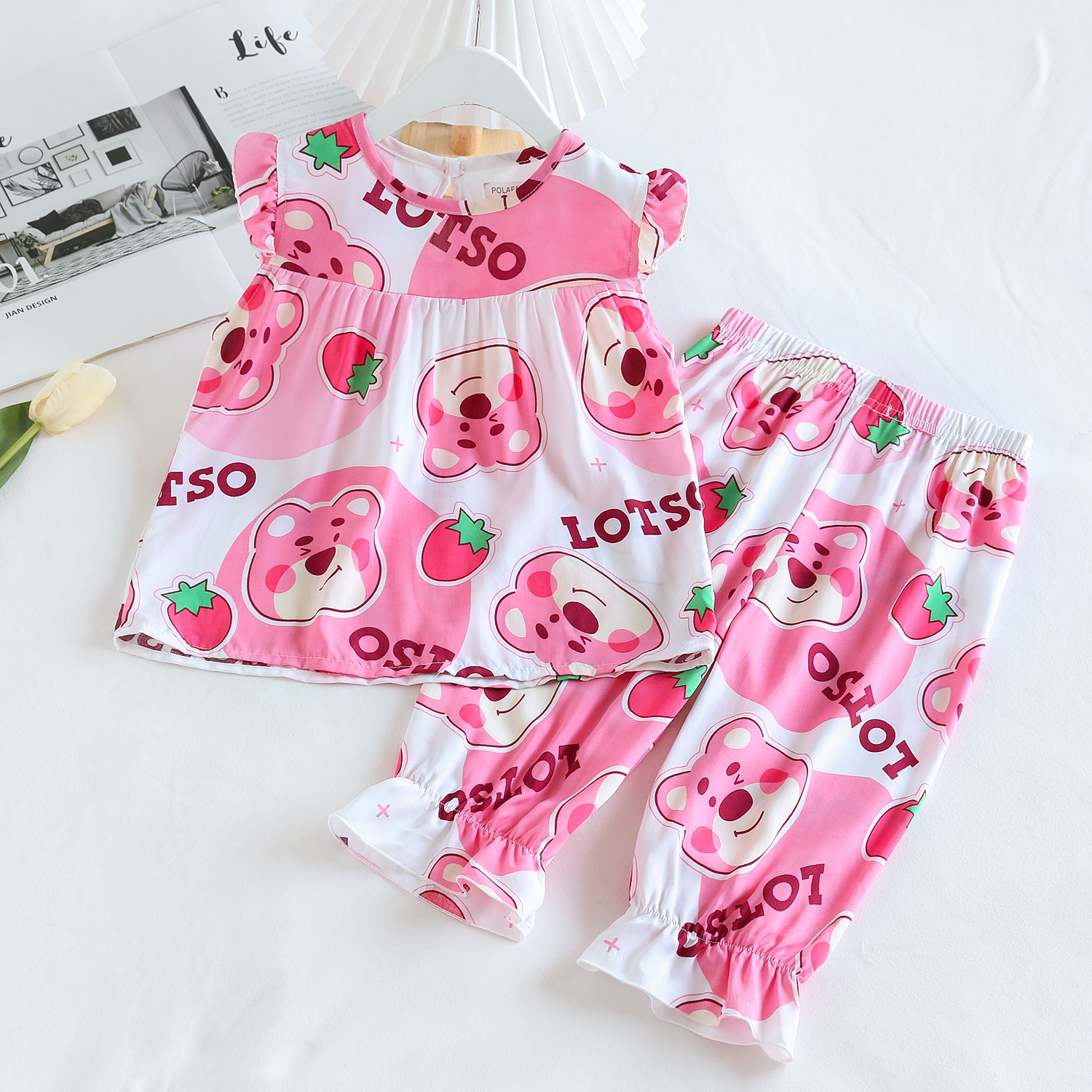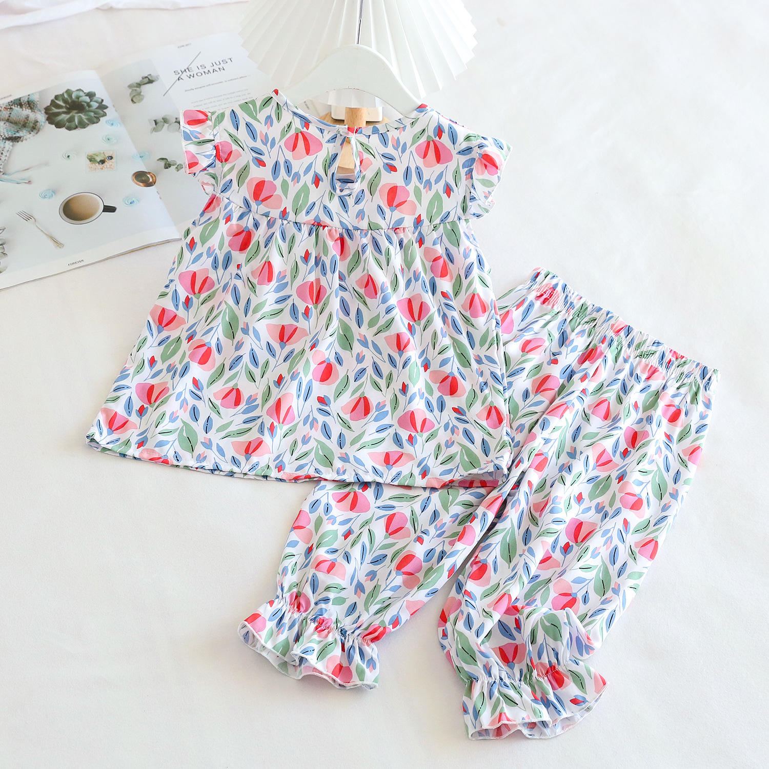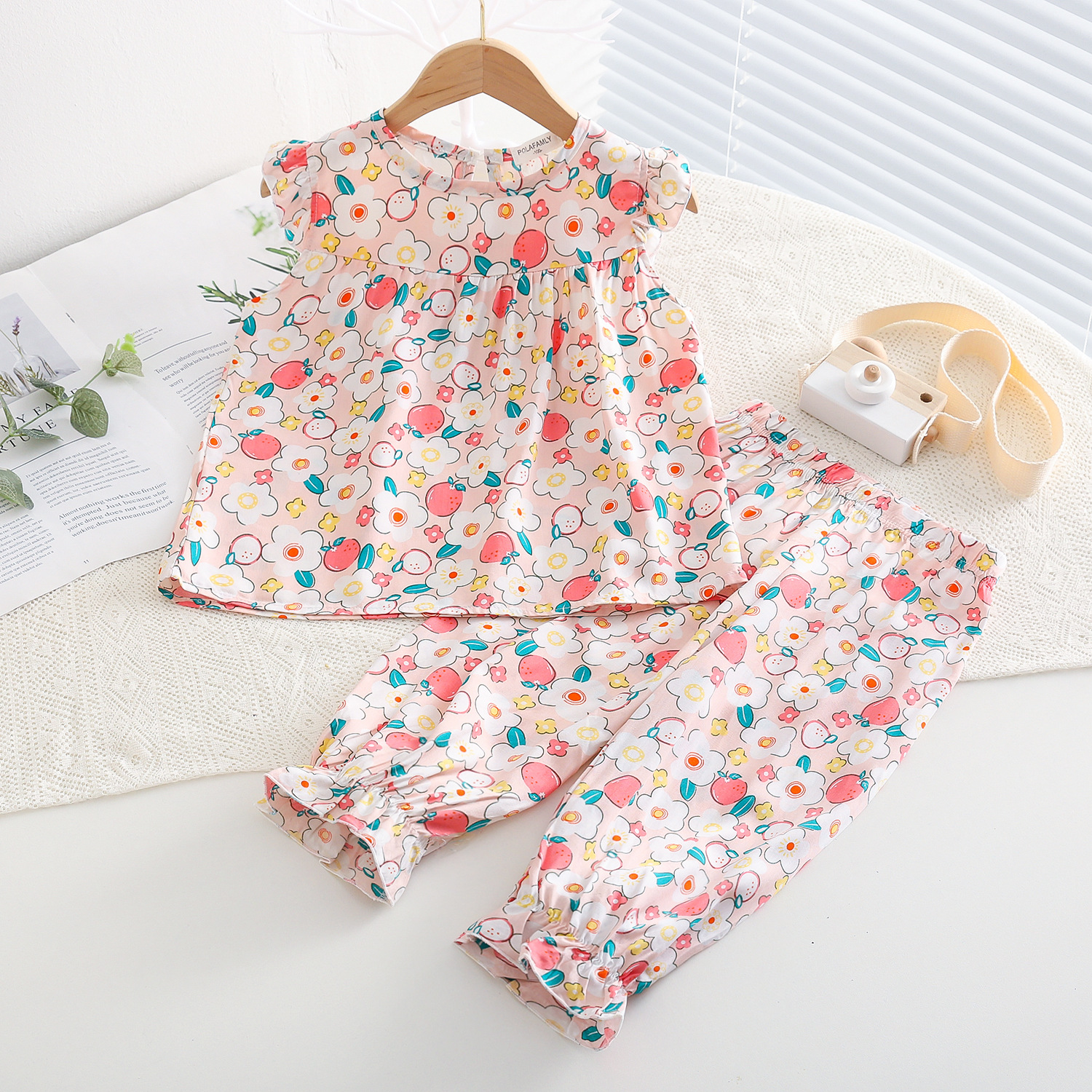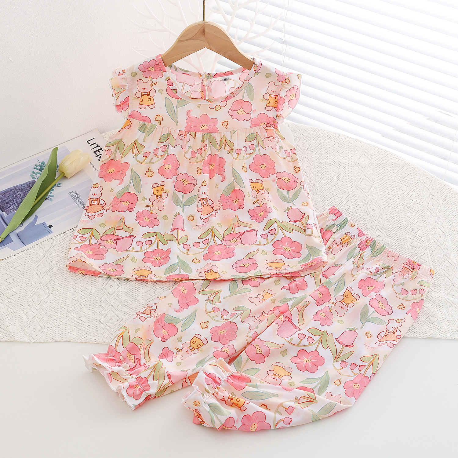 여름 소녀 인공 면화 세트 시원한 통기성 대외 무역 어린이 가정은 얇은 탑 모기 방지 바지면 실크 세트 착용