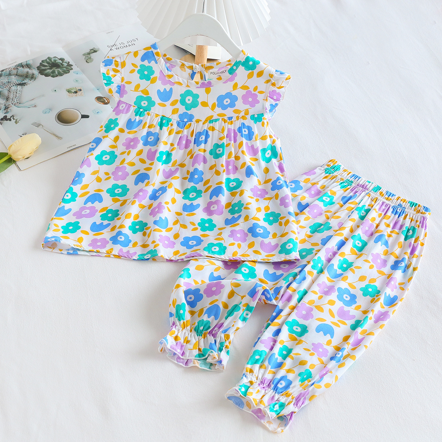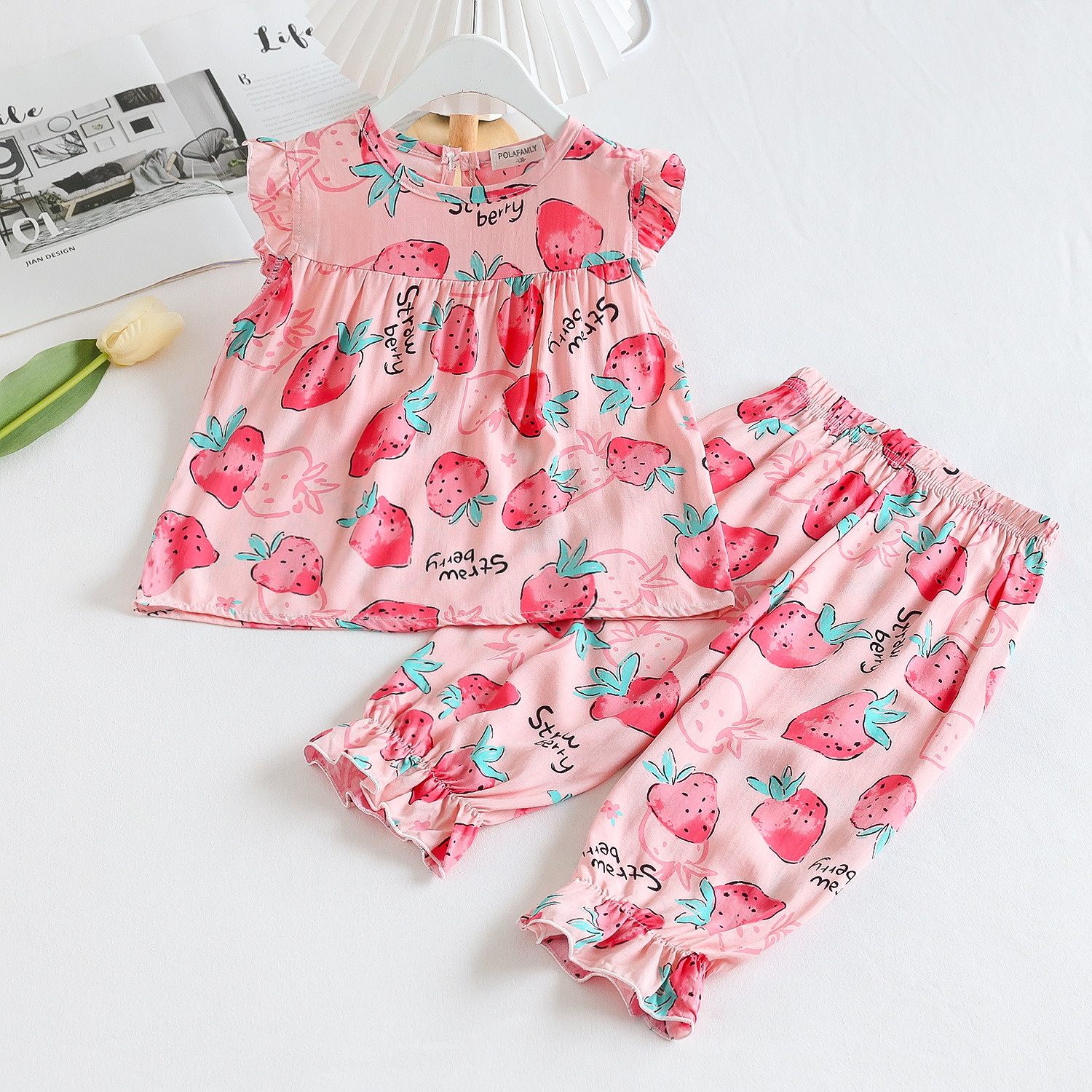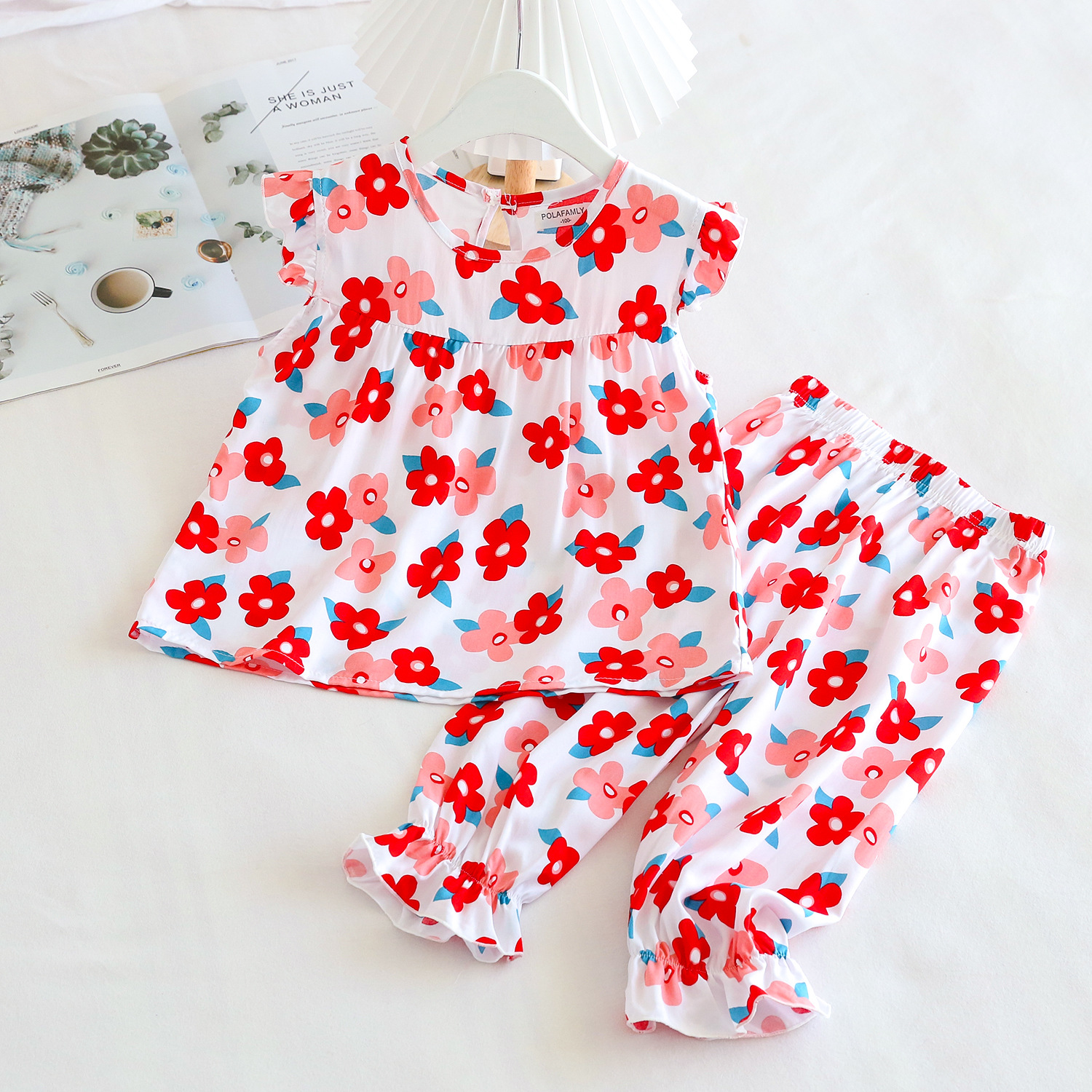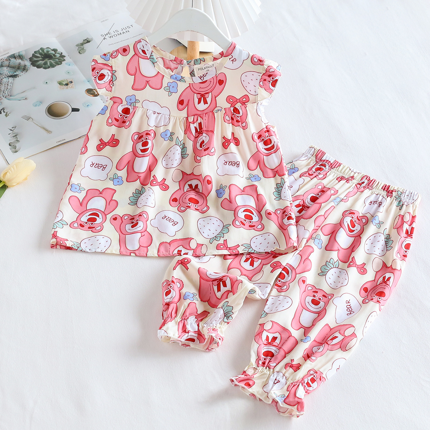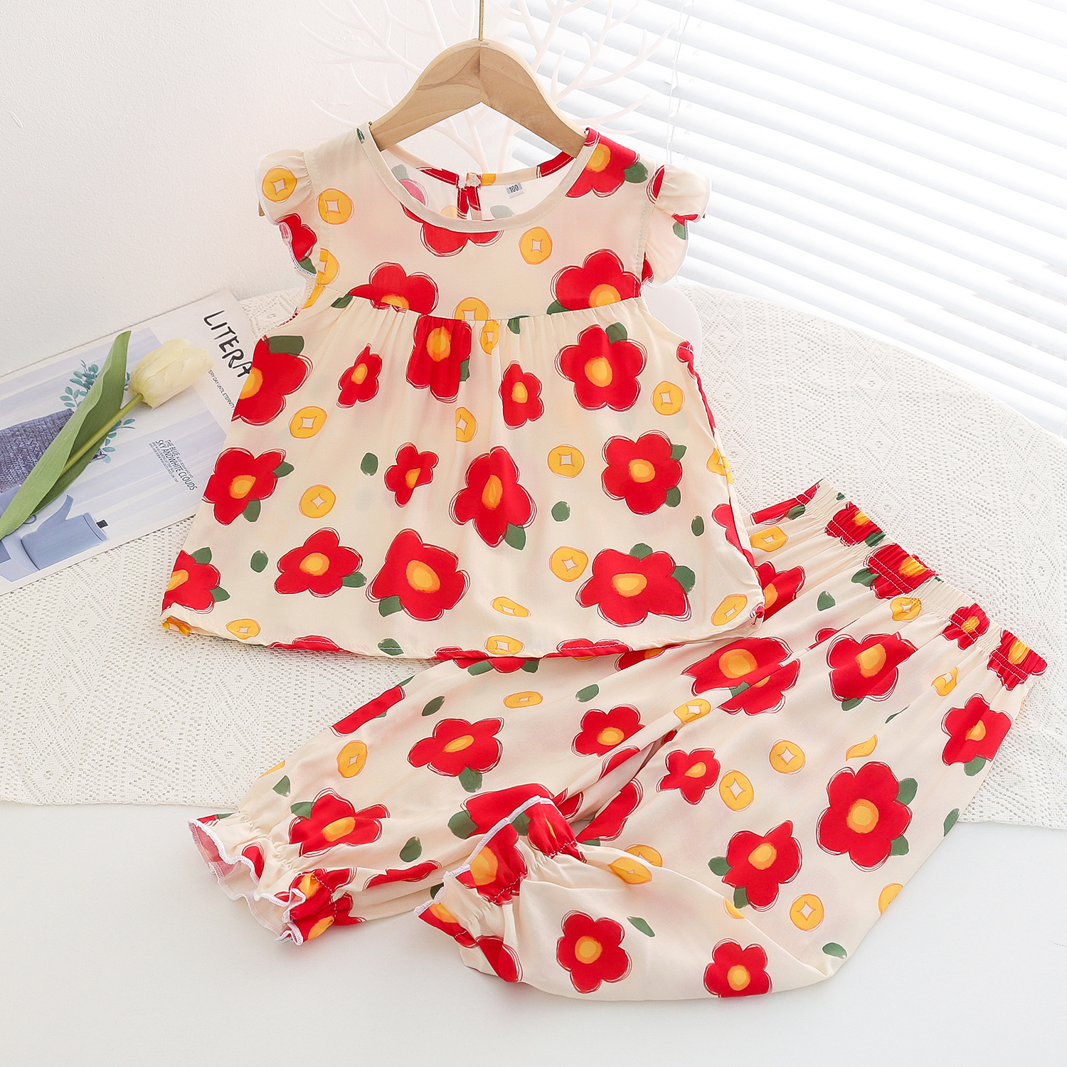 여름 소녀 인공 면화 세트 시원한 통기성 대외 무역 어린이 가정은 얇은 탑 모기 방지 바지면 실크 세트 착용