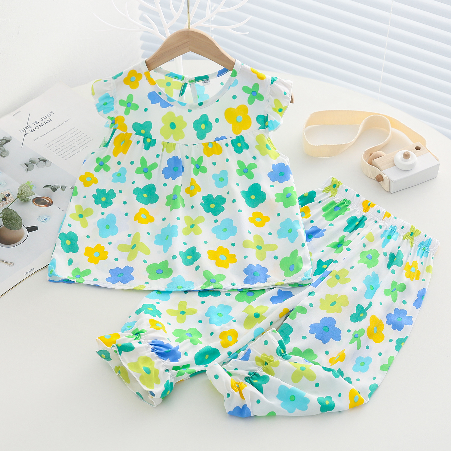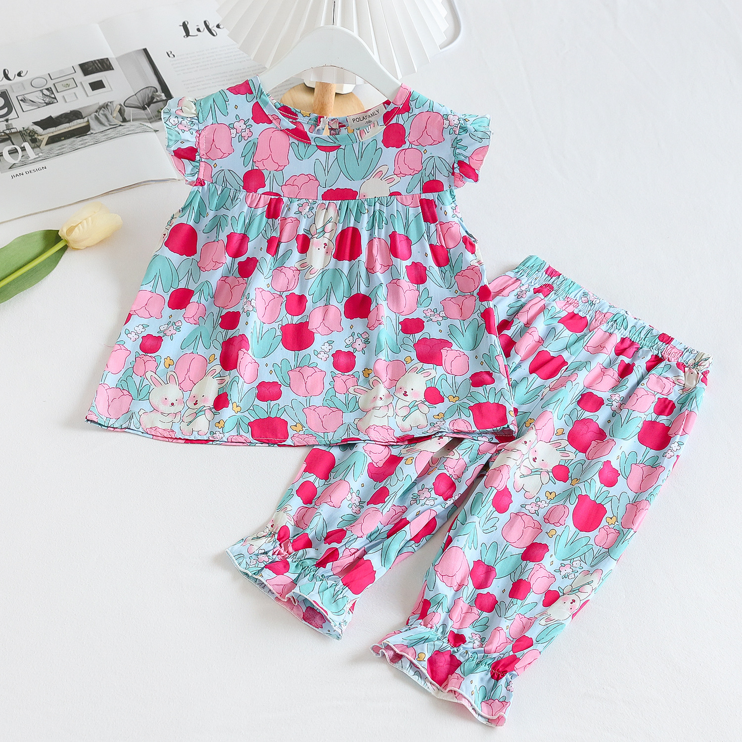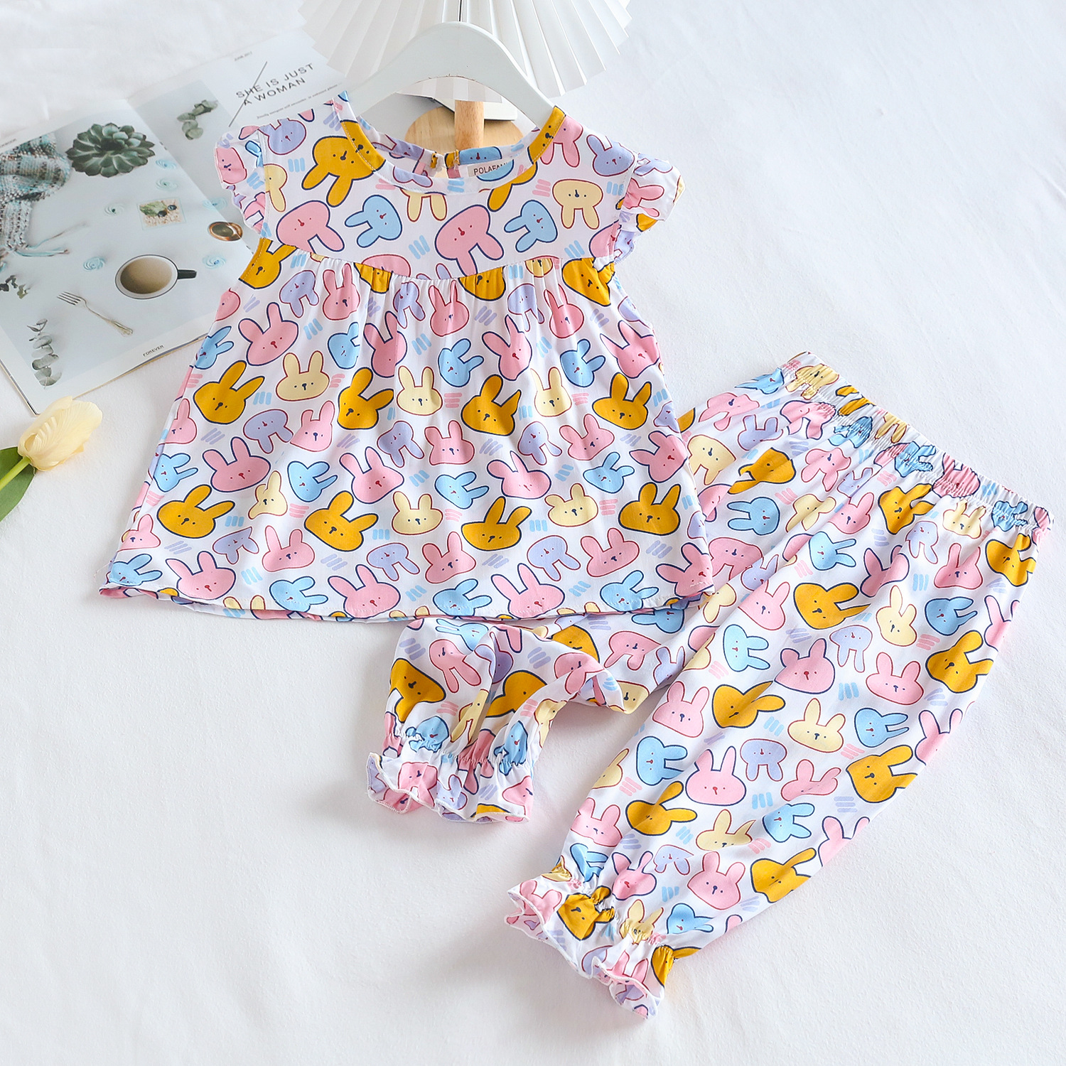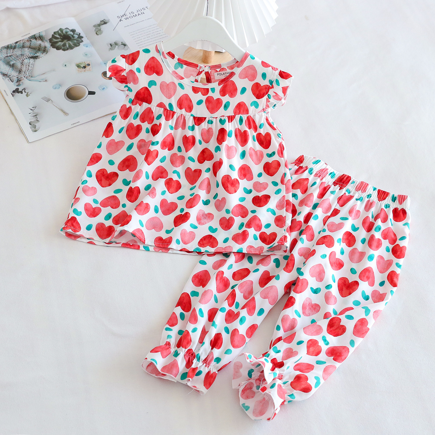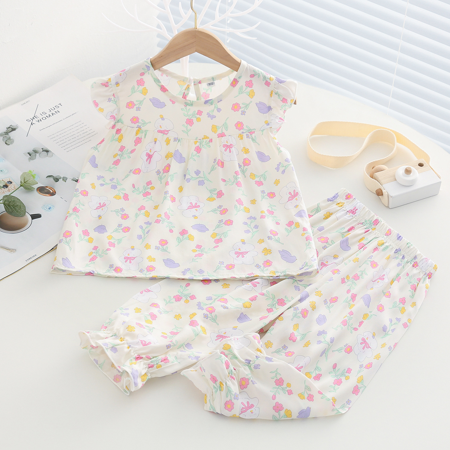 여름 소녀 인공 면화 세트 시원한 통기성 대외 무역 어린이 가정은 얇은 탑 모기 방지 바지면 실크 세트 착용