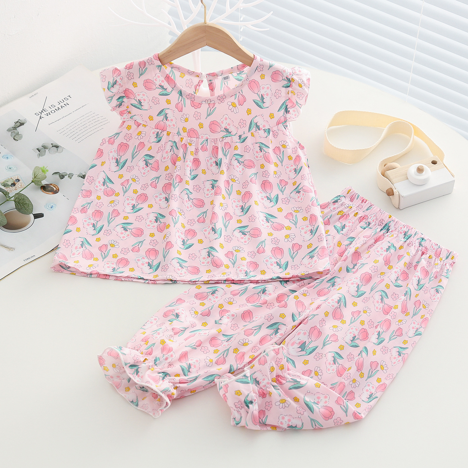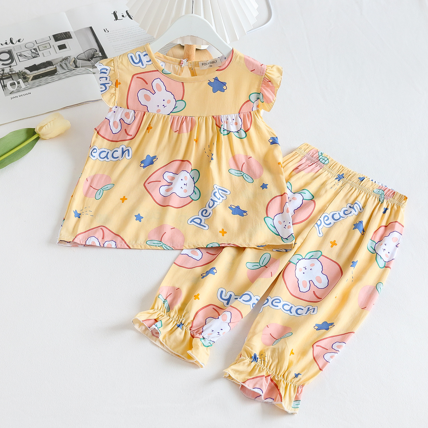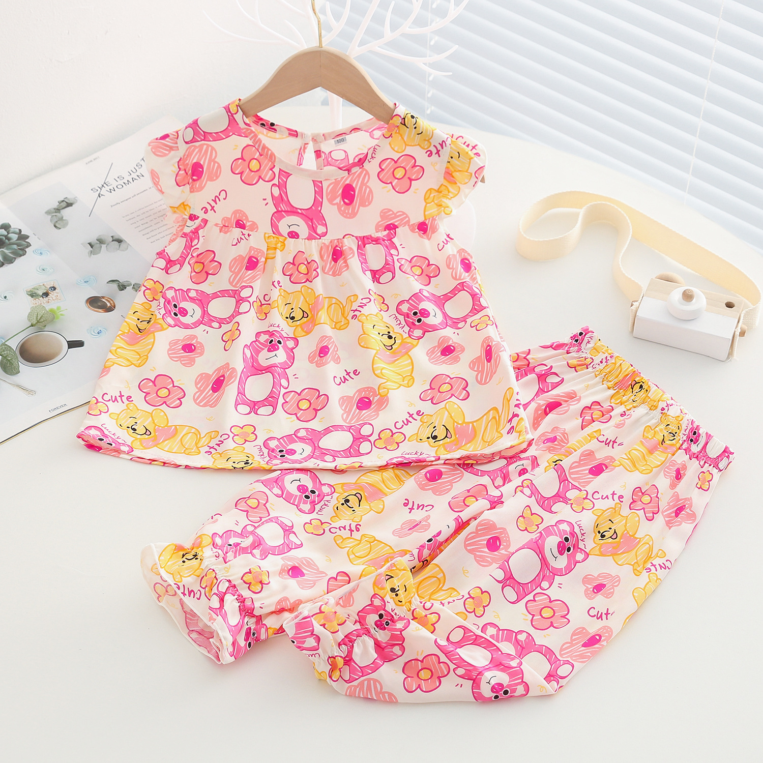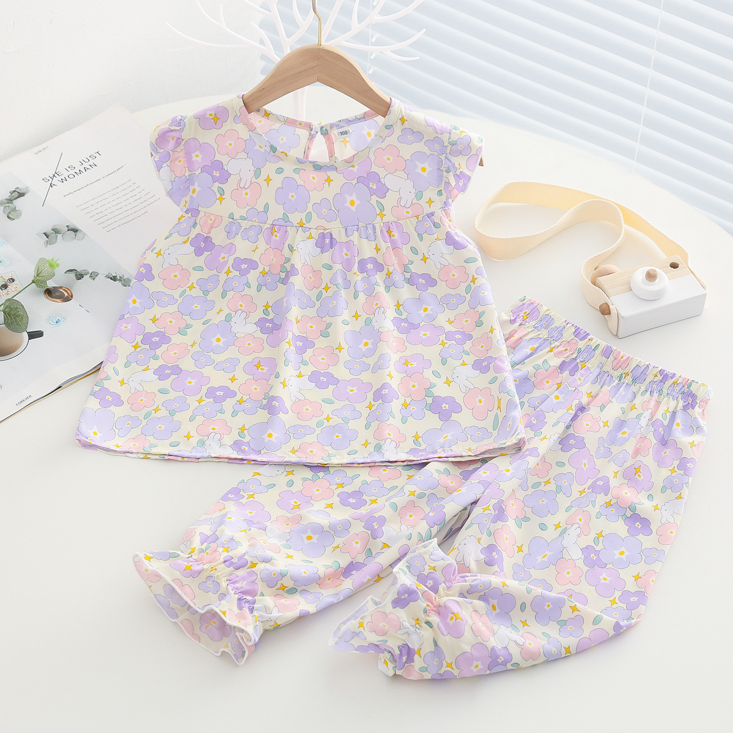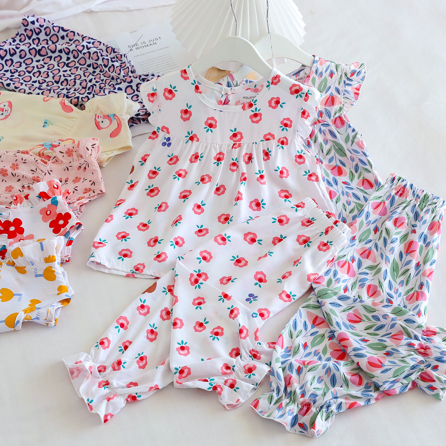 여름 소녀 인공 면화 세트 시원한 통기성 대외 무역 어린이 가정은 얇은 탑 모기 방지 바지면 실크 세트 착용