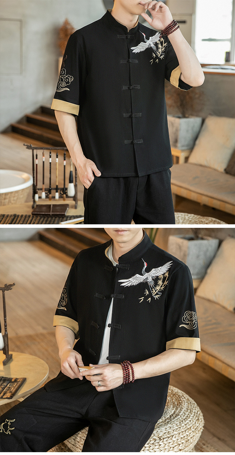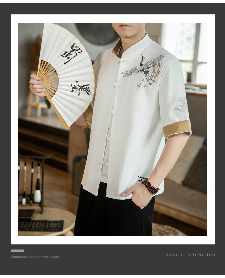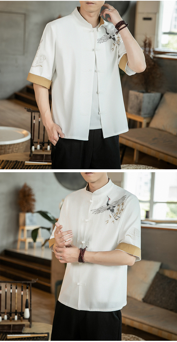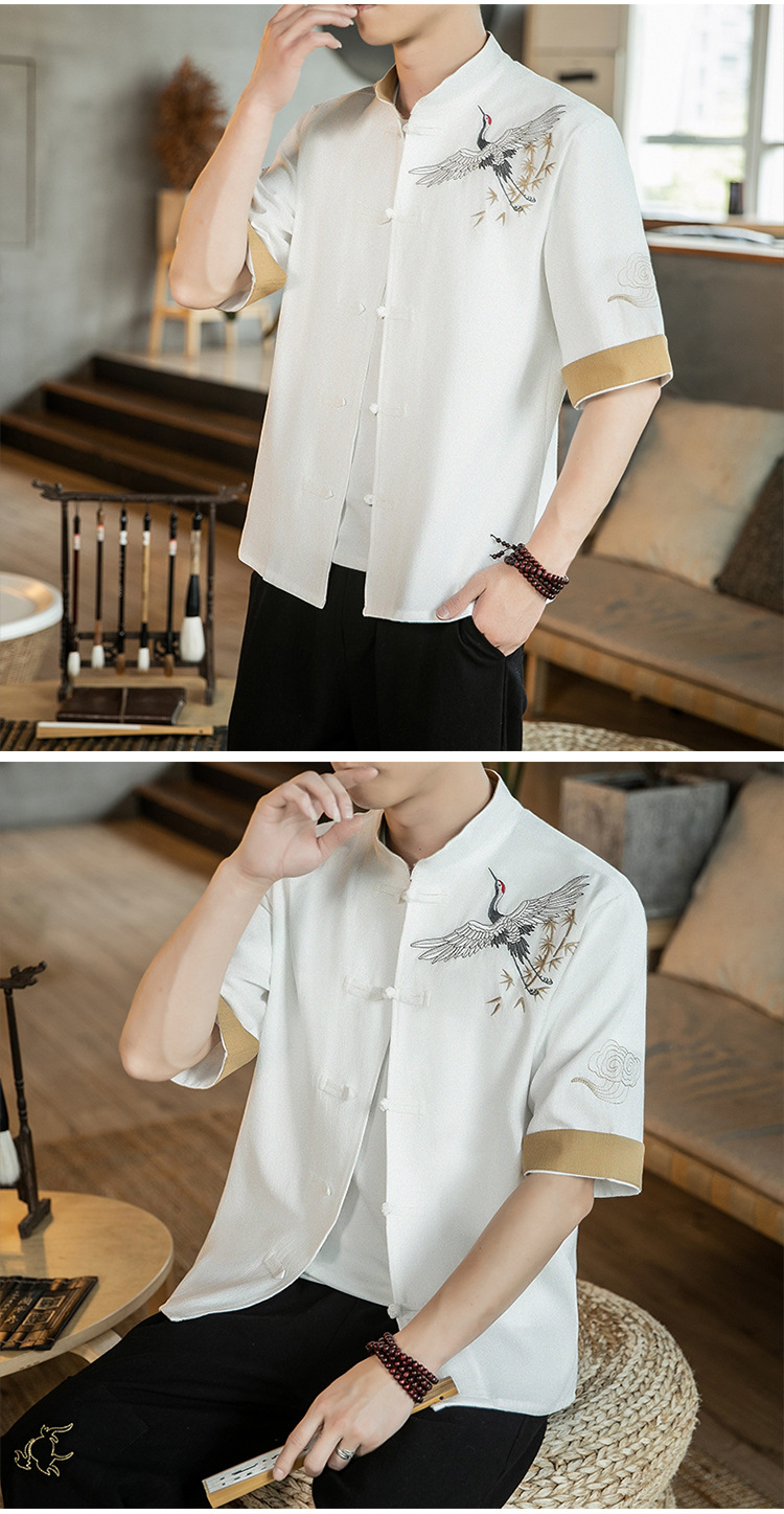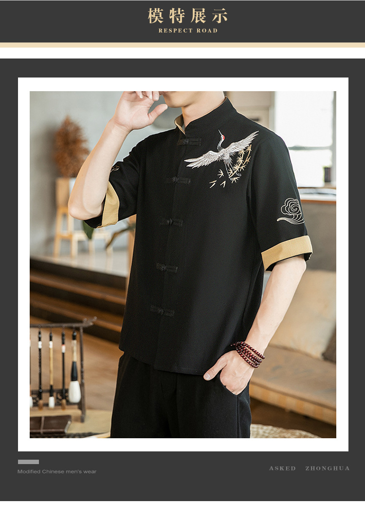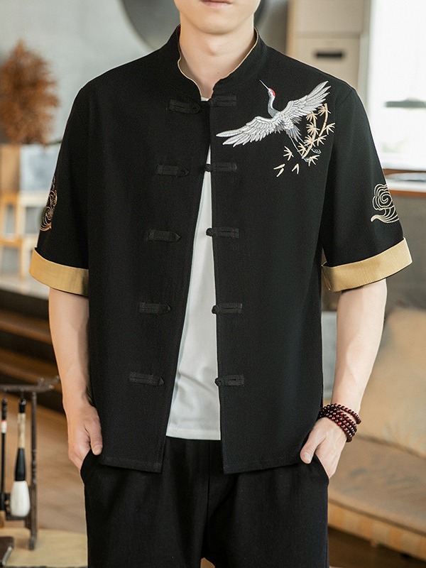 새로운 2024 트렌디 한 중국 스타일 셔츠 남성 여름 착용 비행 크레인 자수 대비 색상 길조 구름 남성 짧은 소매 캐주얼 셔츠