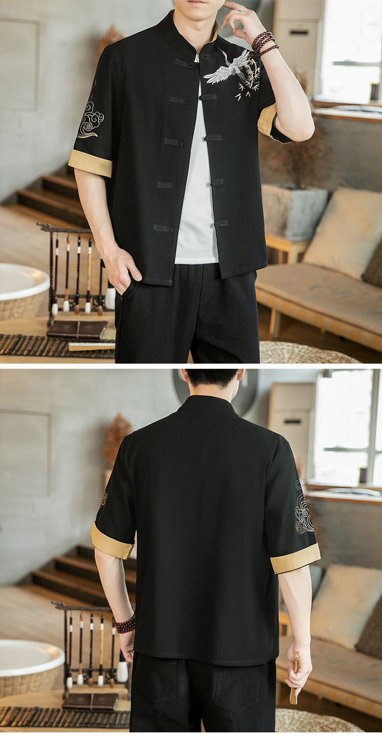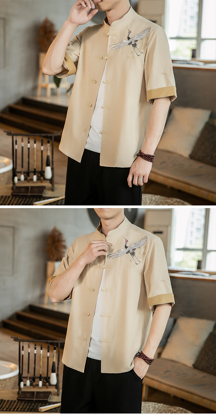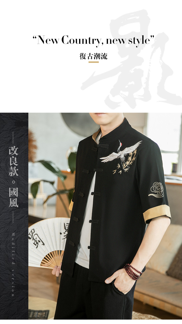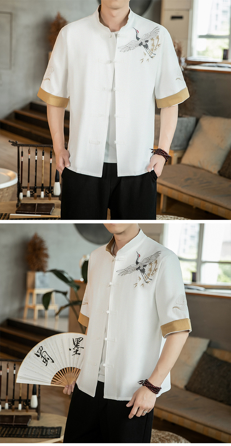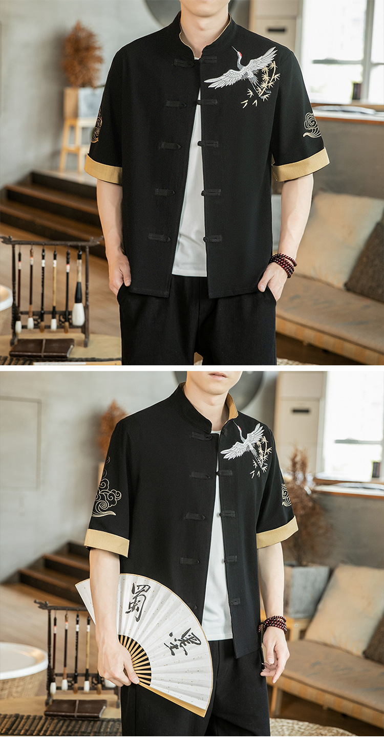새로운 2024 트렌디 한 중국 스타일 셔츠 남성 여름 착용 비행 크레인 자수 대비 색상 길조 구름 남성 짧은 소매 캐주얼 셔츠