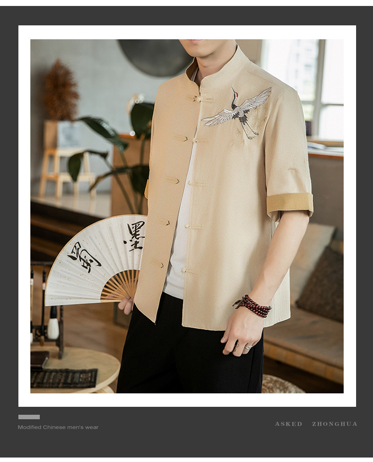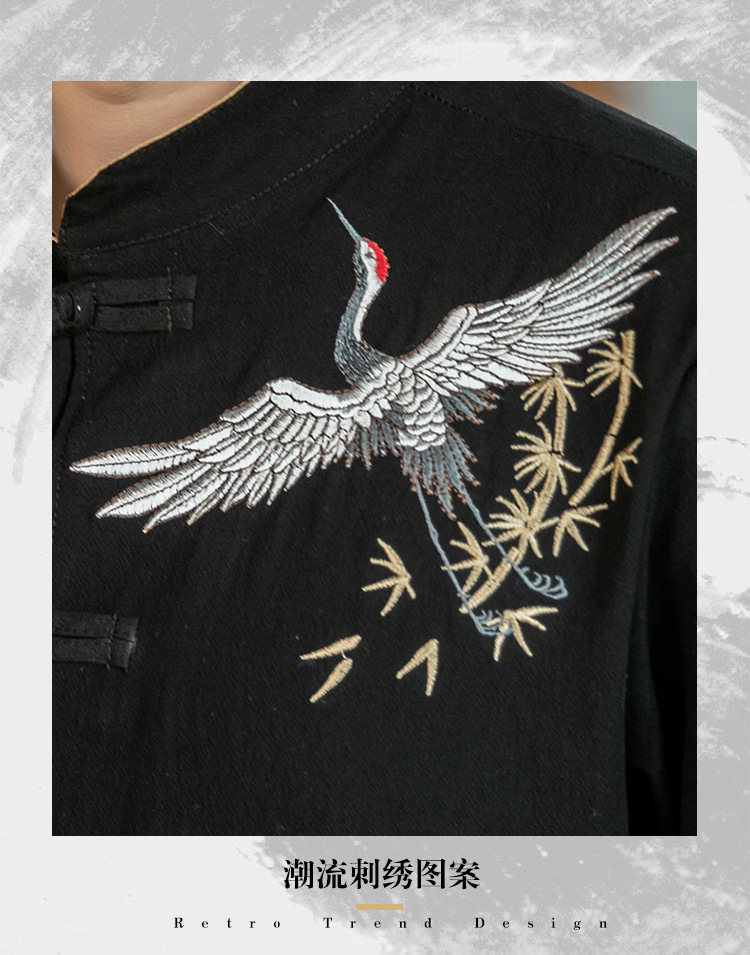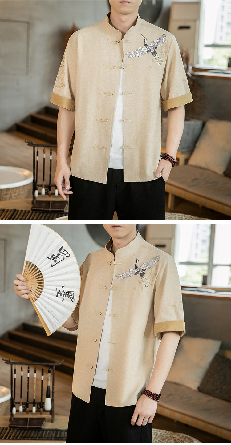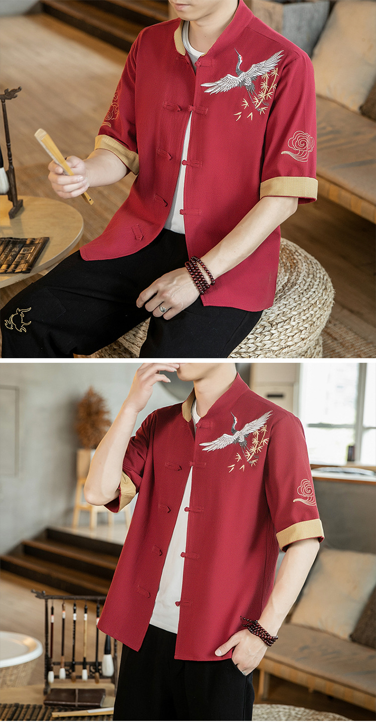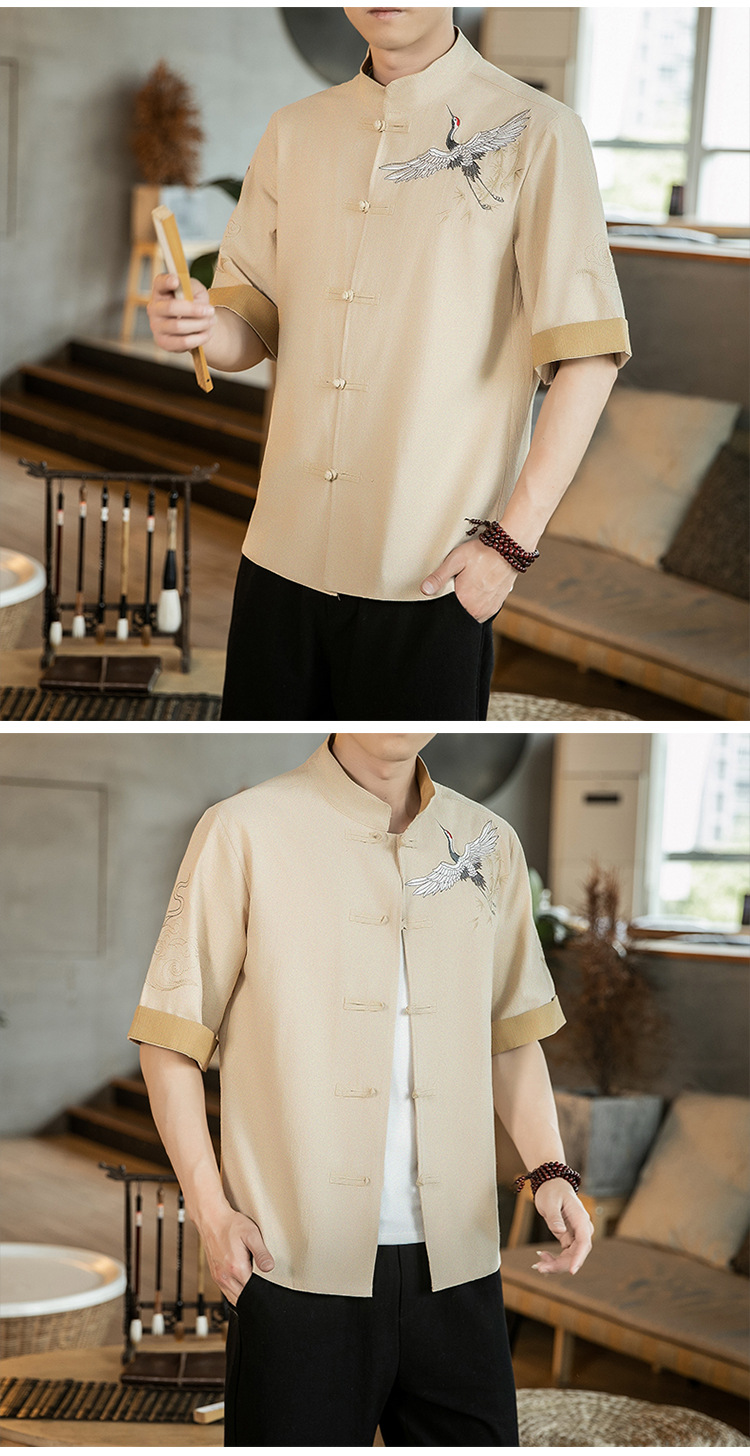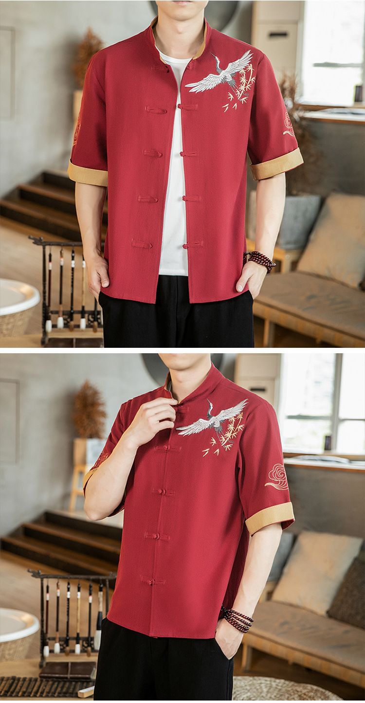 새로운 2024 트렌디 한 중국 스타일 셔츠 남성 여름 착용 비행 크레인 자수 대비 색상 길조 구름 남성 짧은 소매 캐주얼 셔츠