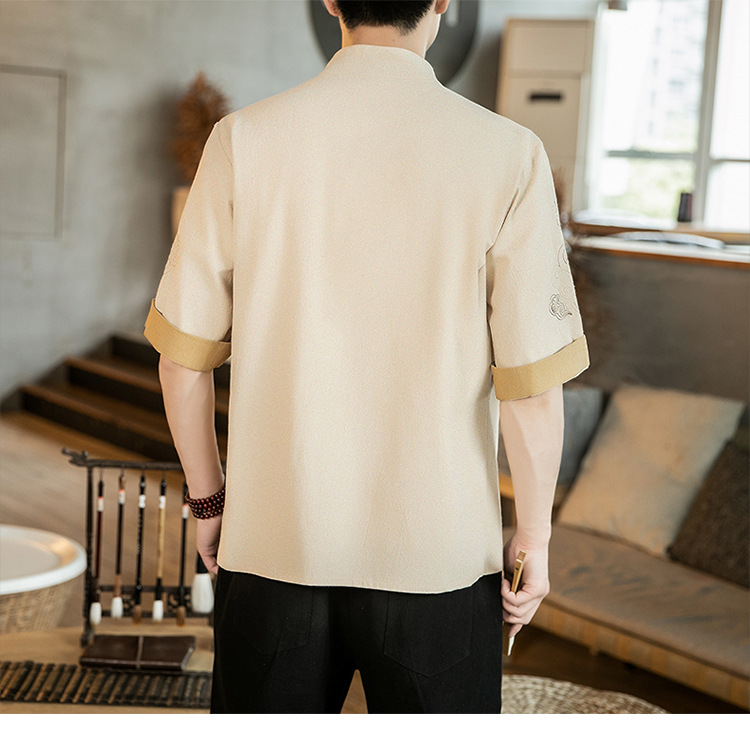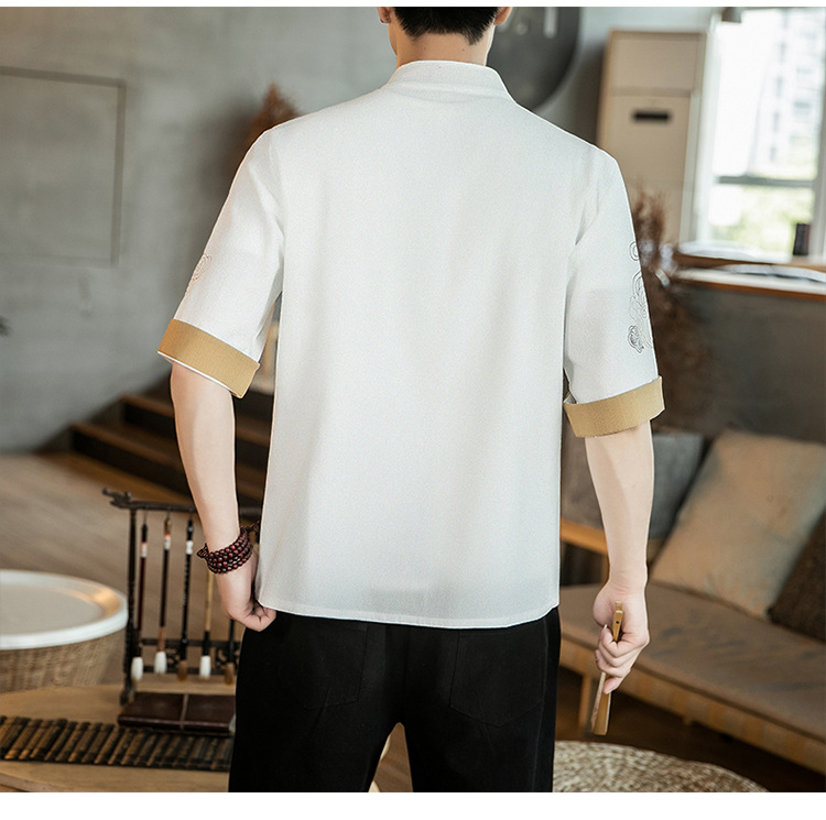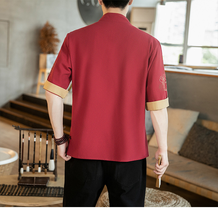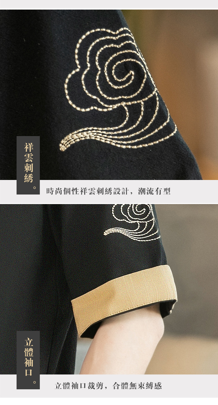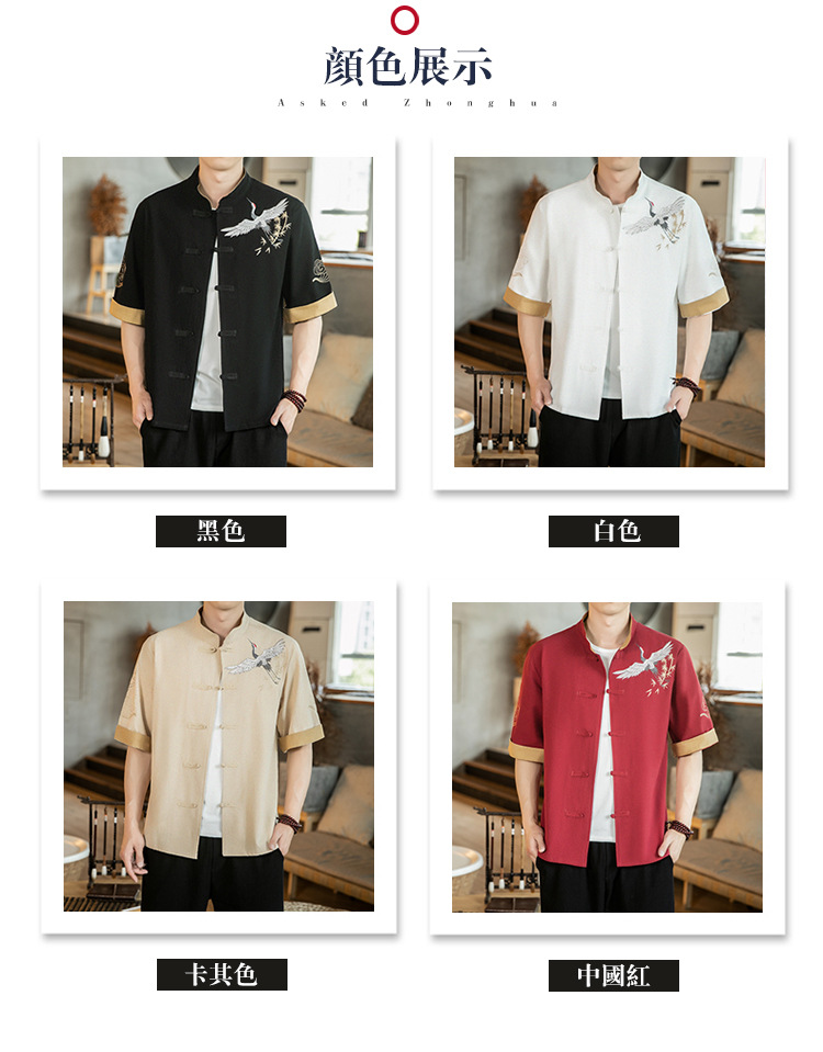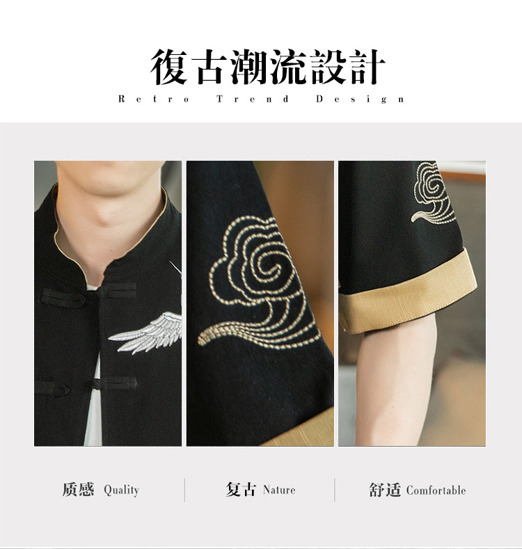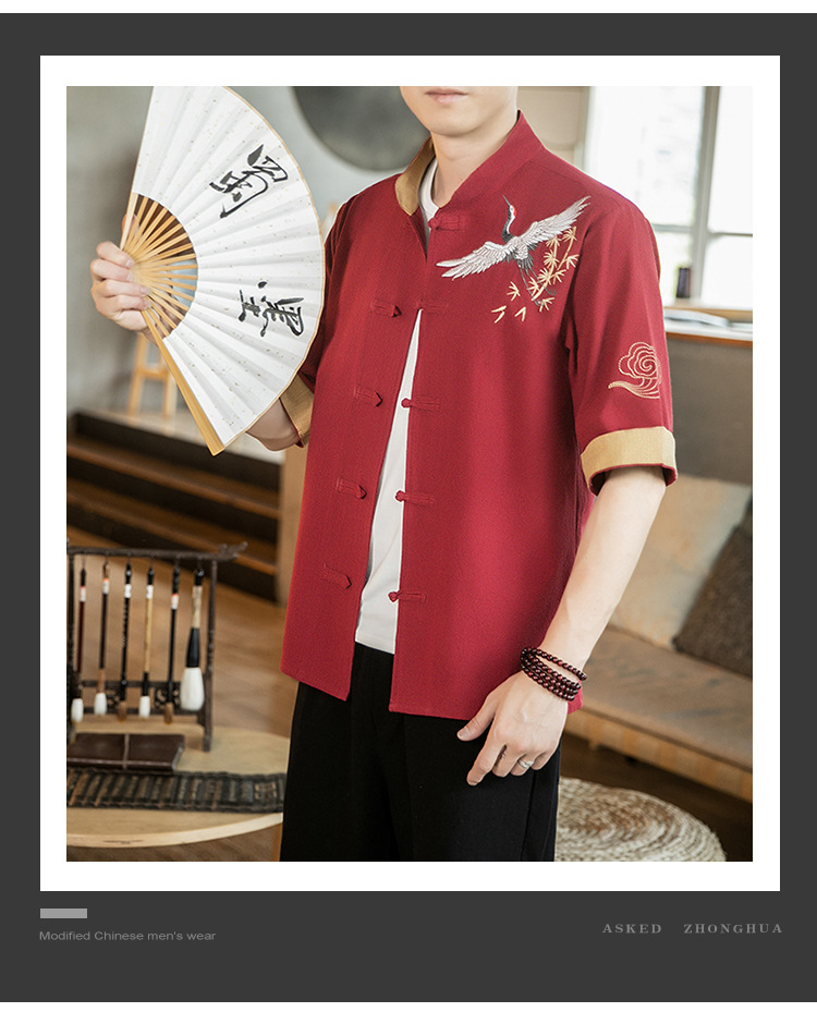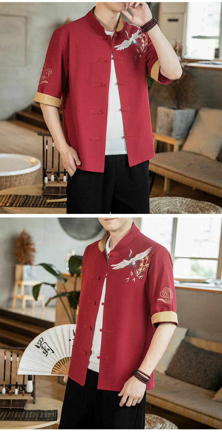 새로운 2024 트렌디 한 중국 스타일 셔츠 남성 여름 착용 비행 크레인 자수 대비 색상 길조 구름 남성 짧은 소매 캐주얼 셔츠