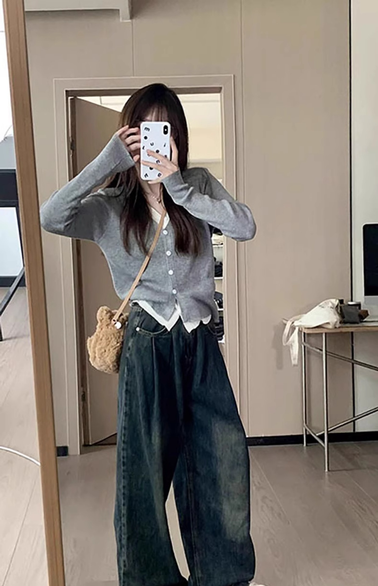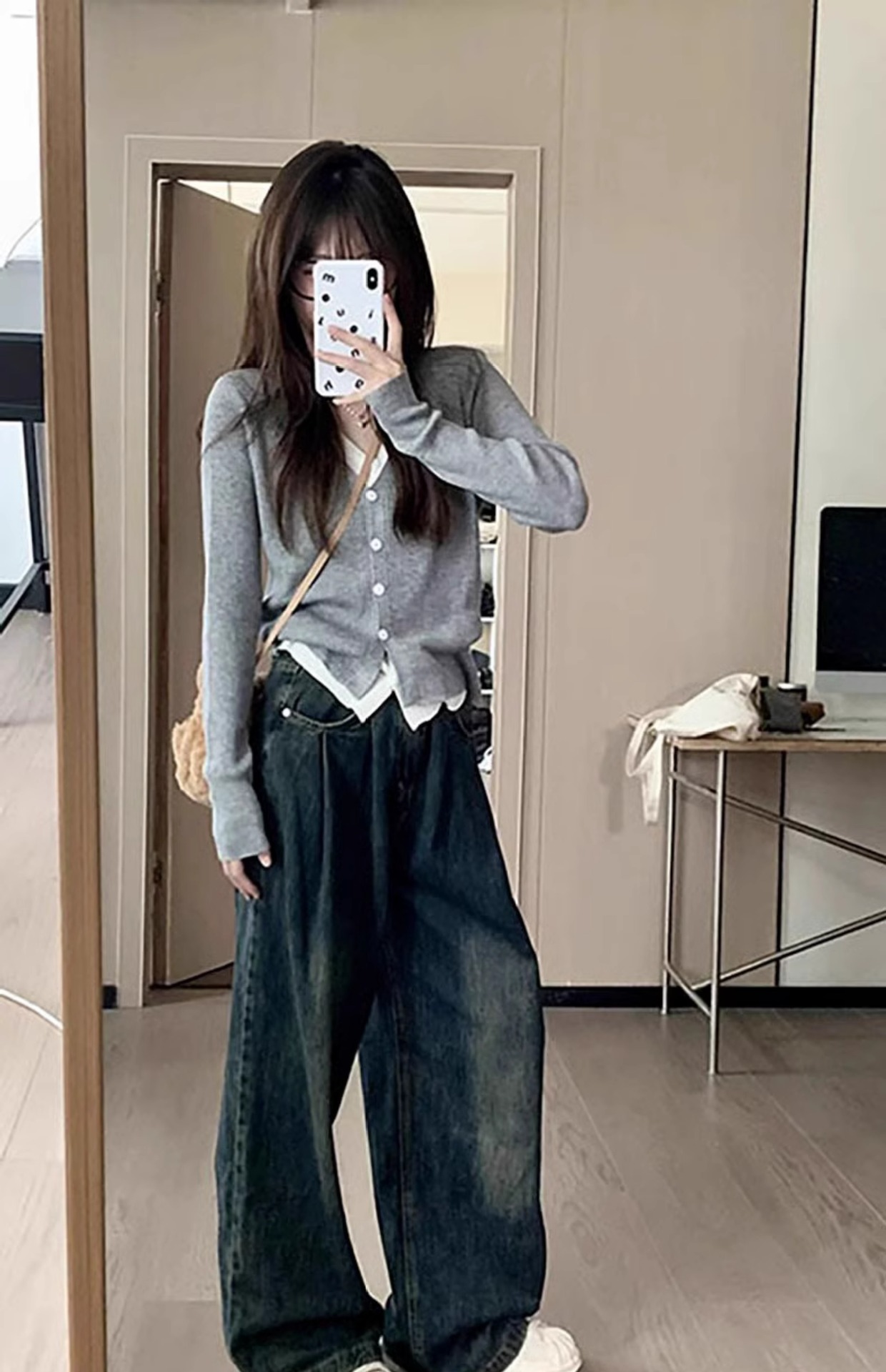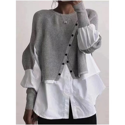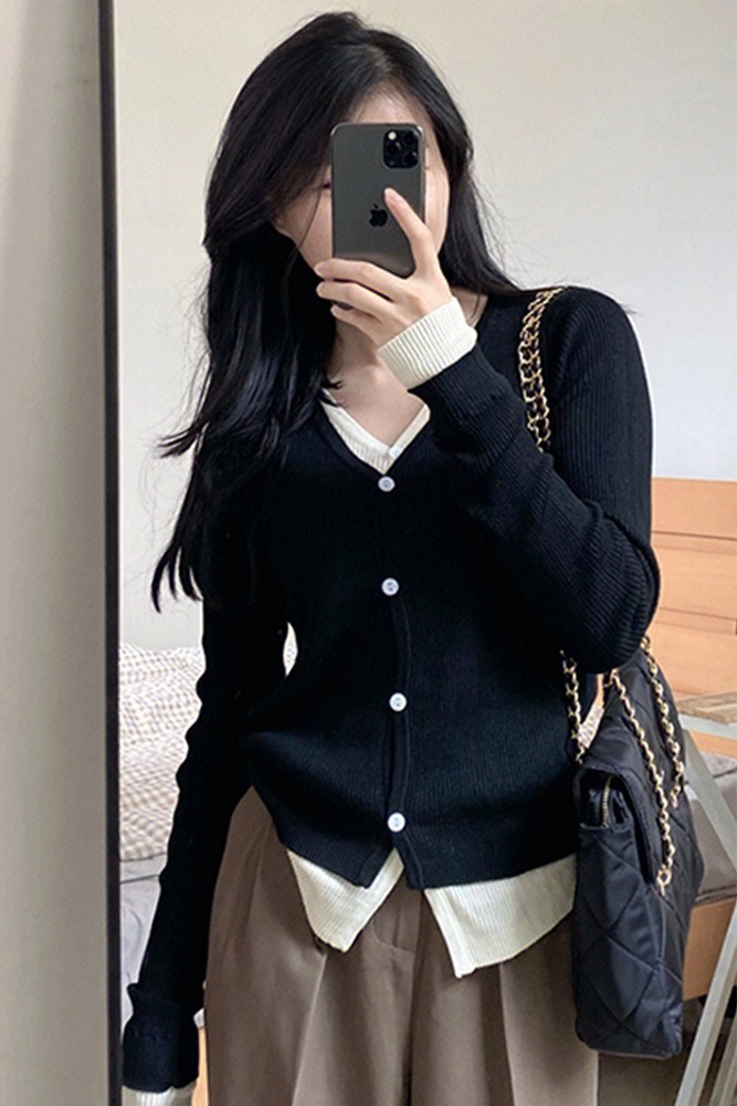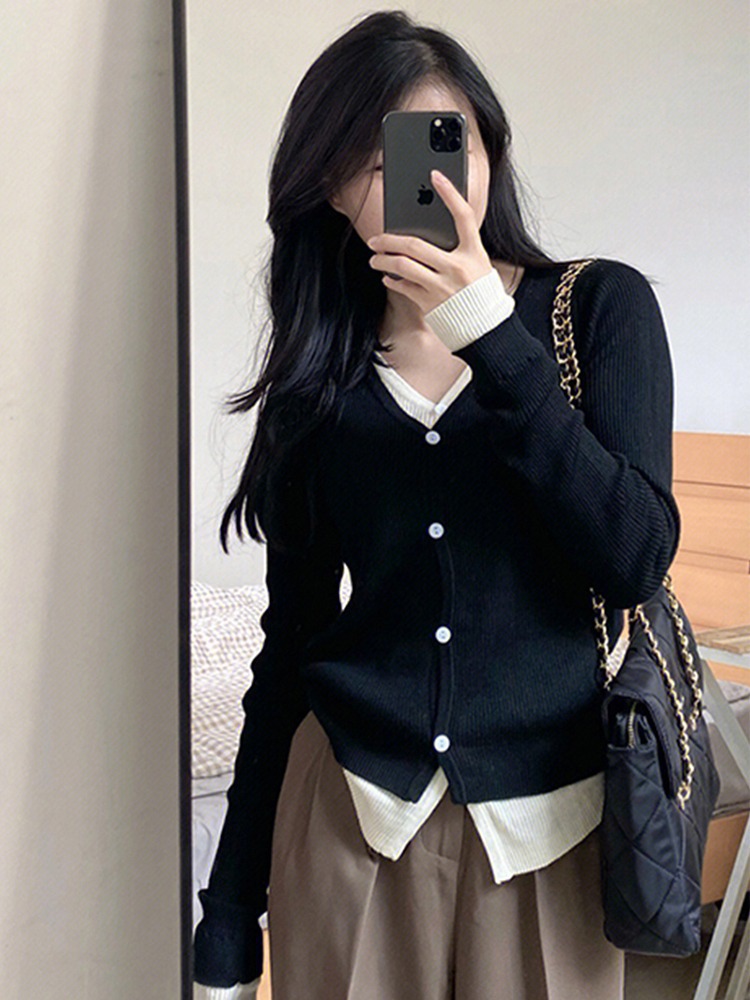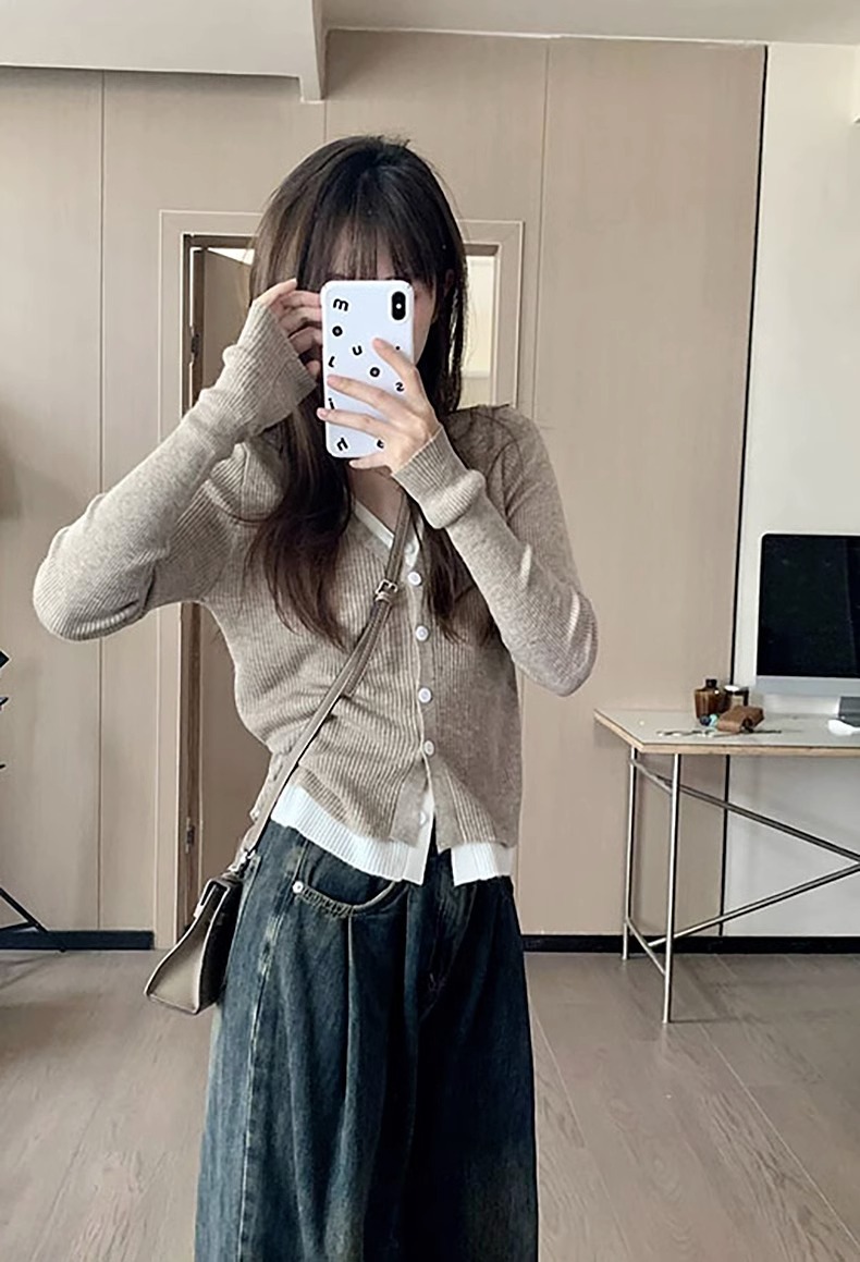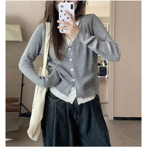 그레이 V 넥 페이크 투피스 니트 카디건 여성 2024 봄 새로운 디자인 센스 틈새 의상 세련된 탑스토어 가기
