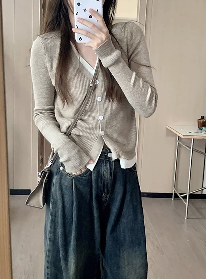 그레이 V 넥 페이크 투피스 니트 카디건 여성 2024 봄 새로운 디자인 센스 틈새 의상 세련된 탑