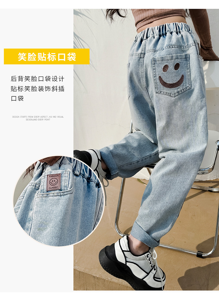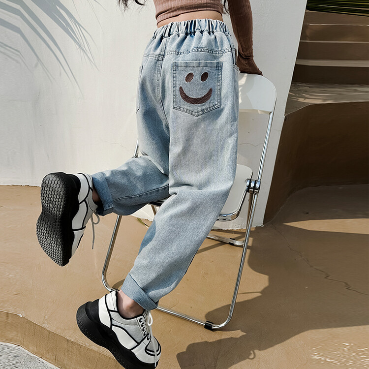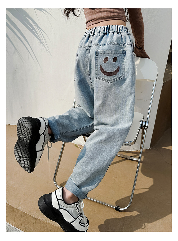 여성을위한 라이트 블루 웃는 스트레이트 와이드 레그 청바지 2024 봄 새로운 패션 스트레이트 하이 웨이스트 스마일리 청바지