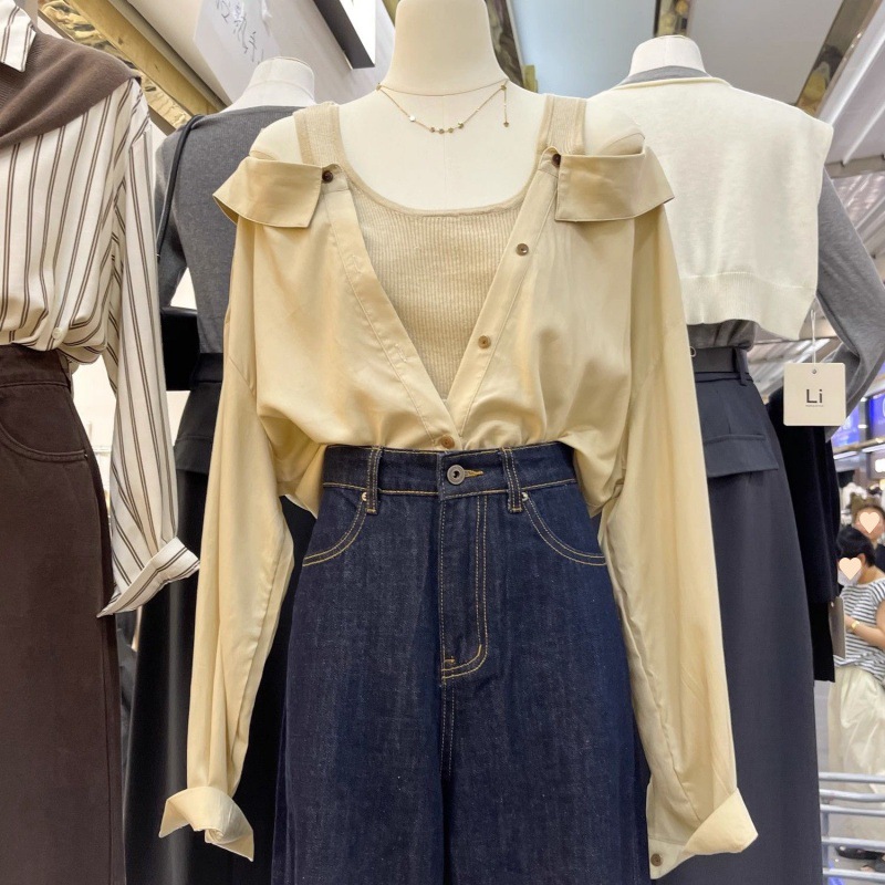 이른 가을 2023 새로운 한국 스타일 디자인 센스 니쉬 셔츠 여성용 어깨 니트 조끼 바느질 가짜 투피스 탑스토어 가기