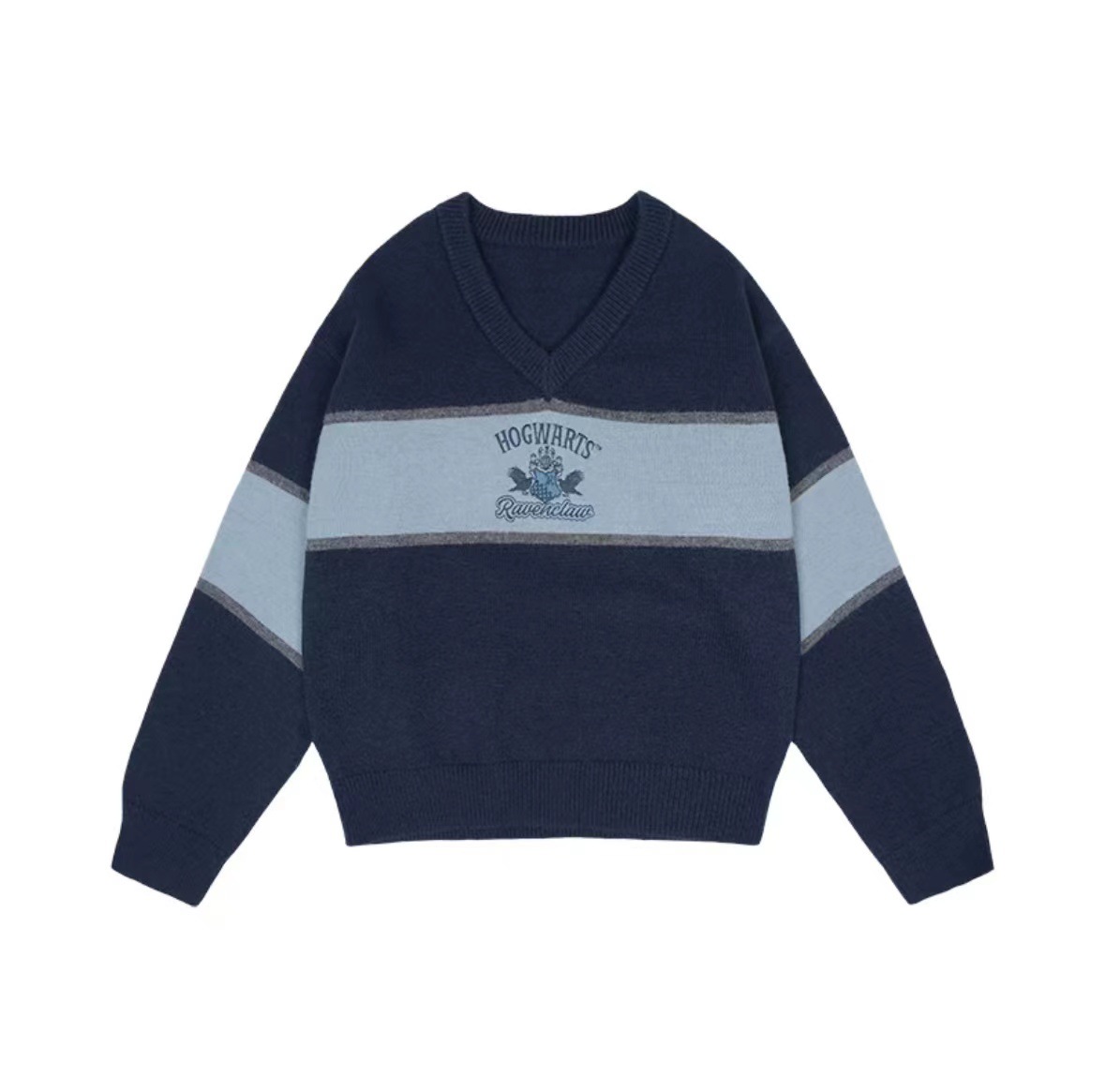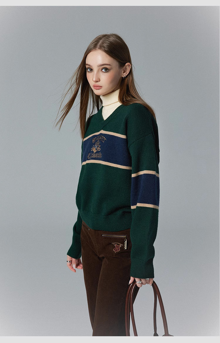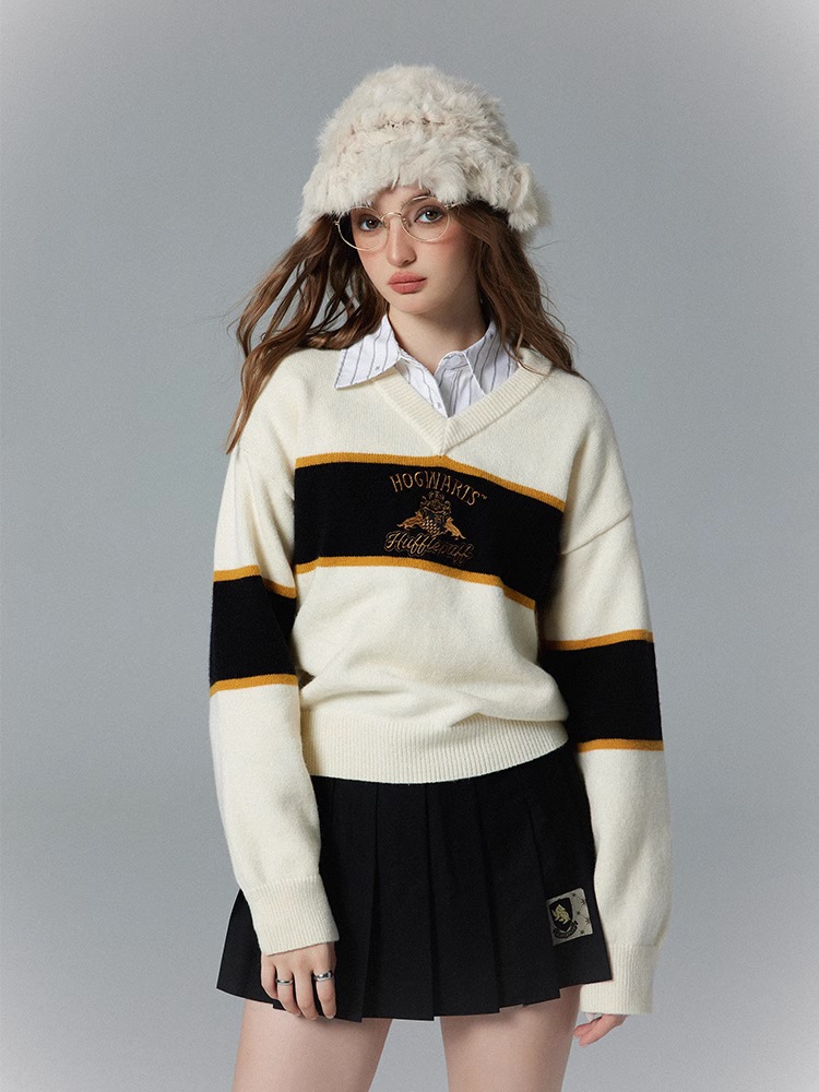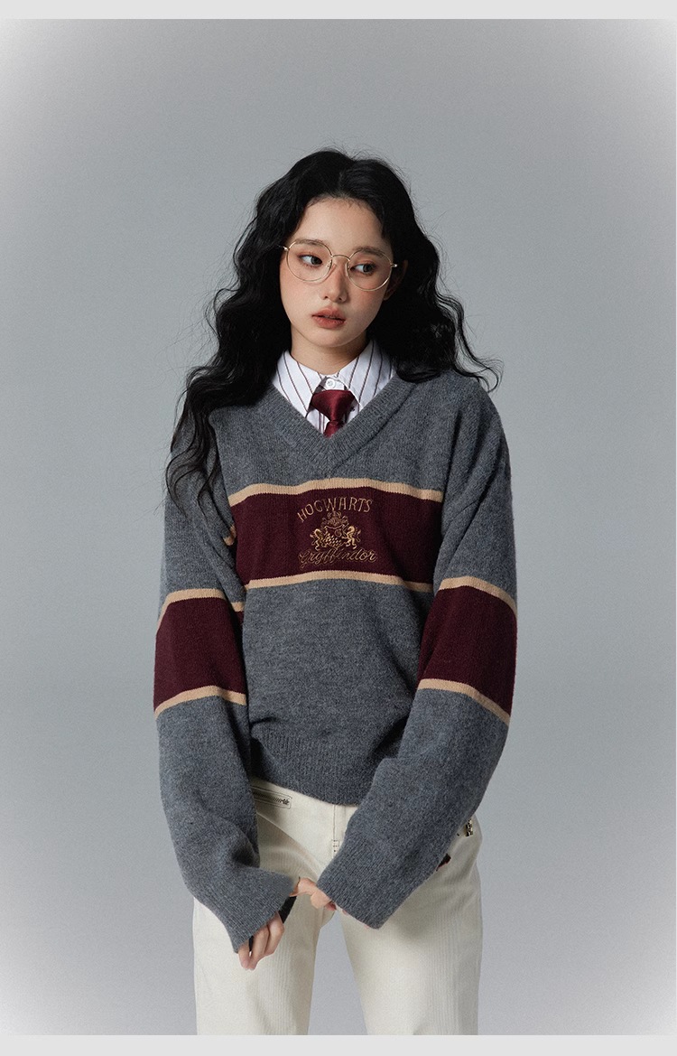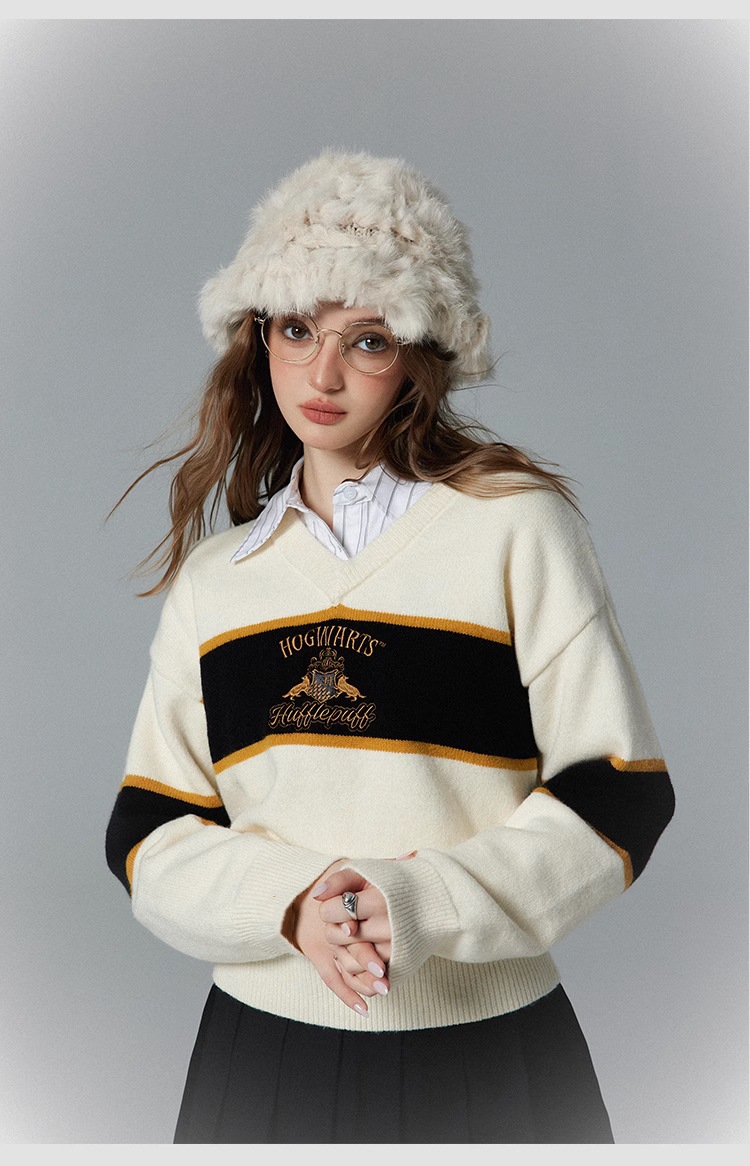 2024 봄과 가을 새로운 해리포터 자수 스트라이프 콘트라스트 컬러 스웨터 여성용 V 넥 스위트 올 매치 탑