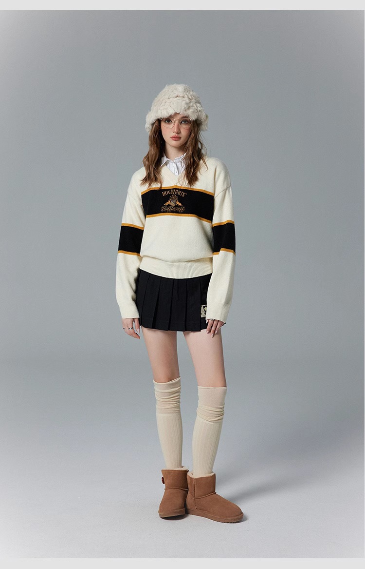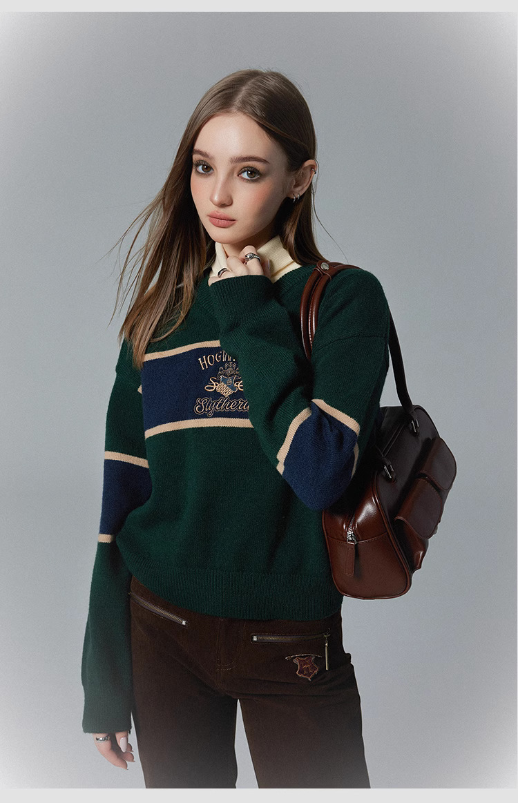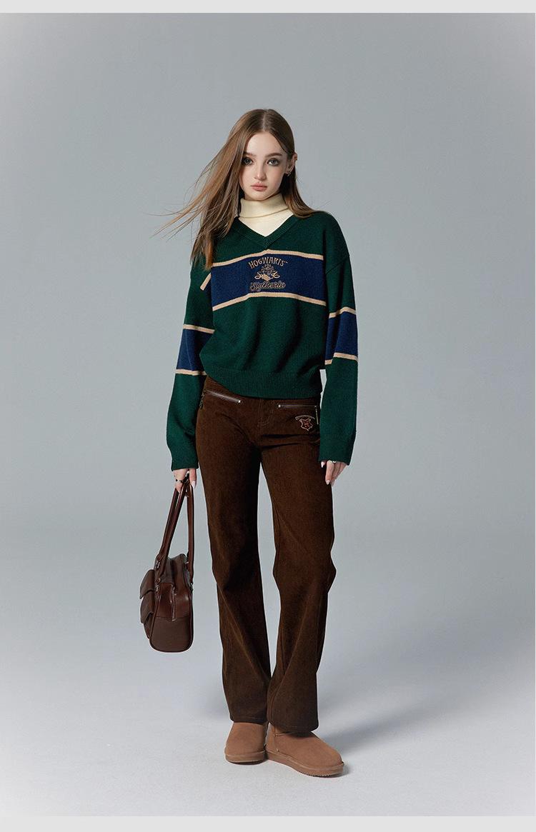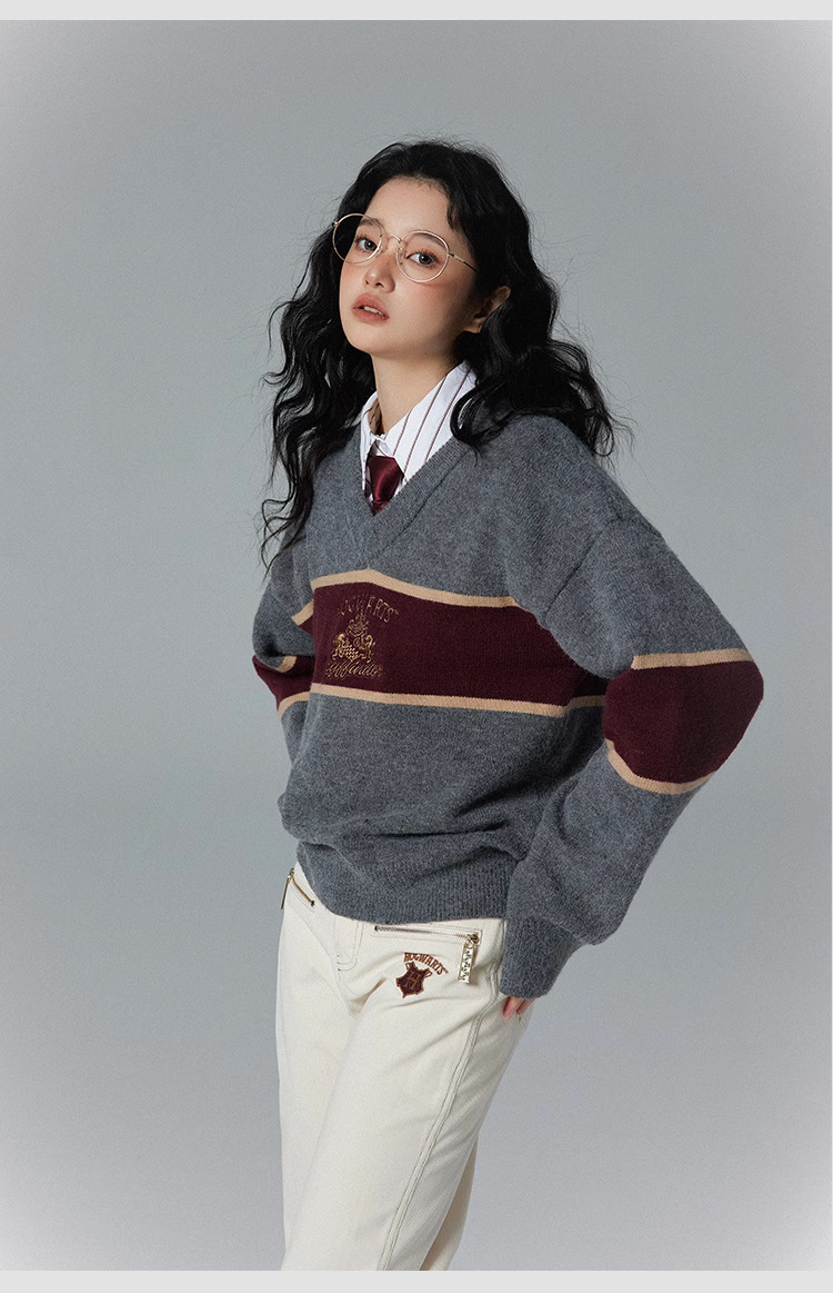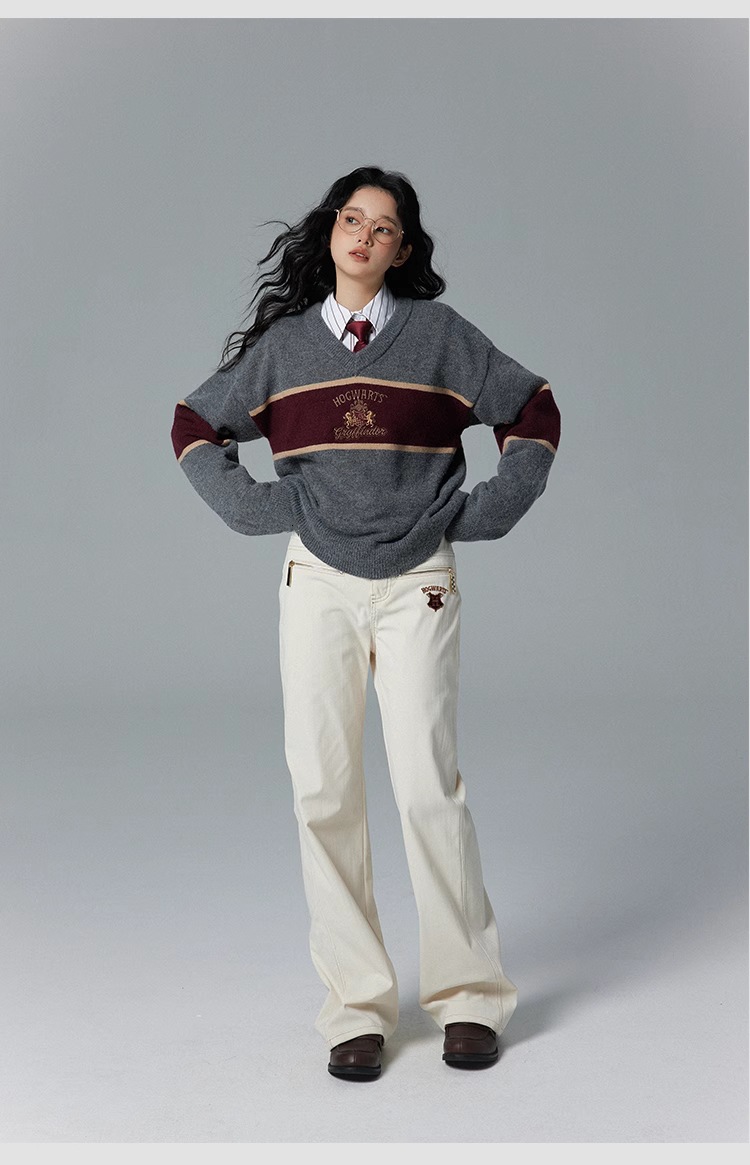 2024 봄과 가을 새로운 해리포터 자수 스트라이프 콘트라스트 컬러 스웨터 여성용 V 넥 스위트 올 매치 탑