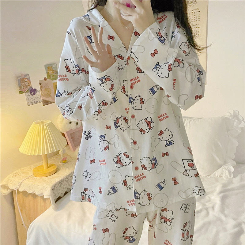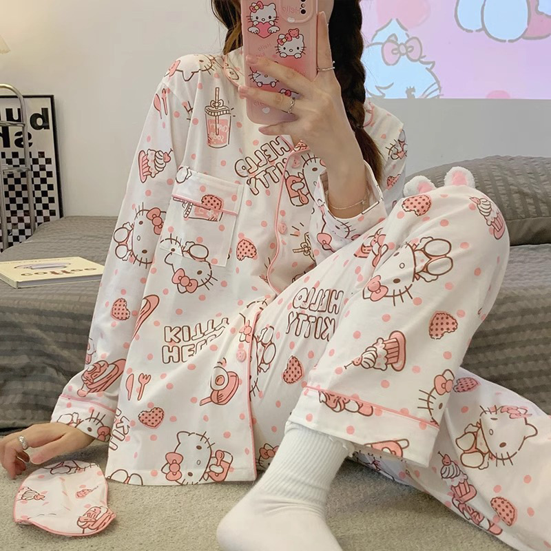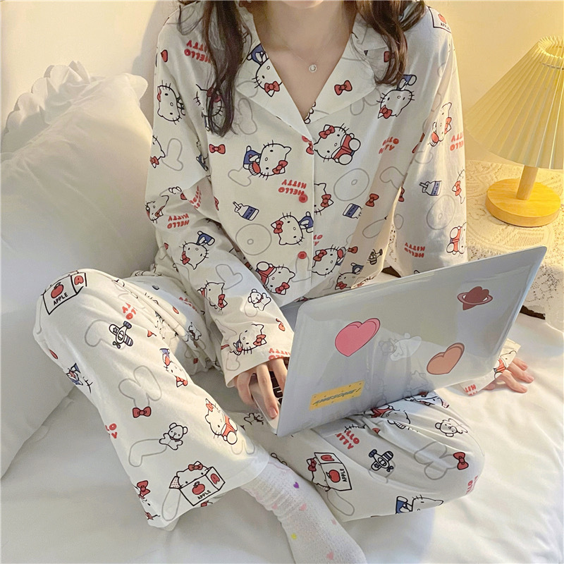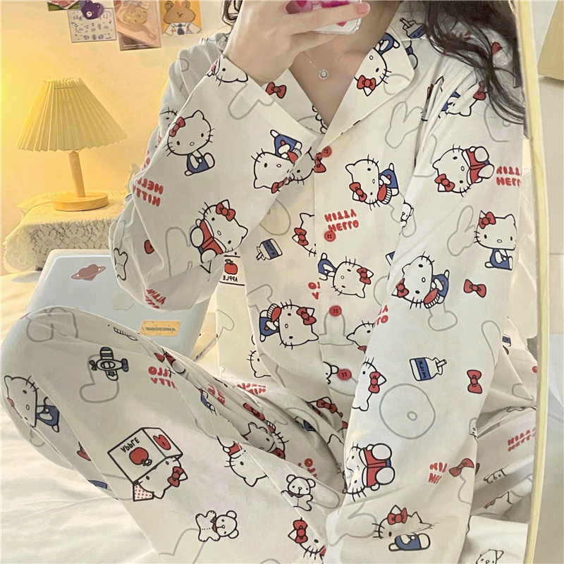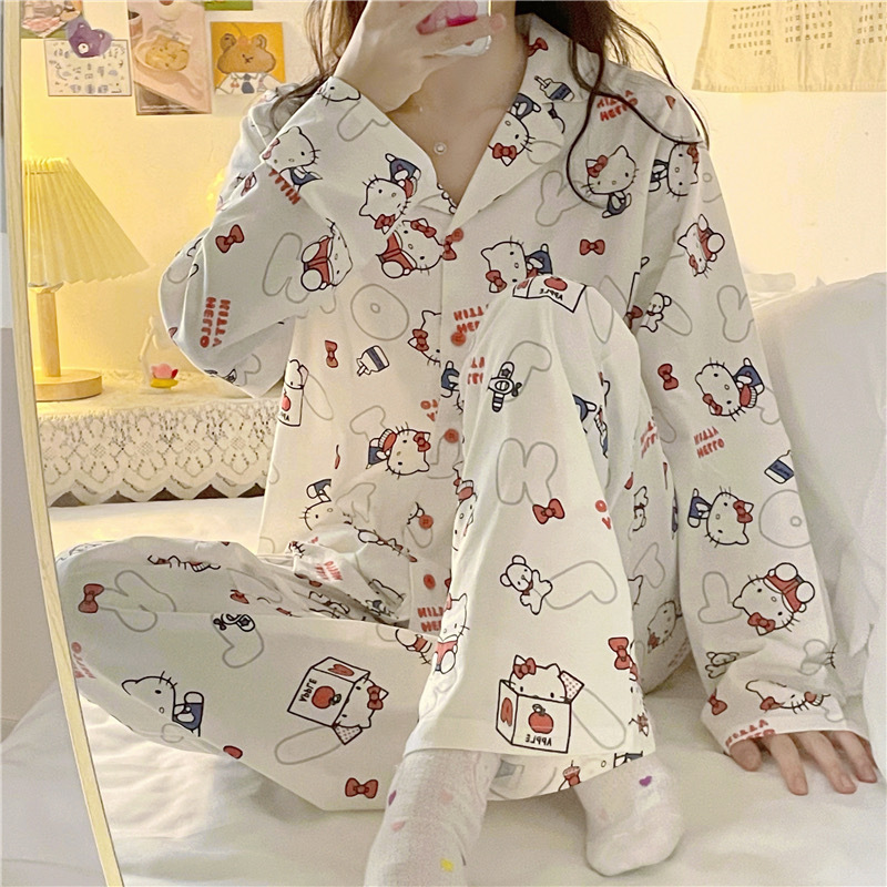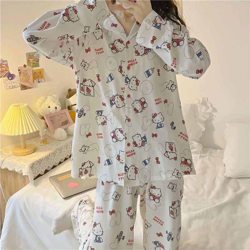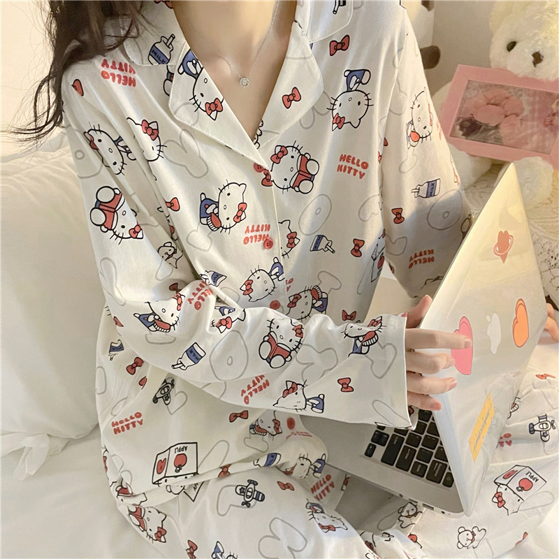 여성을위한 국경 간 ins 스타일 달콤한 헬로 키티 잠옷 봄, 가을 만화 긴팔 바지 홈웨어 세트 드롭 배송스토어 가기