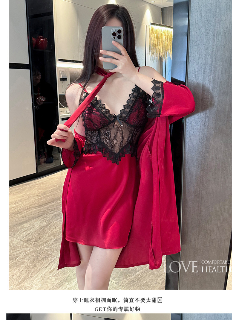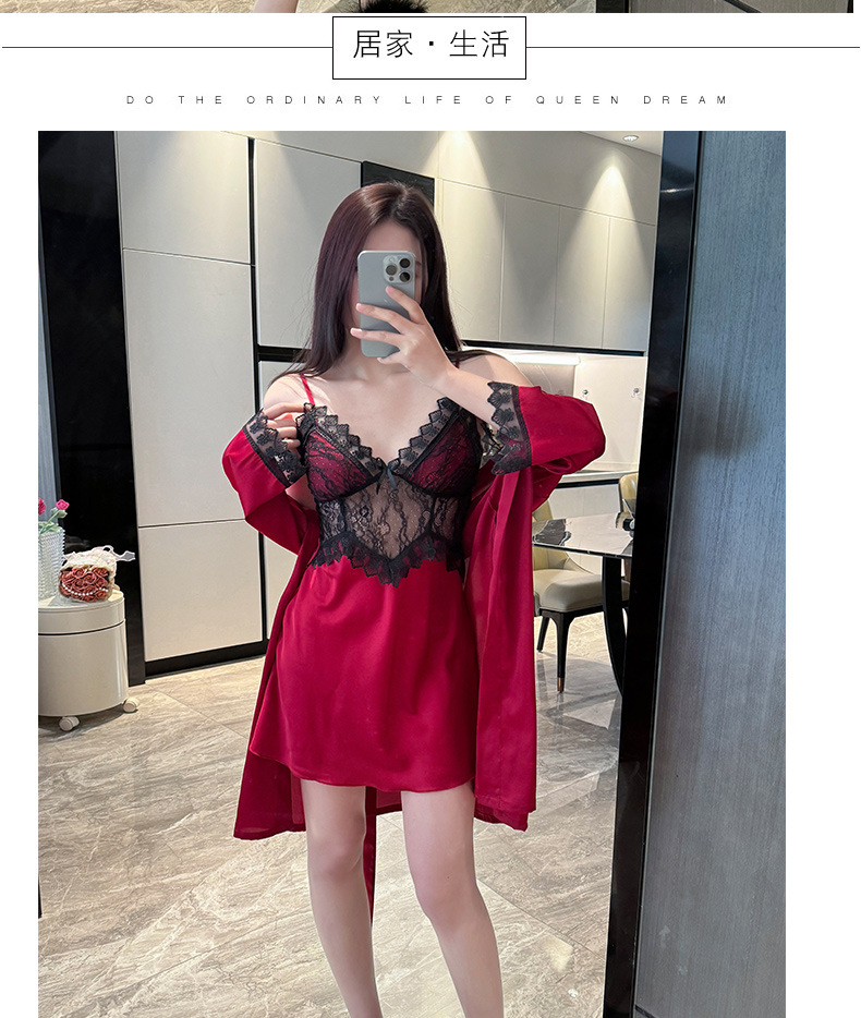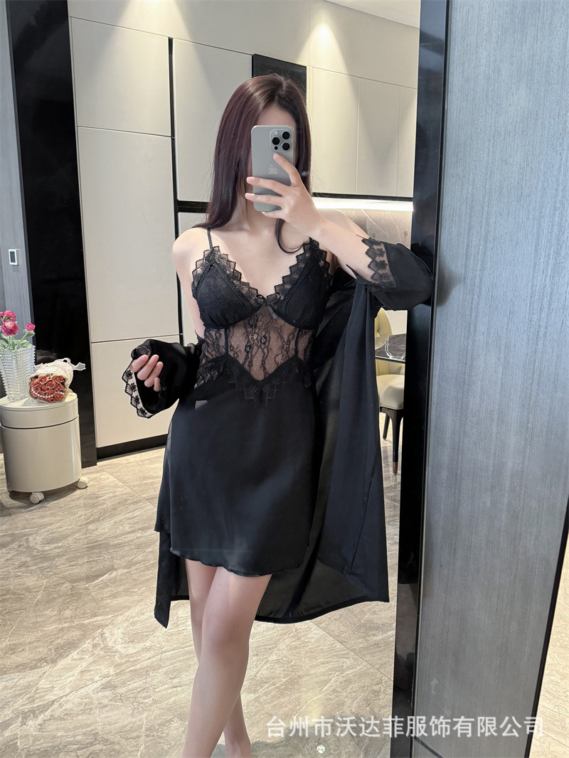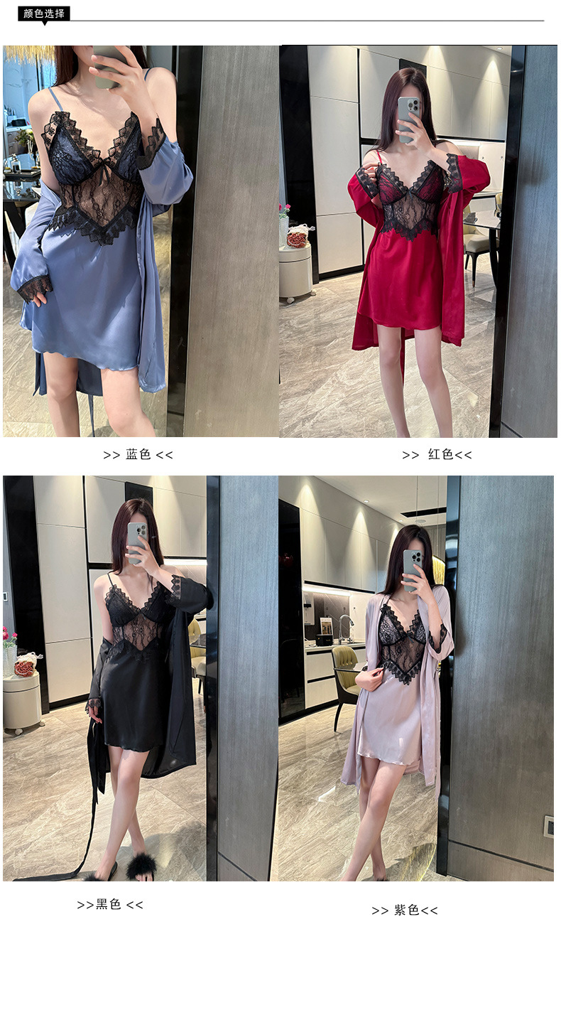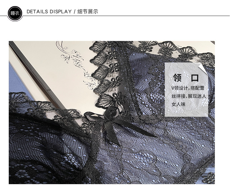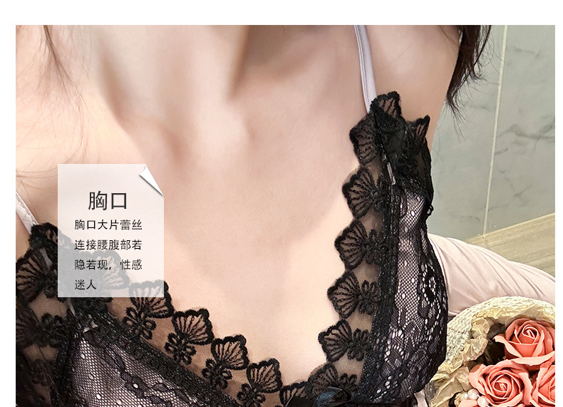 섹시한 순수한 정욕 스타일 봄과 여름 얇은 얼음 실크 잠옷 유방 패드 유혹 서스펜더 깊은 v 넥 레이스 새틴 잠옷 여성을위한스토어 가기