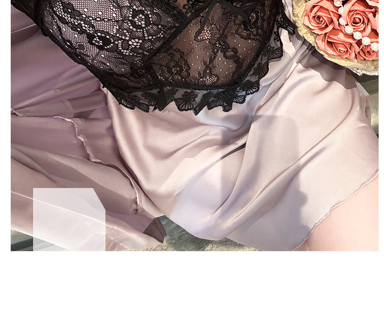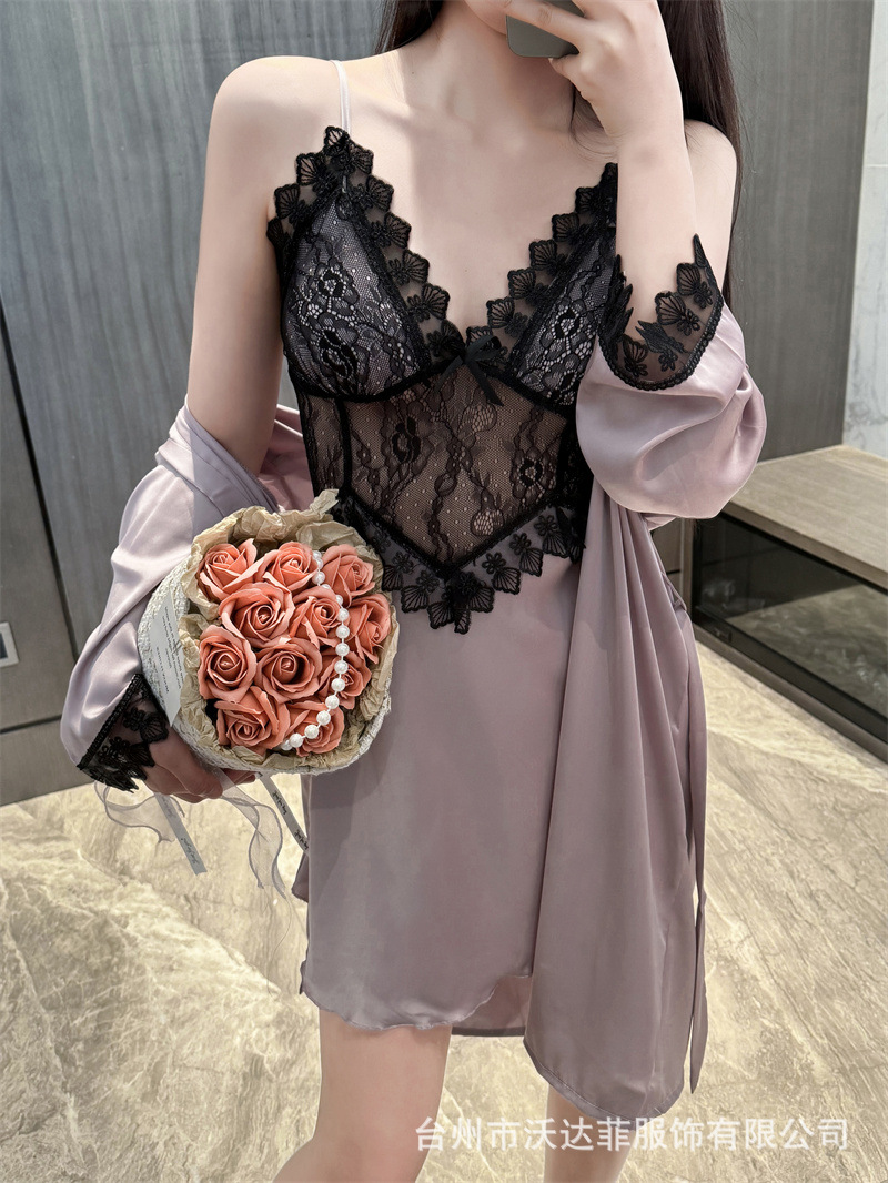 섹시한 순수한 정욕 스타일 봄과 여름 얇은 얼음 실크 잠옷 유방 패드 유혹 서스펜더 깊은 v 넥 레이스 새틴 잠옷 여성을위한